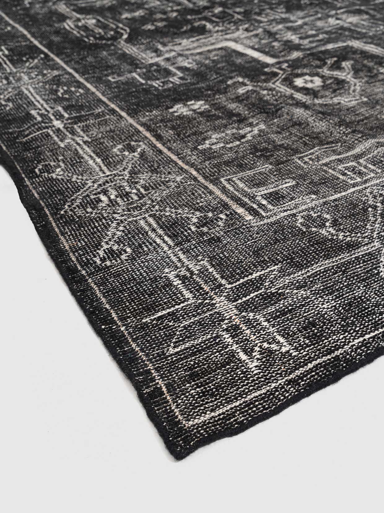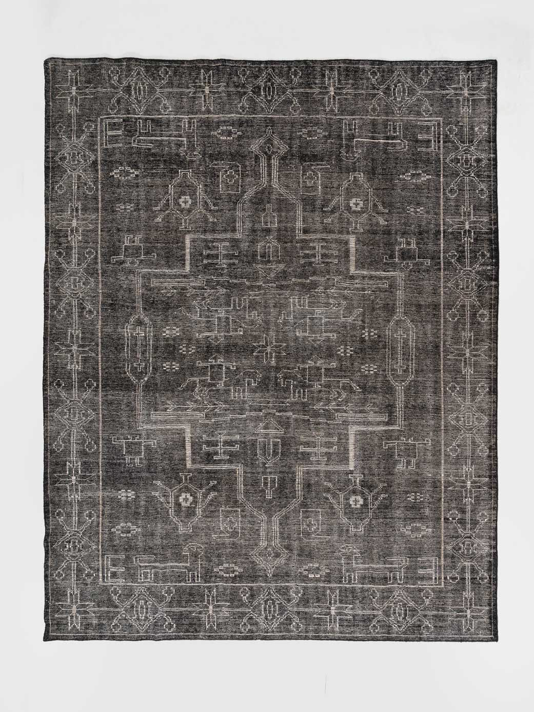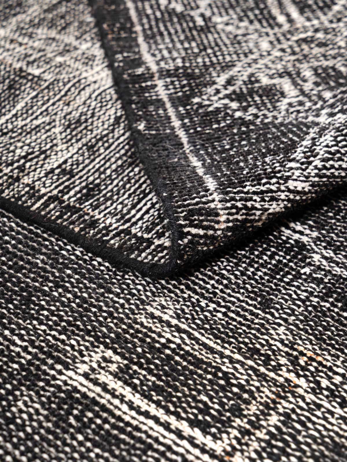 The Ocnita Rug is a hand-knotted wool masterpiece, presenting a mesmerizing array of tribal-inspired patterns in monochrome shades. This striking design adds a powerful visual statement to any space, perfectly blending with both contemporary and traditional decors. Ideal for those seeking a bold yet sophisticated centerpiece for their room.