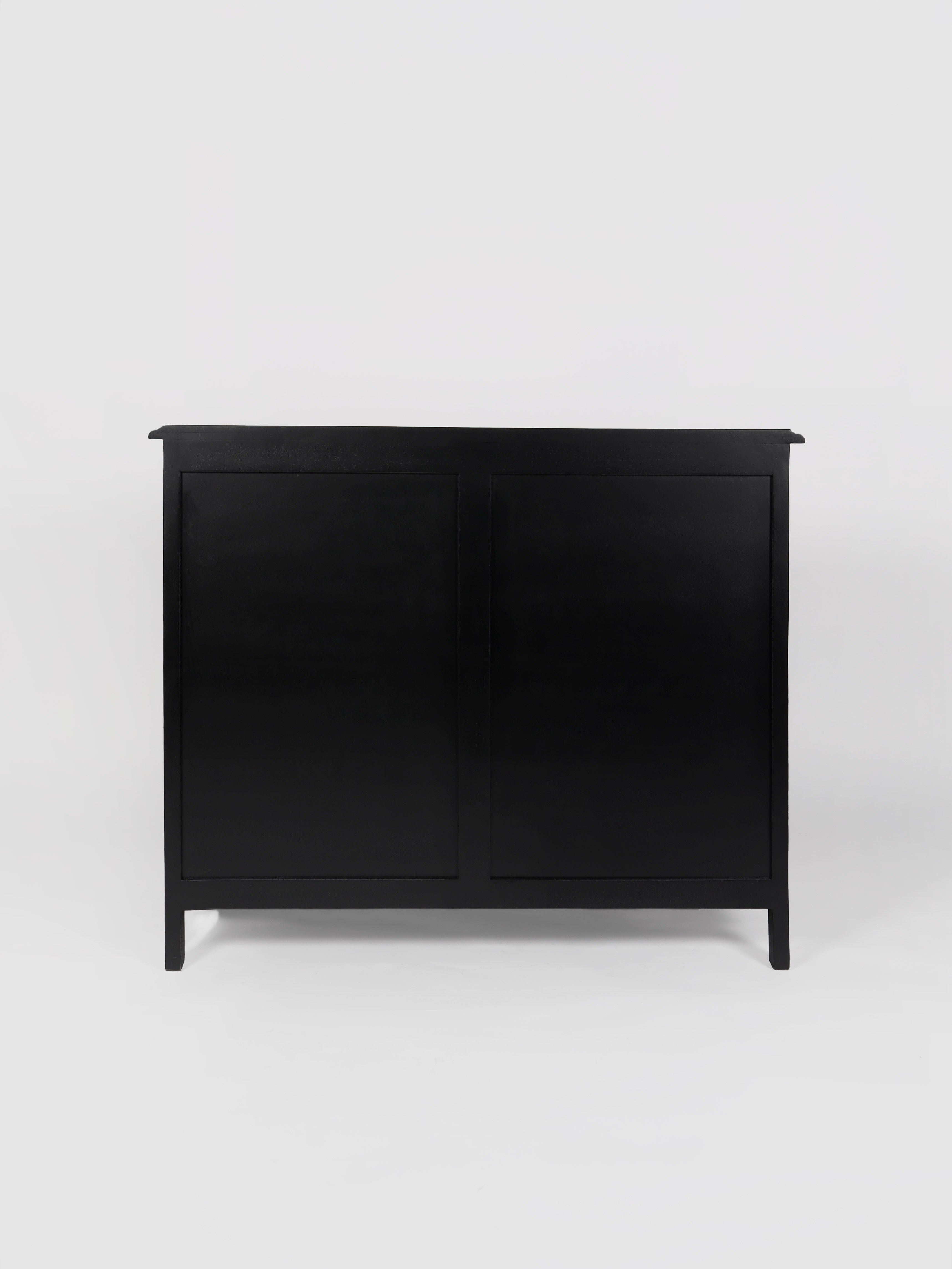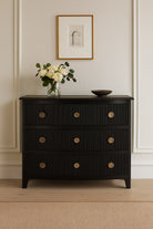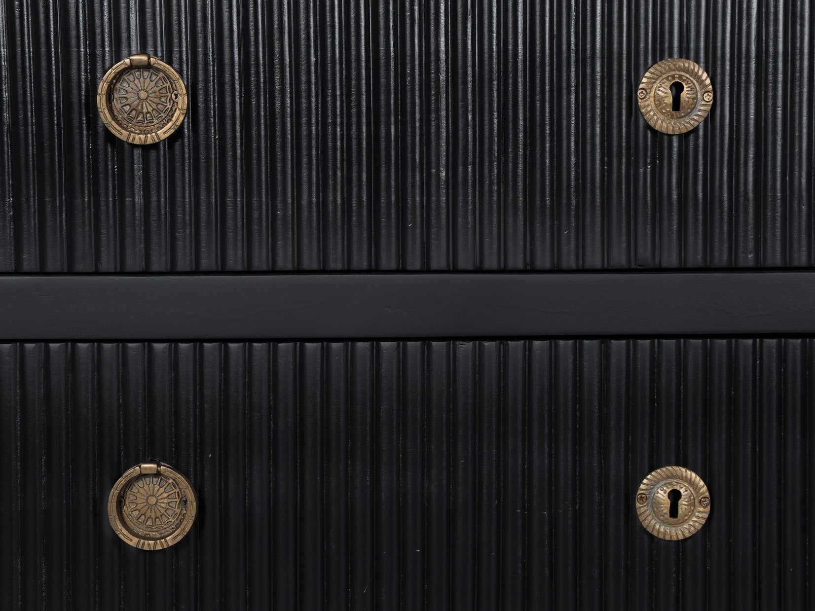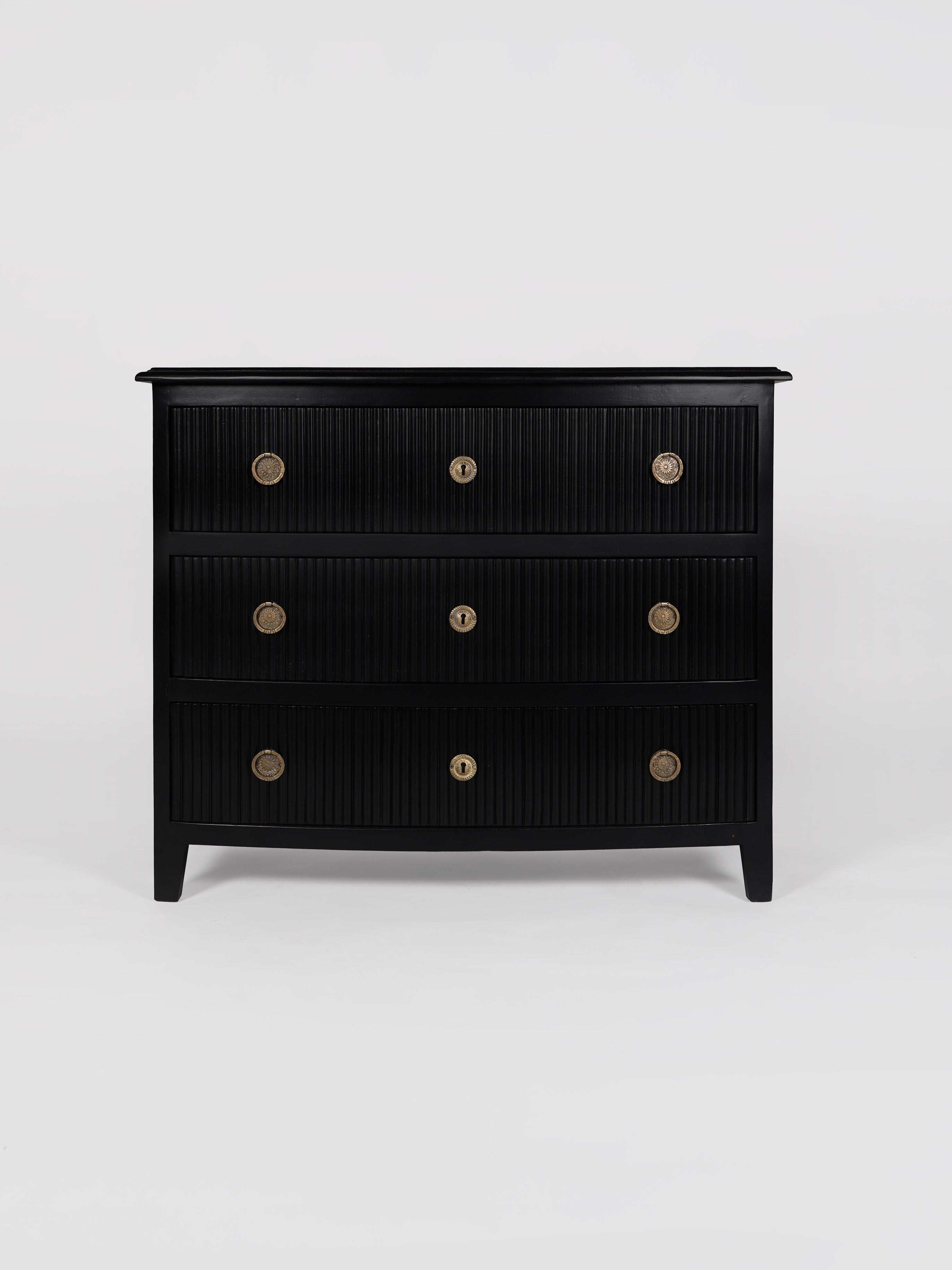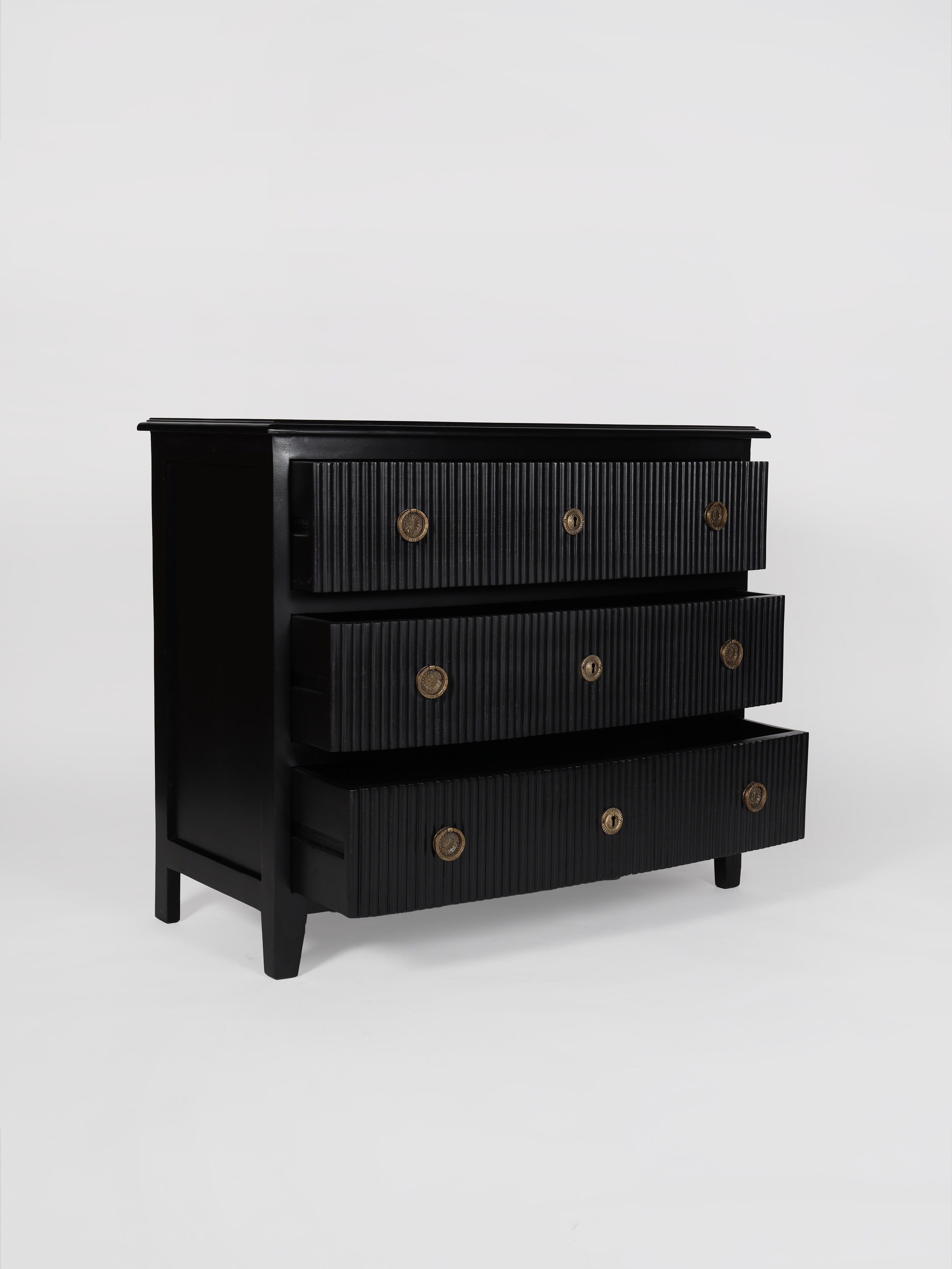 Sleek, modern, and timeless, this black Valbonne Wooden Chest of Drawers exudes understated elegance. The ribbed front design paired with round brass knobs creates a perfect blend of texture and sophistication. With three spacious drawers, it offers both functionality and refined style, making it an ideal addition to bedrooms, hallways, or living spaces. A statement piece that enhances interiors with effortless charm and versatile storage.