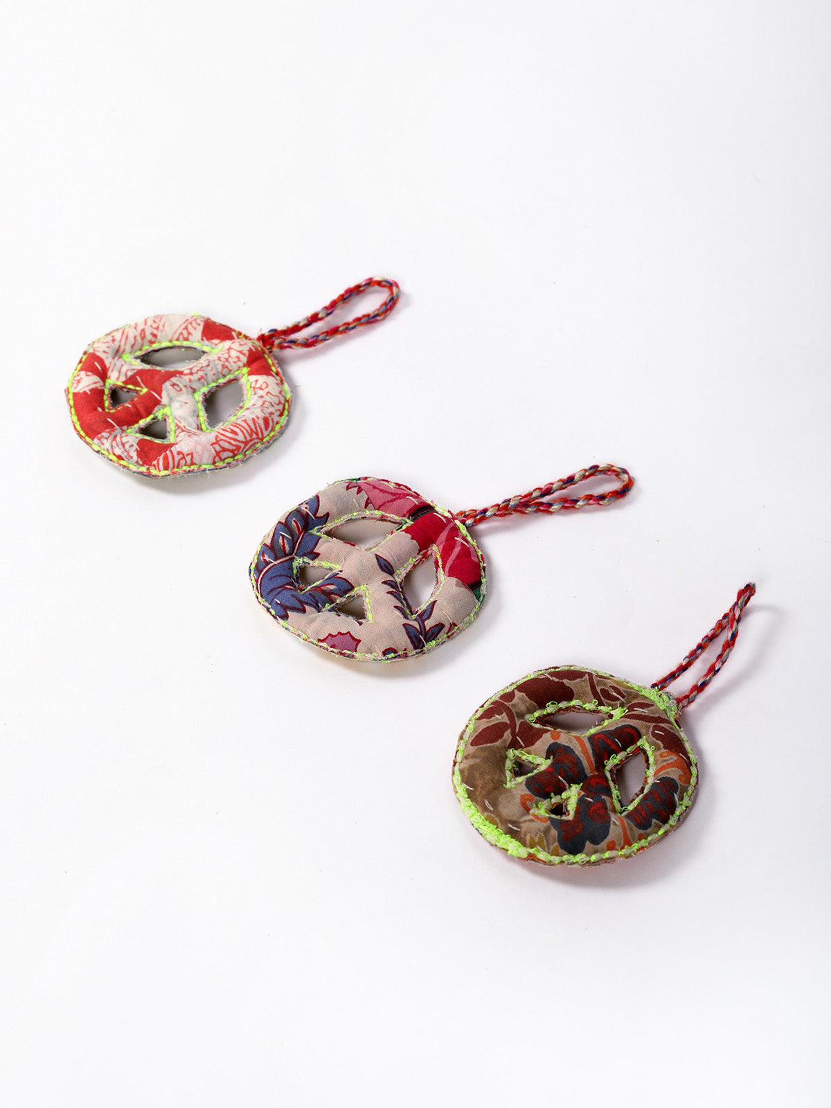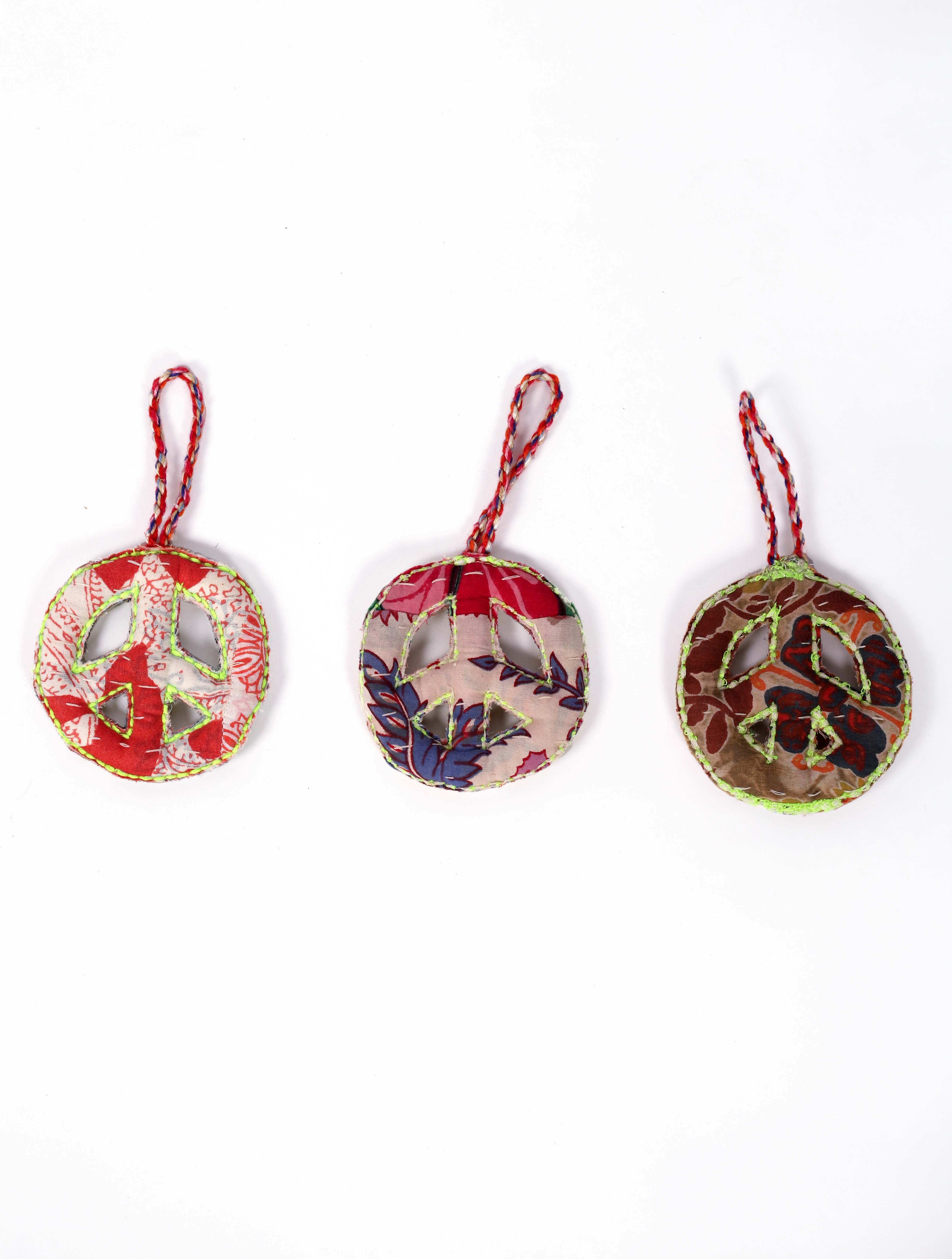 A symbol of love and unity, crafted with care. These peace sign ornaments are handmade using layered upcycled fabrics in vibrant, eclectic prints. Light, playful, and full of character, they’re perfect for hanging on trees, windows, or gifting with meaning. Each piece is unique – just like peace should be.
