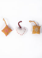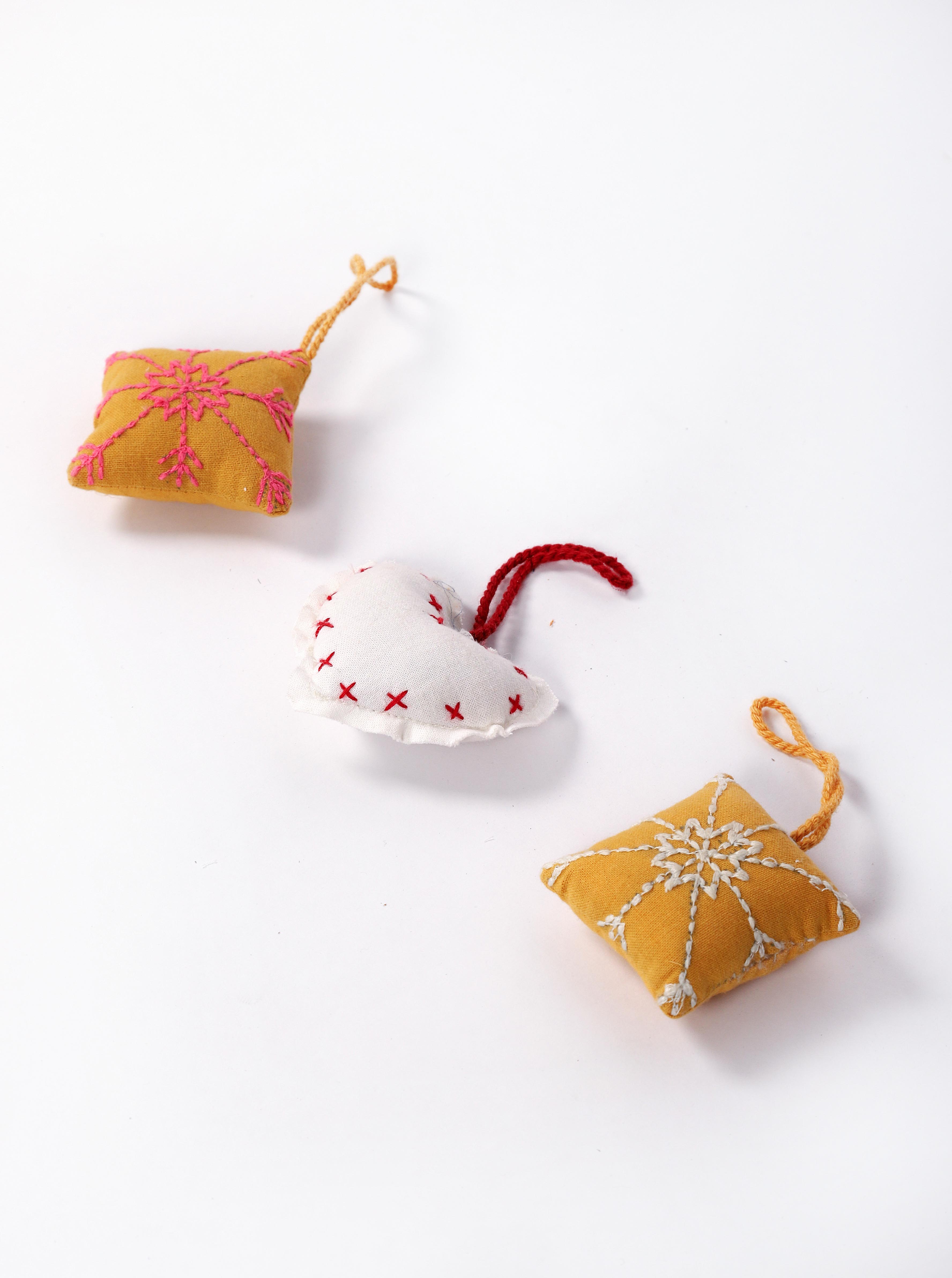 A soft touch of tradition for your festive decor. This trio includes a heart and two cushion-shaped ornaments, hand-stitched in cheerful threadwork with simple yet striking motifs. Made from leftover fabric and finished with yarn loops, they’re sustainable, sentimental, and full of character. Perfect for trees, gifts, or windows.