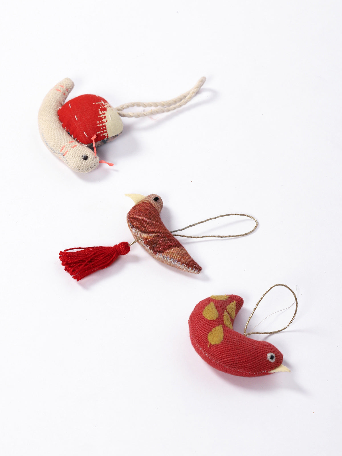A charming trio of bird and snail ornaments, lovingly handcrafted using upcycled fabrics. With detailed stitching, cheerful colors, and playful forms, they bring a touch of whimsy to any festive décor. Hang them on your Christmas tree, door knobs, or gift wraps for a cozy, handcrafted feel with a conscious twist.