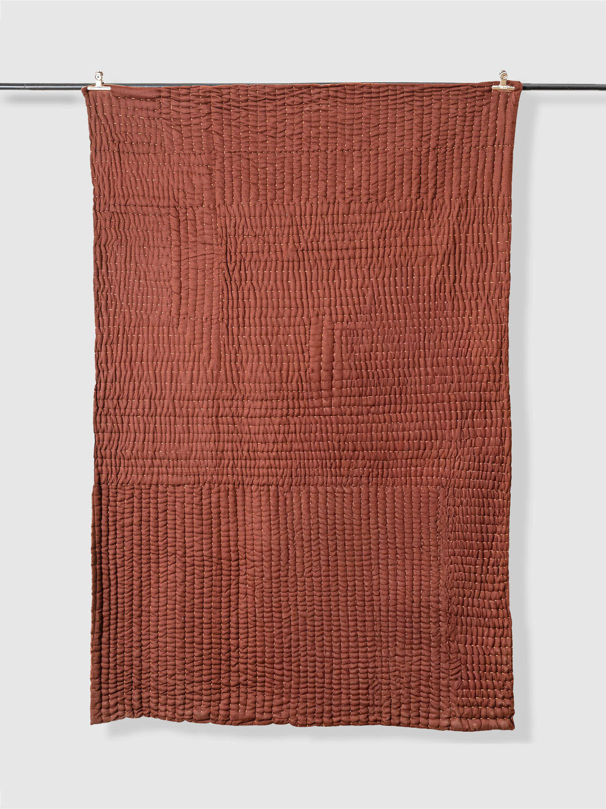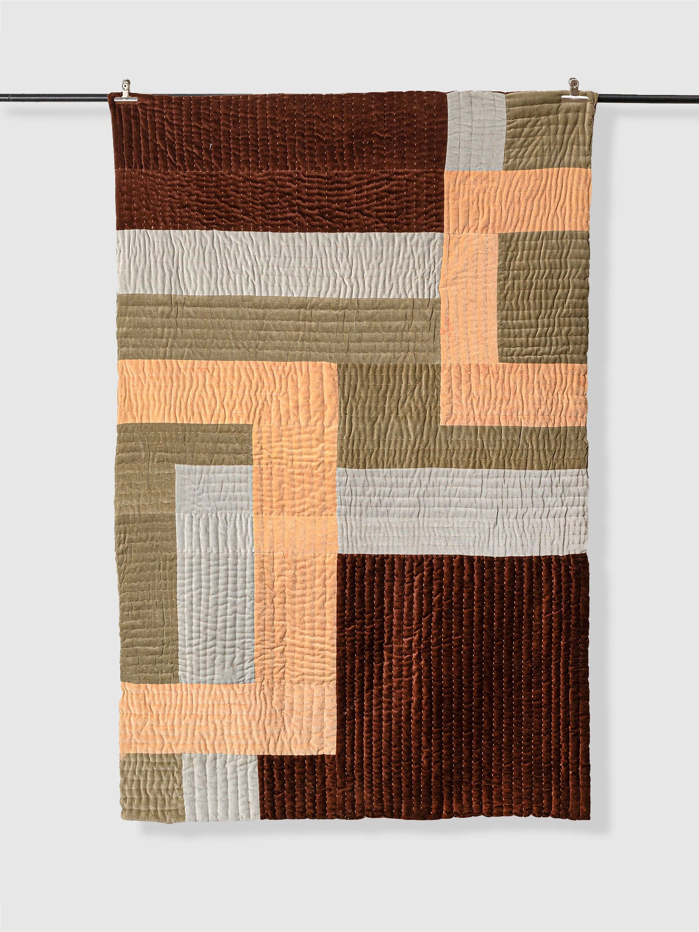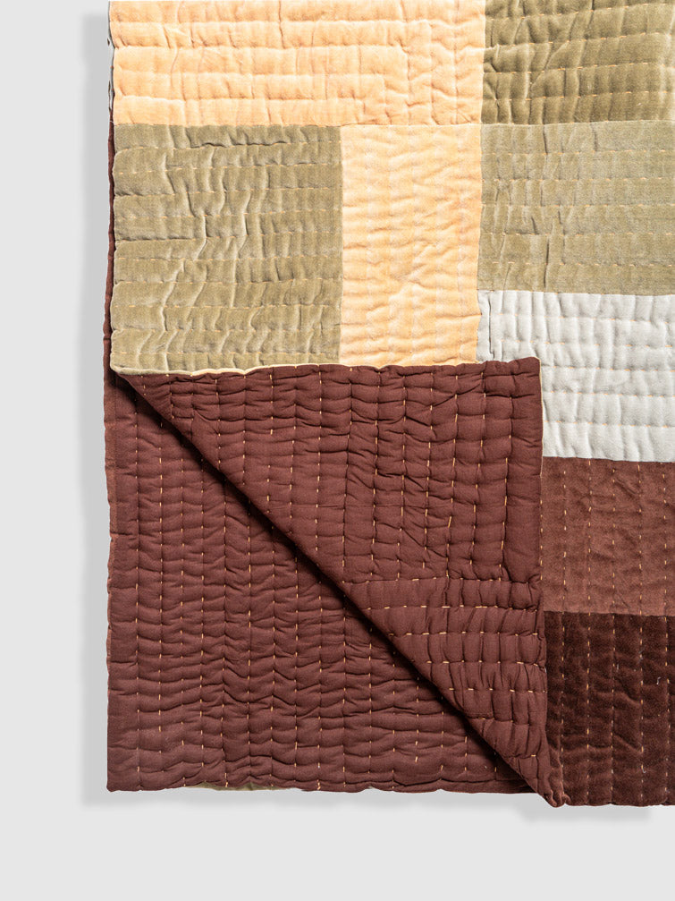 This quilt blends earthy hues—olive, rust, peach, and ivory—in a clean, modern block design. Its hand-quilted velvet texture offers a luxurious feel, perfect as a bedspread or living room throw. This unique patchwork quilt enhances rustic and contemporary decor alike with warmth and elegance.