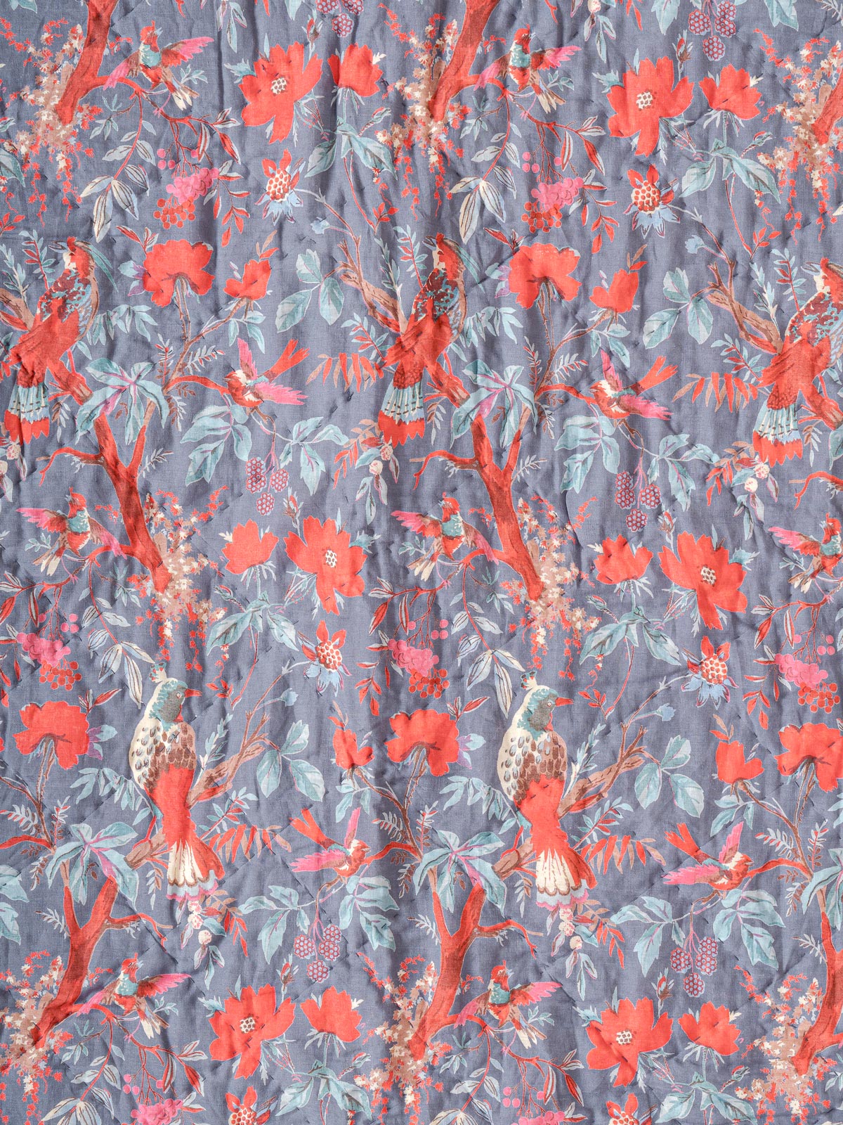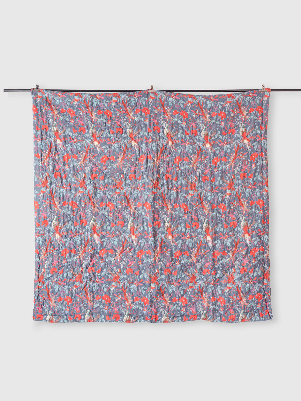 The Coral Mist Printed Quilt brings a dreamy, atmospheric charm to your bedroom with its beautifully blended tones and delicate floral accents. Soft washes of grey and muted blue form the background, while coral-red blossoms scatter across the surface, creating a gentle contrast that feels both soothing and lively. The overall effect is misty, elegant and subtly romantic.