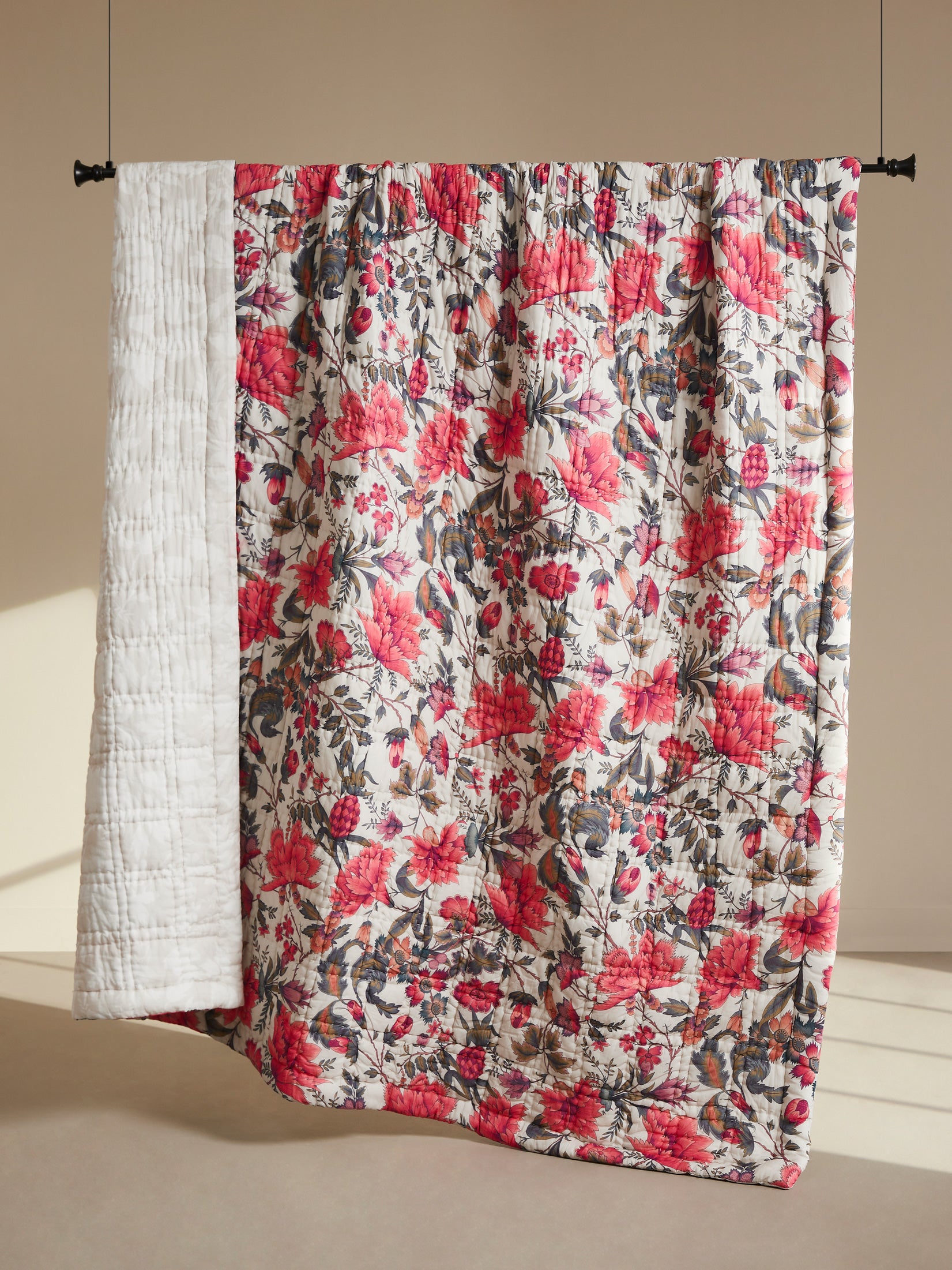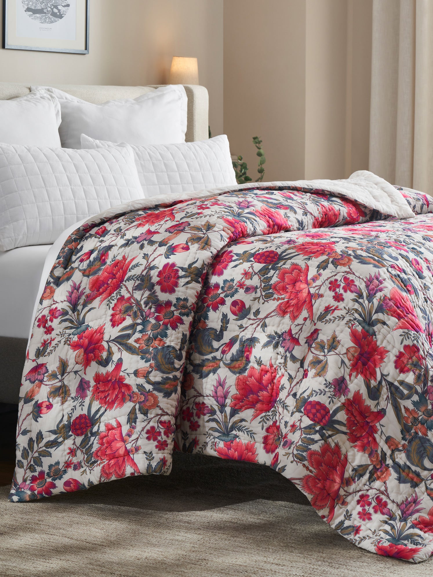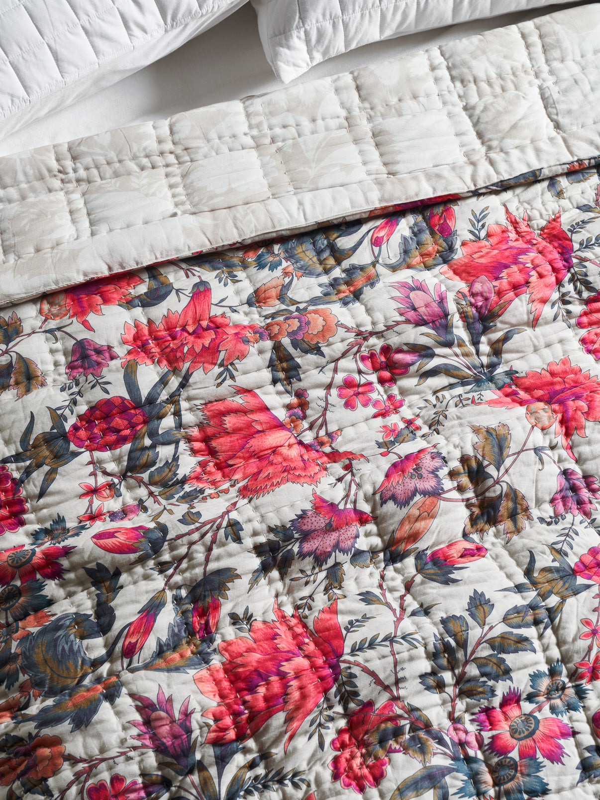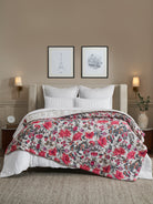 One side features a vibrant bloomscape in rich pinks, soft greens, and earthy undertones, creating a lively yet elegant presence on your bed. The reverse shifts to a subtle, tone-on-tone floral pattern in a warm ivory base, perfect for days when you want a softer, minimal, and more serene look. Light, breathable, and beautifully quilted, it offers year-round comfort with a premium, textured hand-feel.