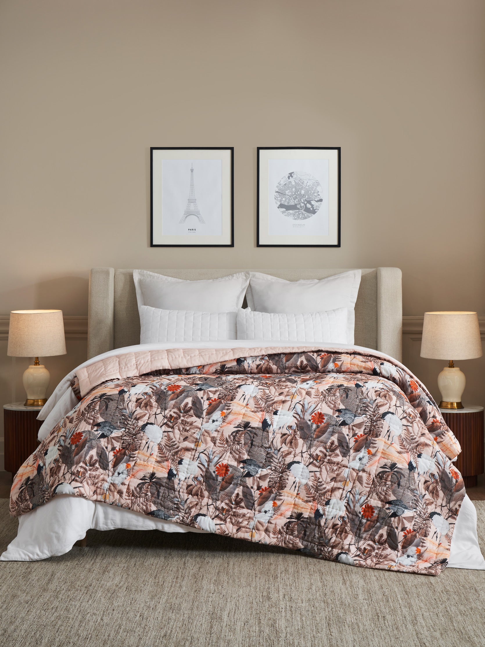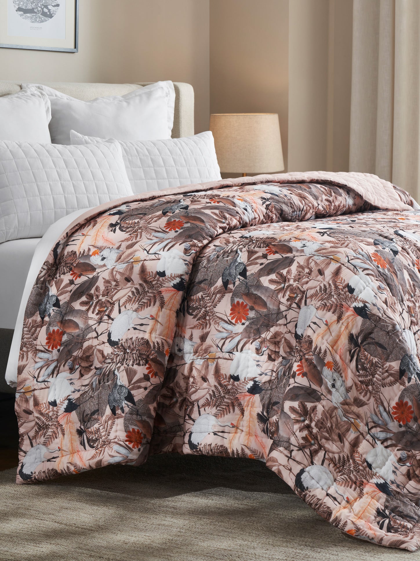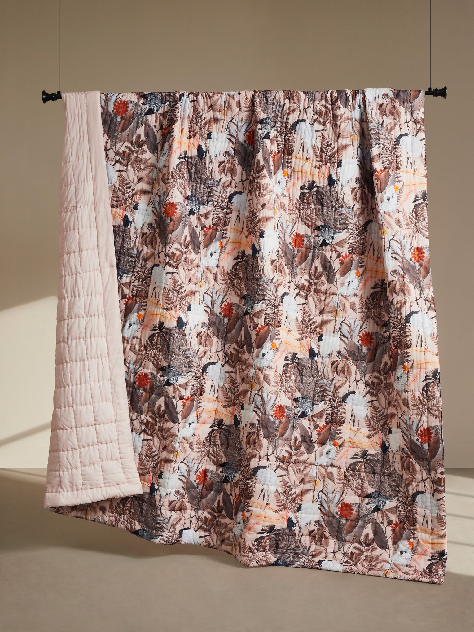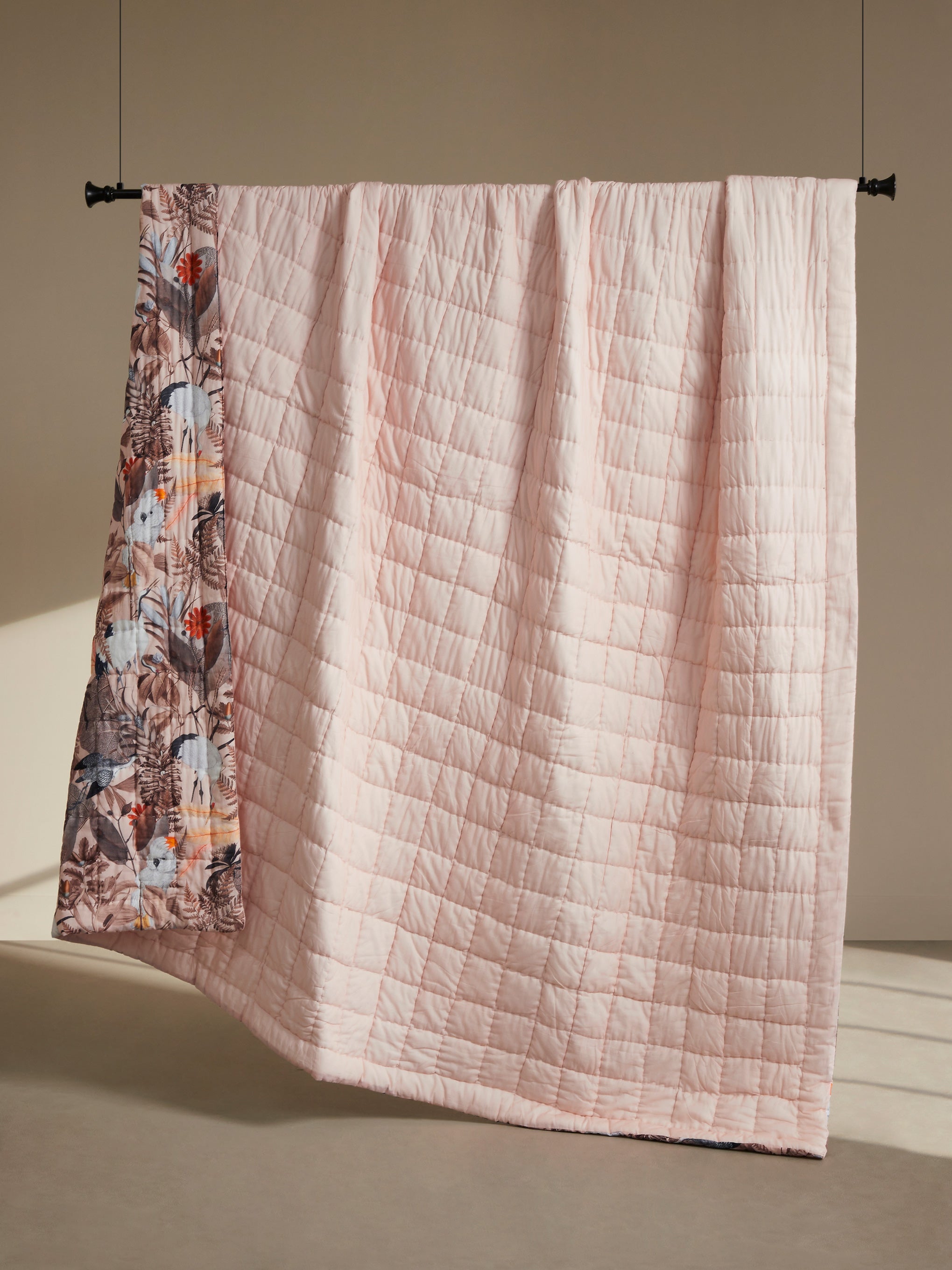 One side showcases a beautifully layered botanical pattern in muted blush, warm browns, and gentle neutrals, creating a calm yet expressive presence on your bed. The reverse shifts to a soft blush-pink solid, offering a minimal, serene look for days when you prefer simplicity and lightness. Soft, breathable, and richly textured through hand quilting, it promises year-round comfort with an elevated, heirloom-like finish.