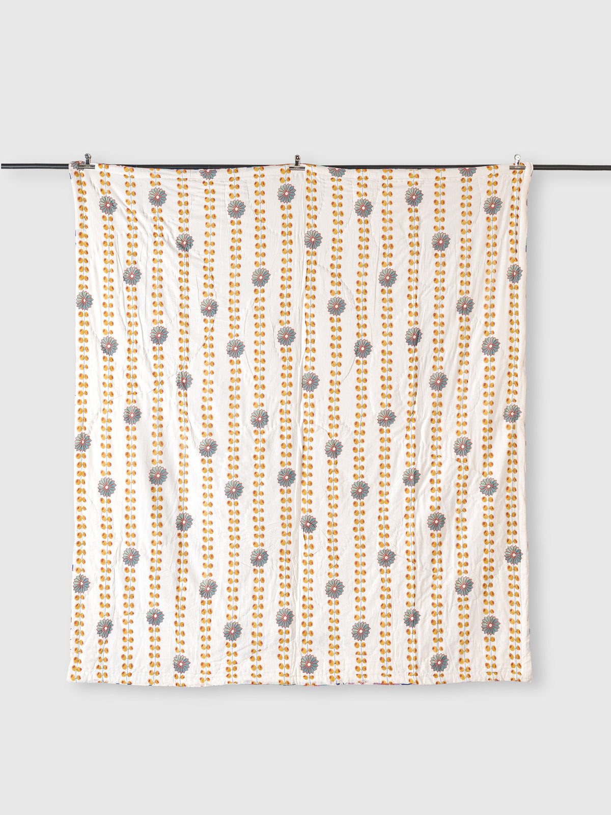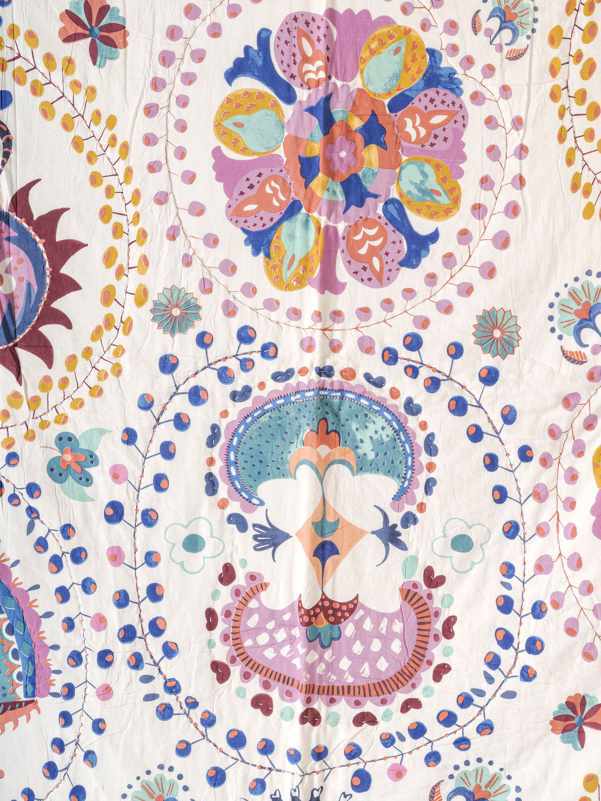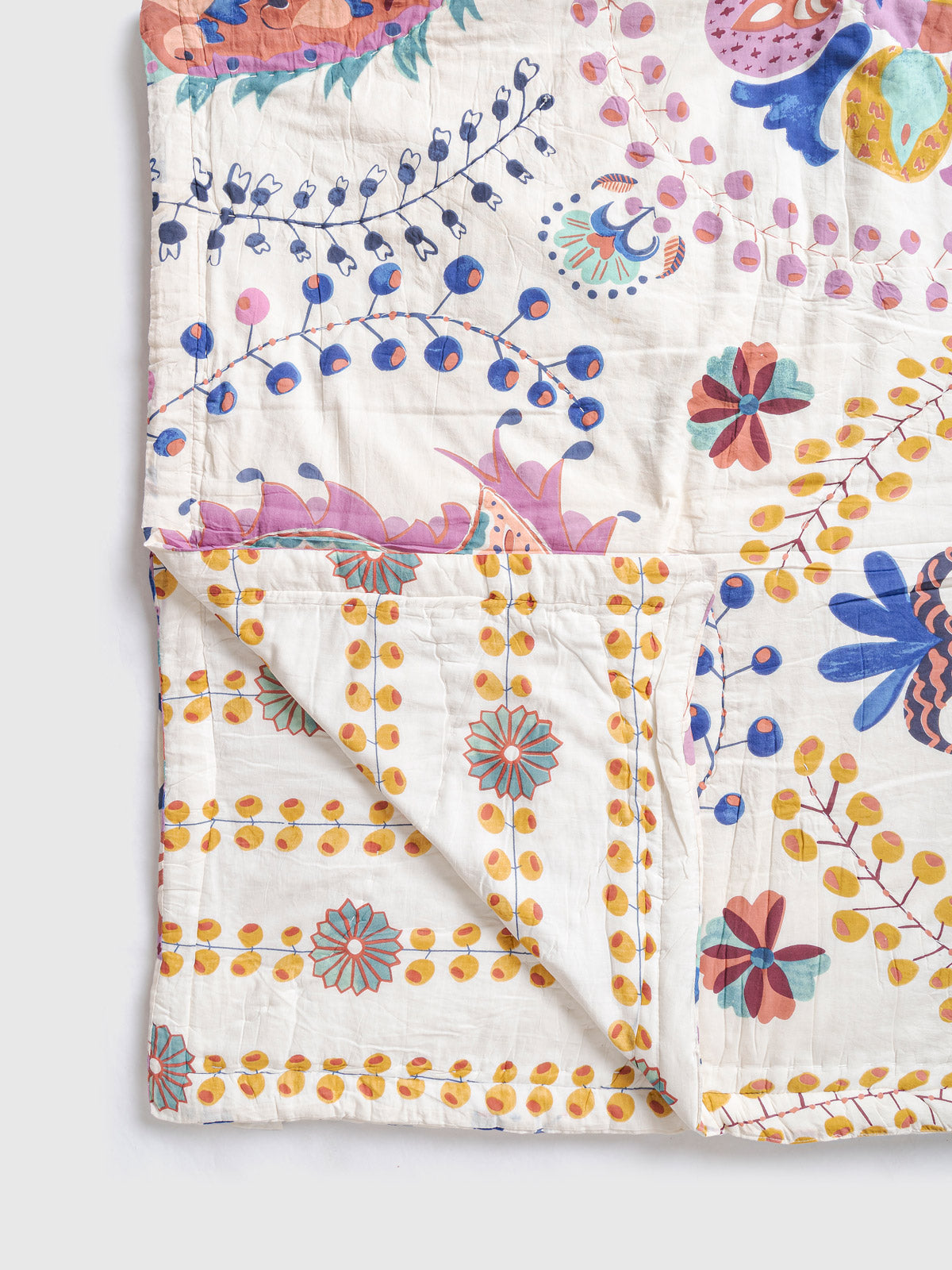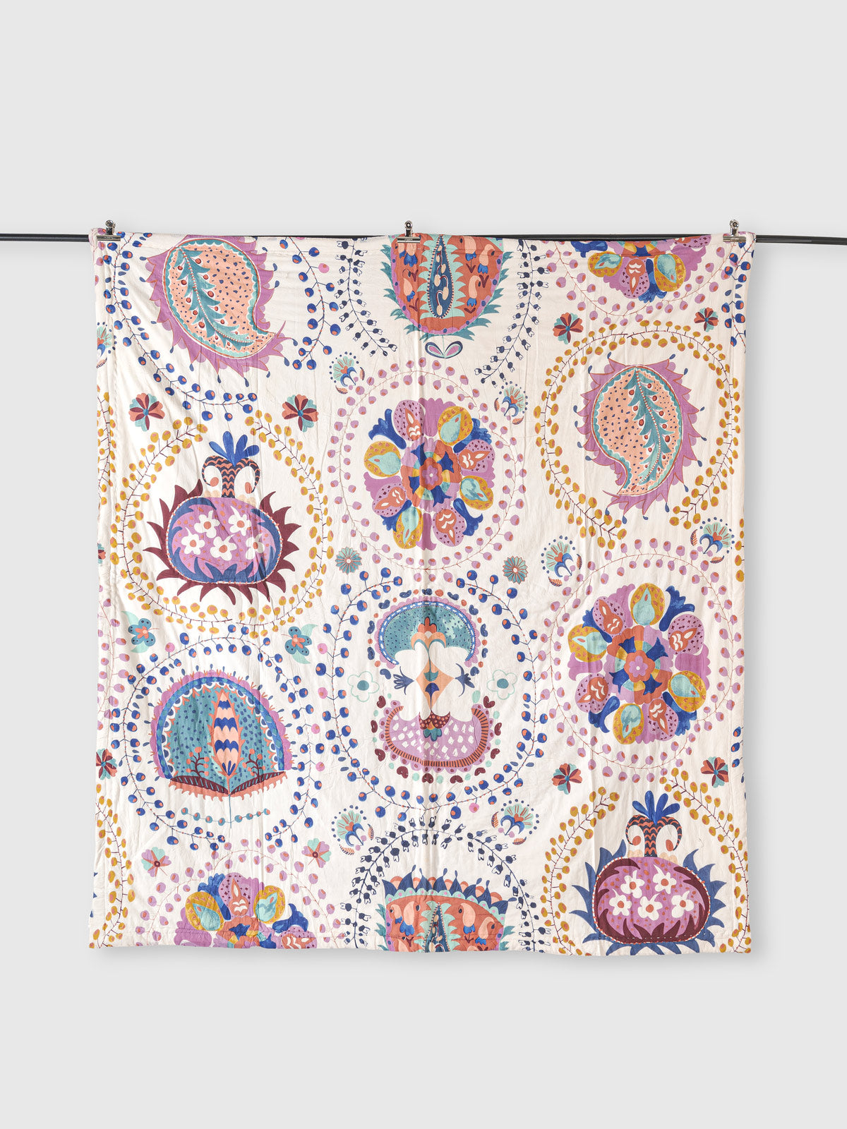 Each medallion is printed by hand by skilled artisans who use wooden blocks to create the detailed Suzani-inspired forms. Gentle hand quilting adds texture and breathability, giving the quilt a light and comforting feel throughout the year. The blend of rich colours and cultural motifs makes this piece a striking focal point in any interior.