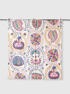 The Jaipur Suzani Printed Quilt celebrates the bold and expressive beauty of traditional Suzani textiles through intricate motifs and vibrant colour. Set against a soft ivory base, the quilt showcases large hand printed medallions filled with floral detailing, rhythmic dots and ornate patterns in shades of plum, mustard, teal, rust and sapphire. The design feels lively and regal, echoing the artistry found in Jaipur’s historic textile traditions.