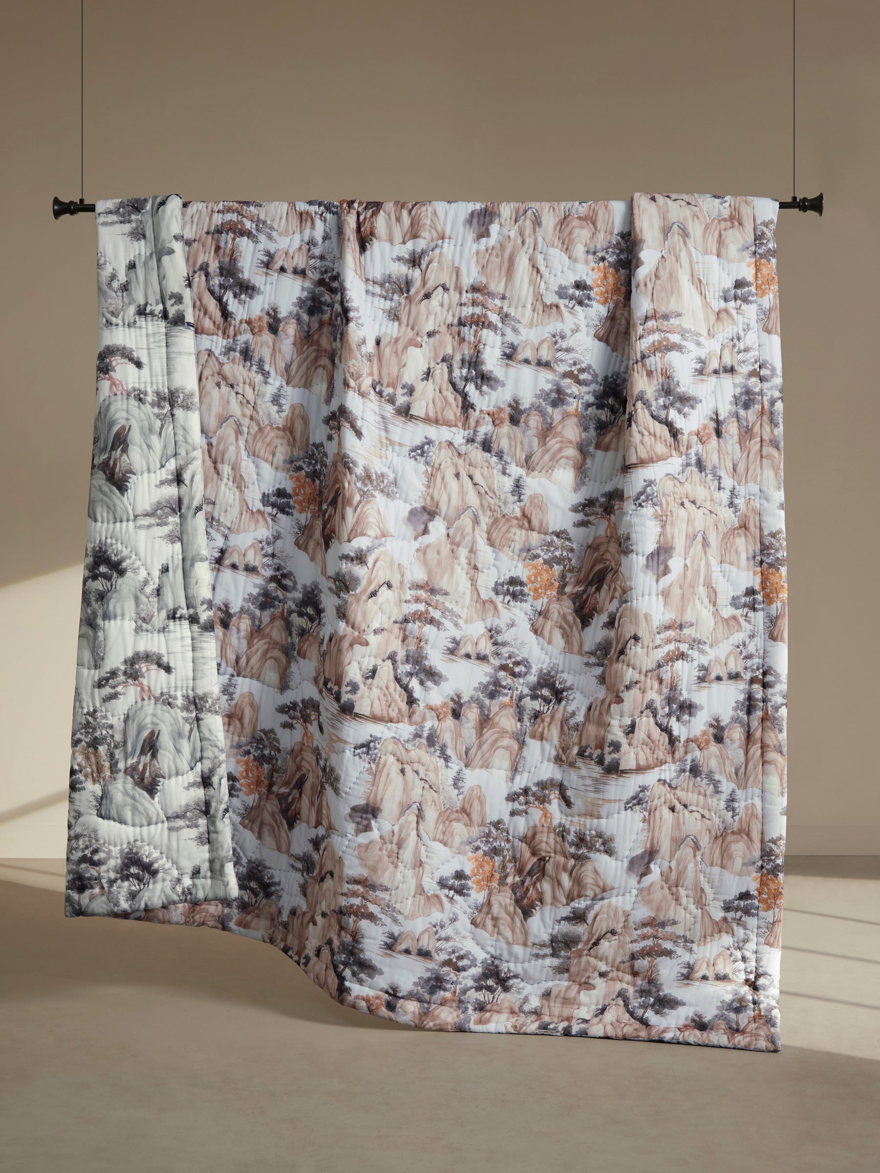 The Mystic Reversible Printed Quilt embodies quiet luxury through the art of scenic storytelling. Created for the TASHI X CONTRAST LIVING collaboration, this quilt transforms Tashi’s hand-illustrated landscape into an elegant textile piece, where misty mountains, sculpted rock forms, and graceful trees come together in a serene, atmospheric composition.