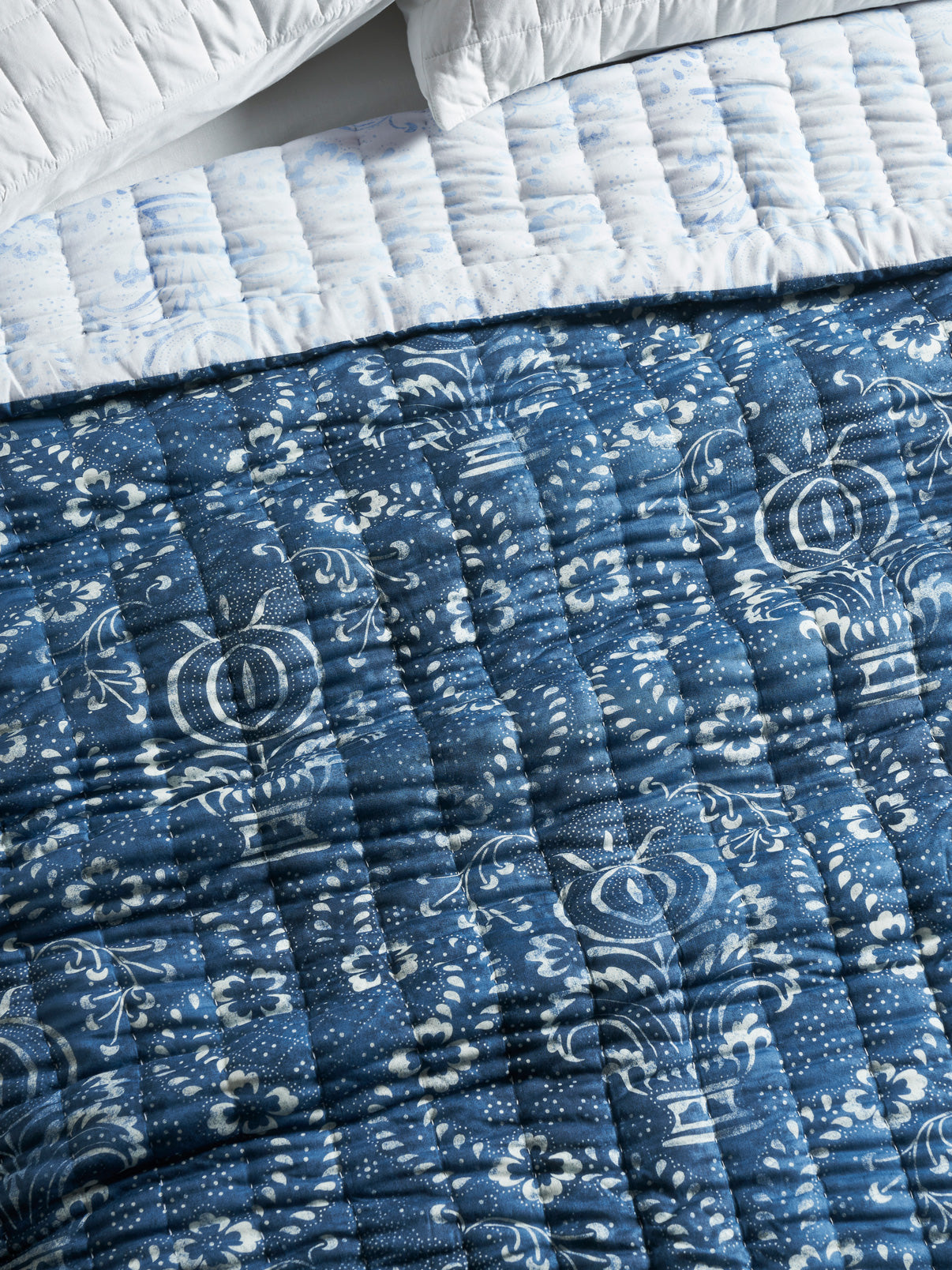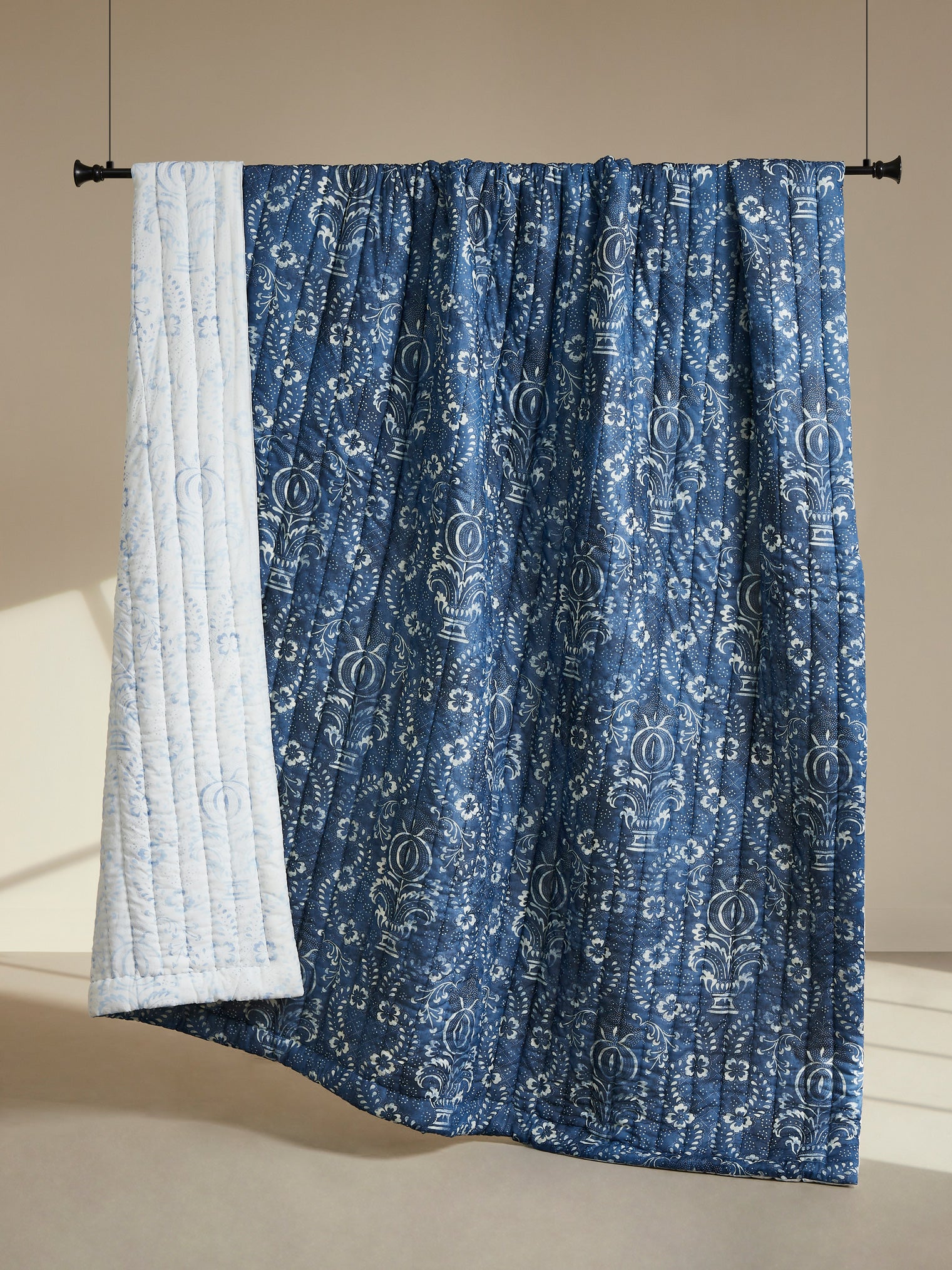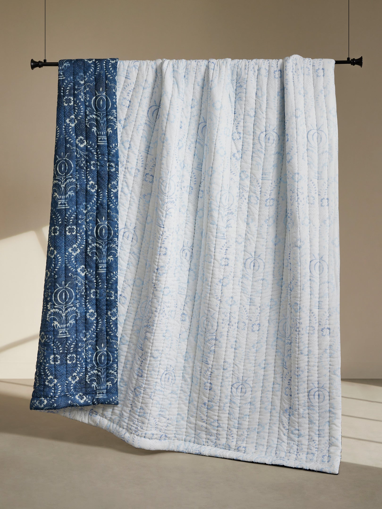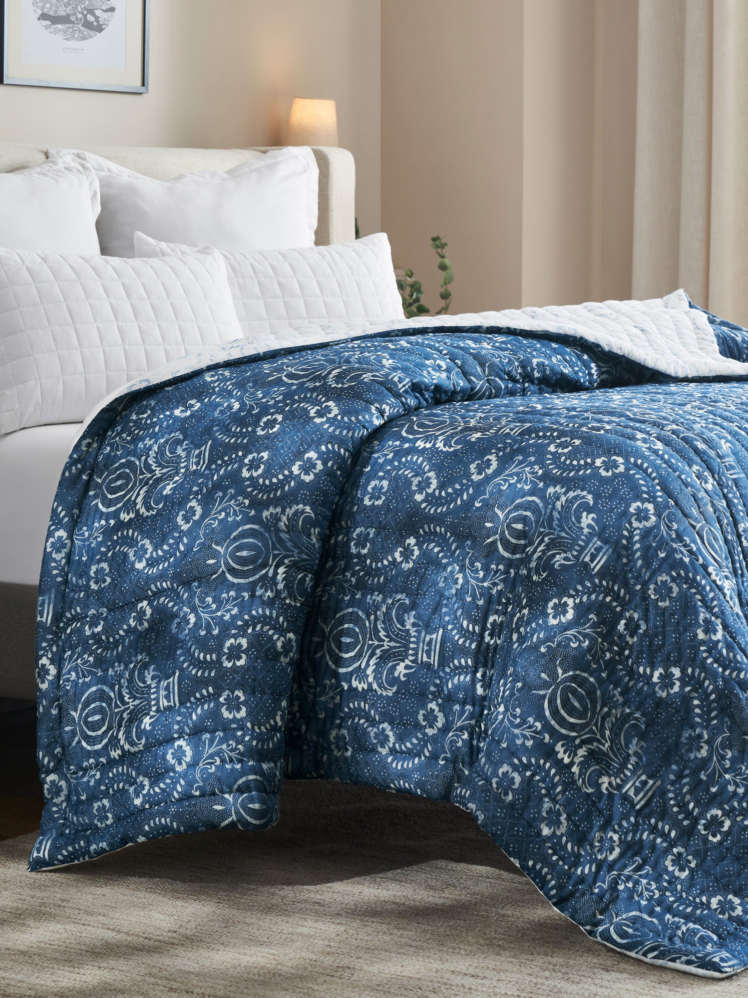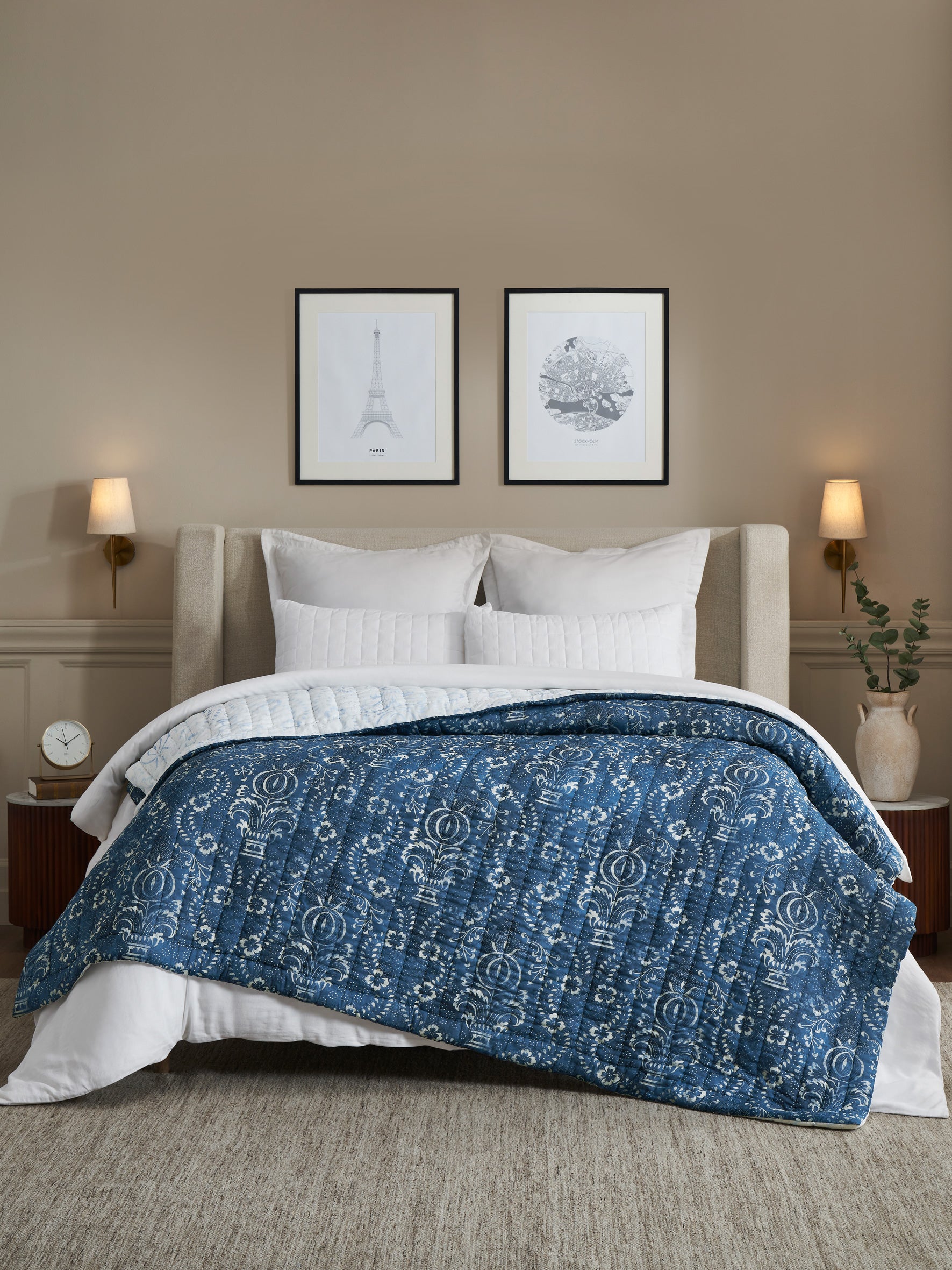 One side celebrates deep indigo tones with intricate floral motifs inspired by traditional block-printing heritage, while the reverse offers a softer, lighter palette for a refreshing, airy look. Made for year-round comfort, the quilt feels soft, breathable, and beautifully textured.