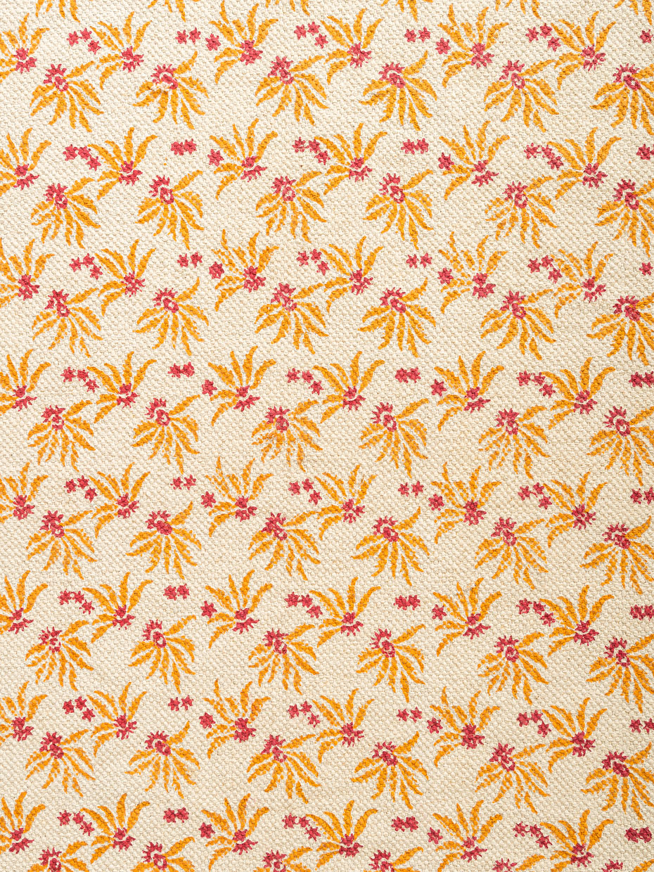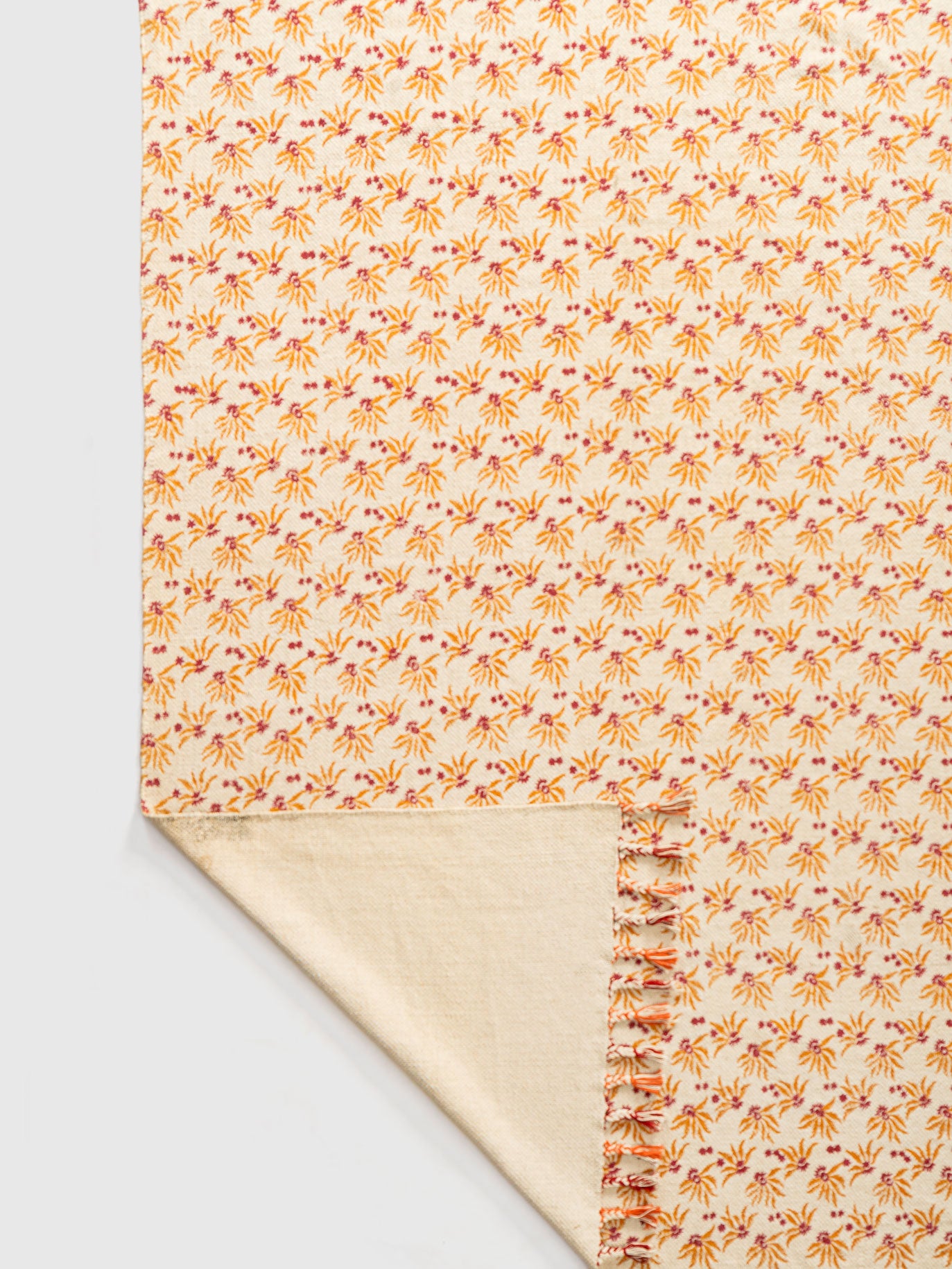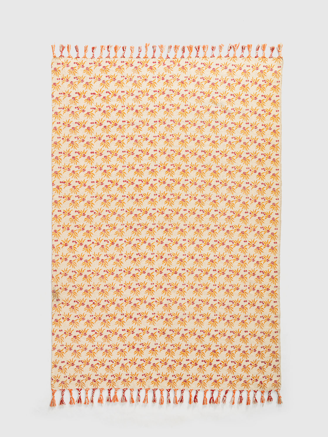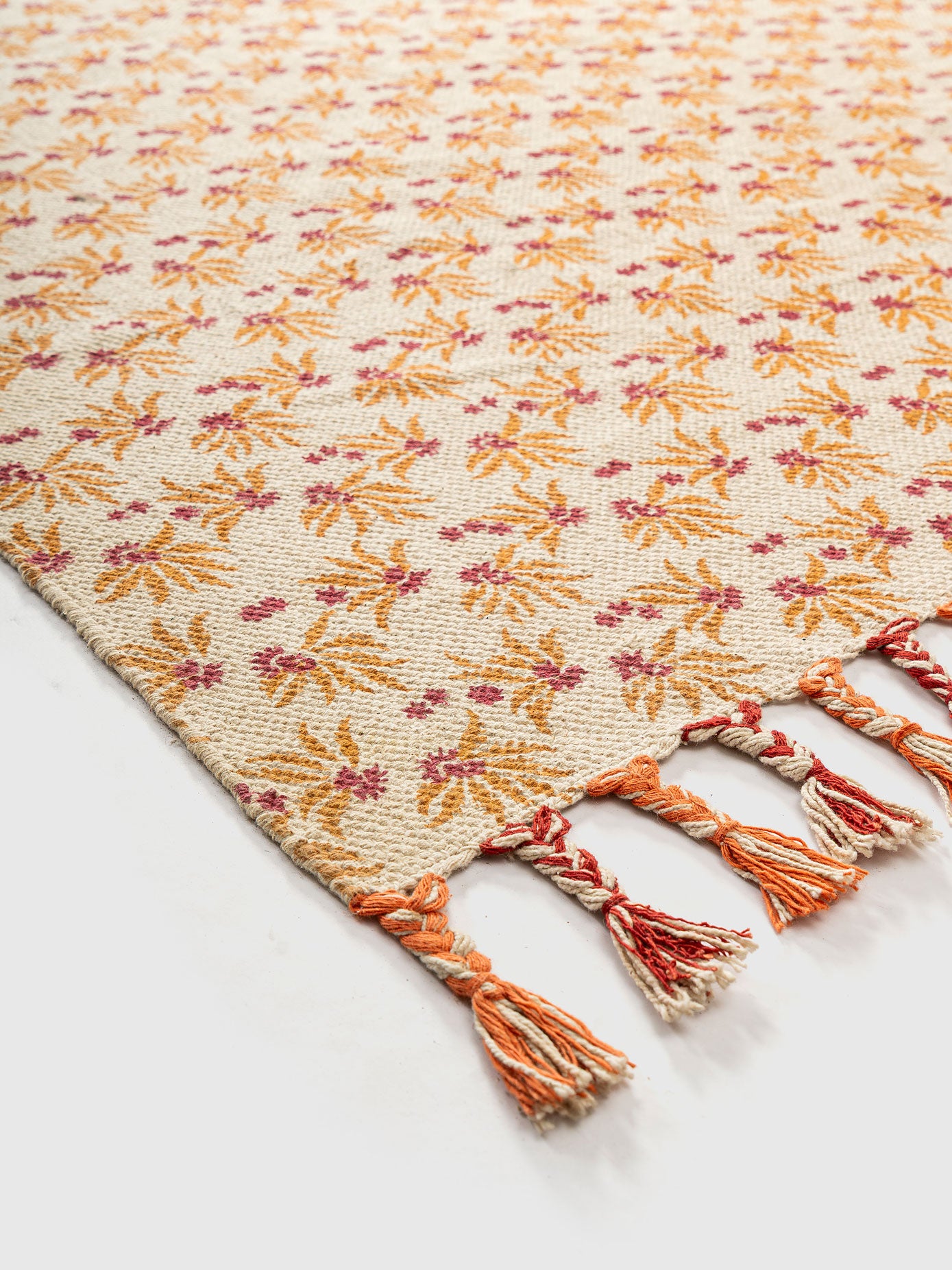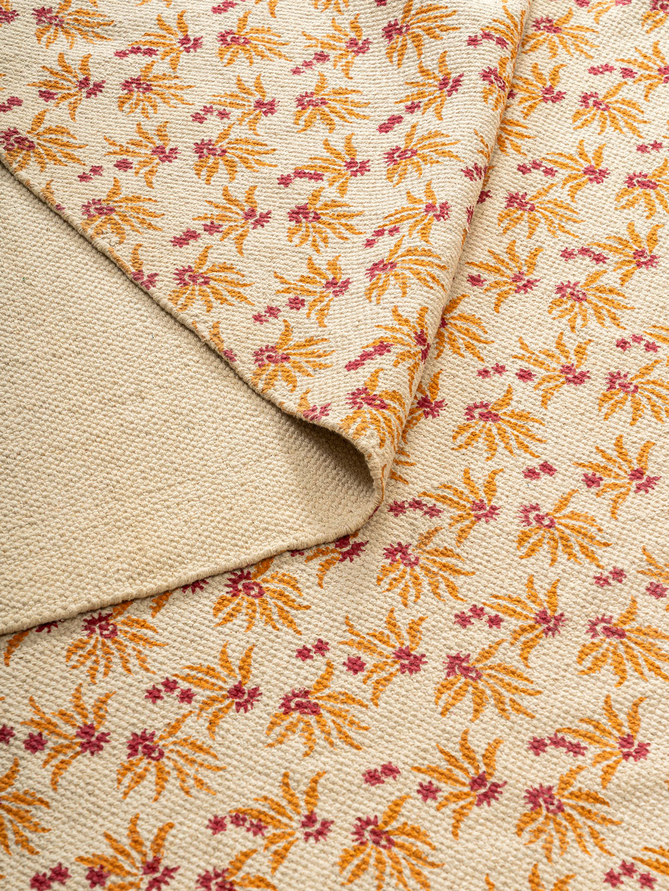 A soft field of flowers, woven in cotton, this is the Bartsha Rug. Creamy tones set the stage for orange and pink blossoms that bloom endlessly across its surface. Tassels line the edges like a gentle frame, adding playfulness. Lightweight, durable, and vibrant, it’s the perfect rug for homes that want to feel bright, cozy, and always alive with little bursts of color.