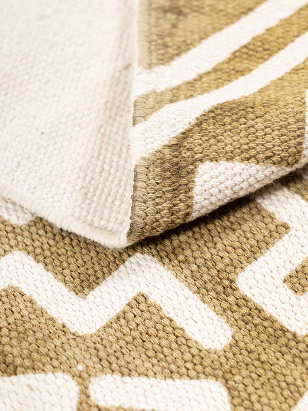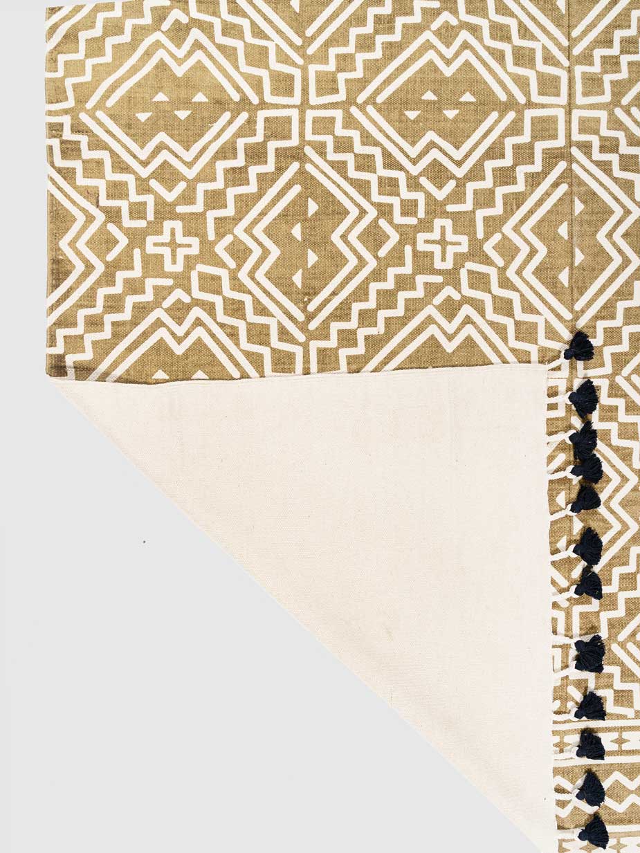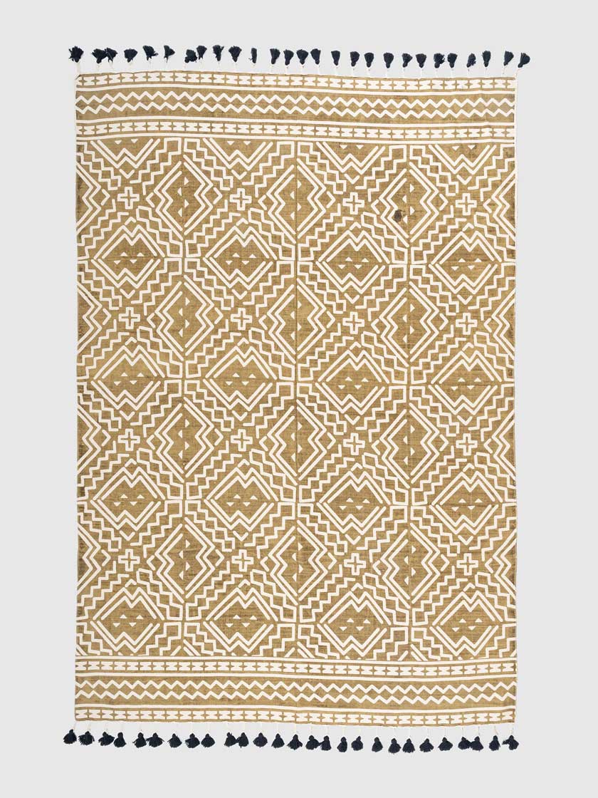 Guelma Cotton Rug showcases a striking geometric pattern in mustard yellow and white The edges are adorned with intricate border designs and finished with black tassels, adding a playful touch. This vibrant and bold rug would be a standout piece in any room.