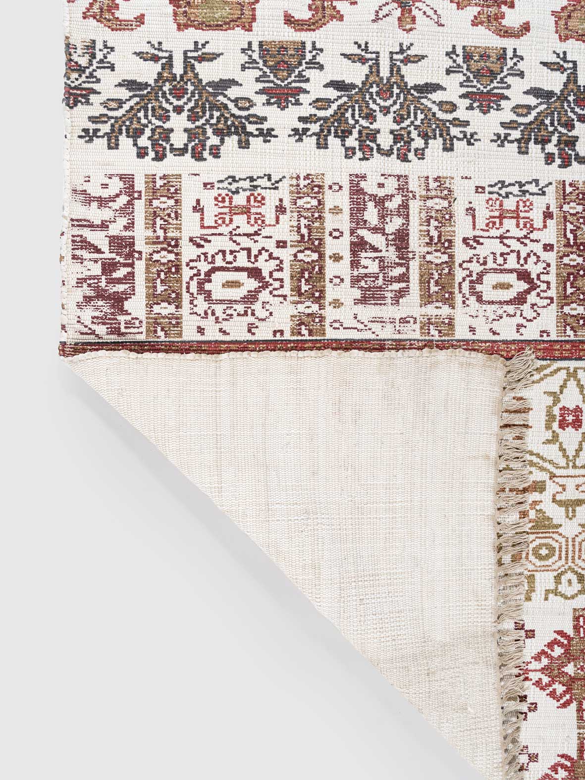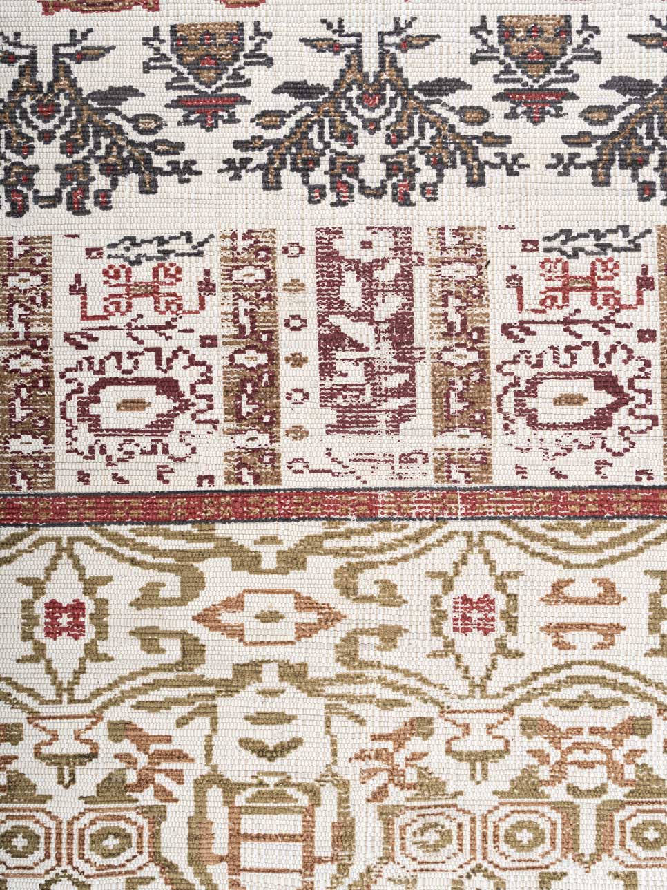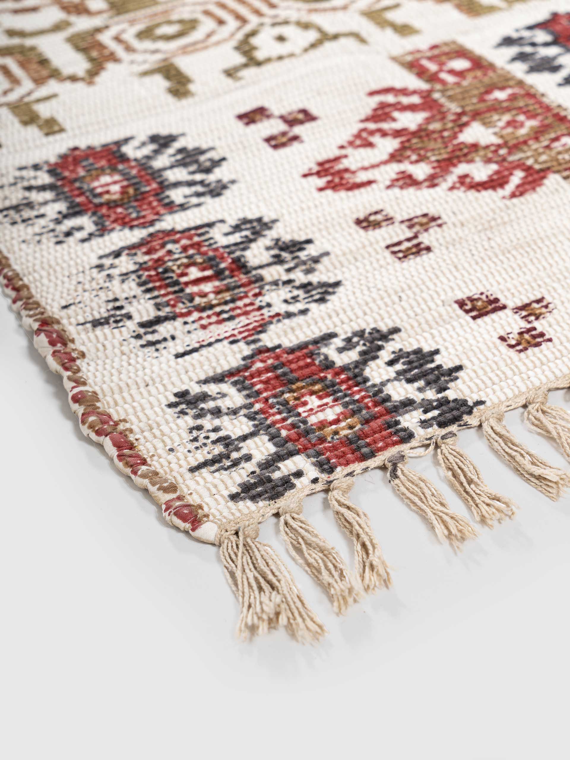Itta, our Chindi Cotton Rug showcases an intricate, multicolored pattern featuring a variety of geometric and floral motifs. It has a vibrant, traditional aesthetic with alternating vertical bands of detailed designs and edges with delicate fringes.