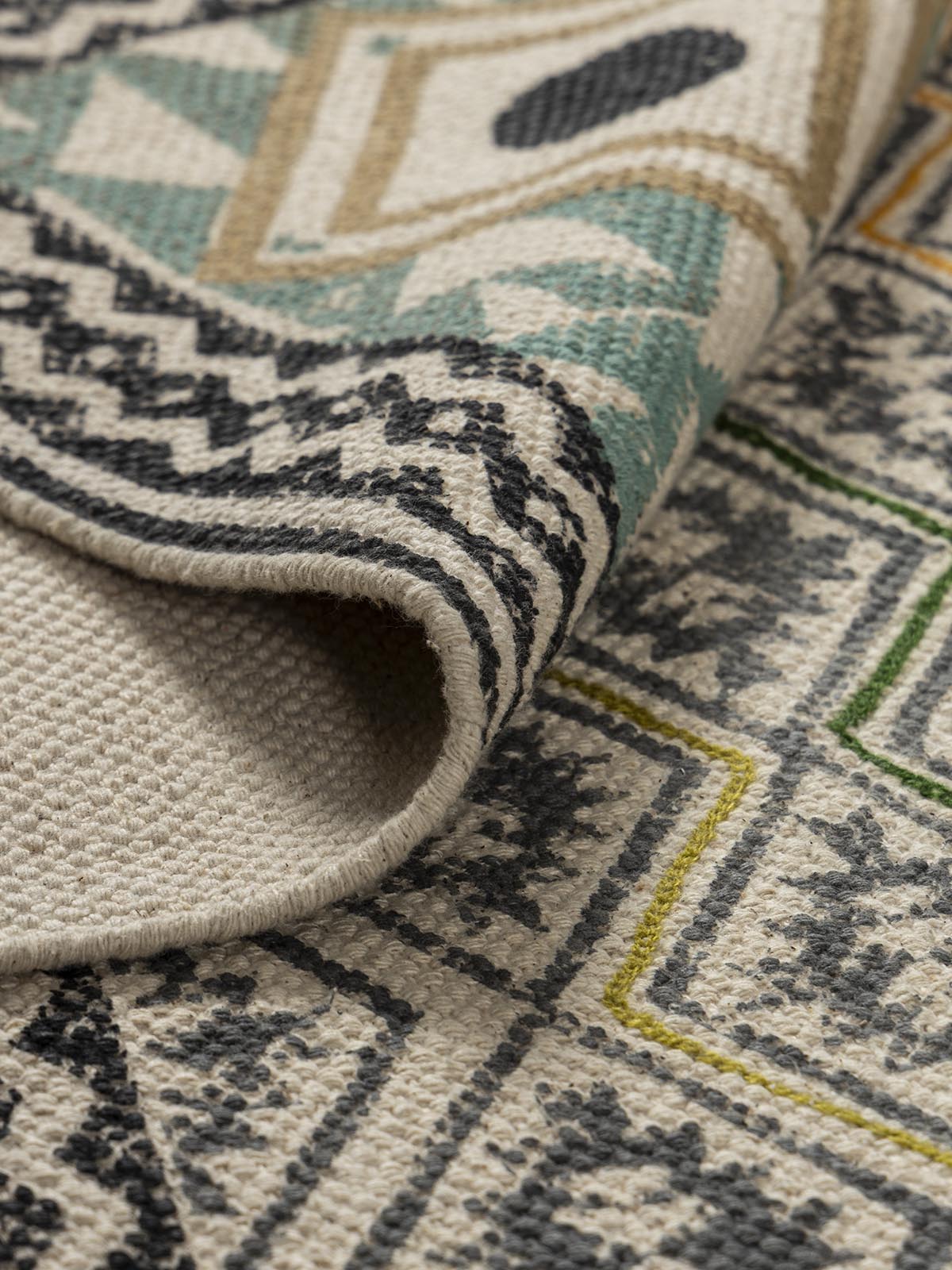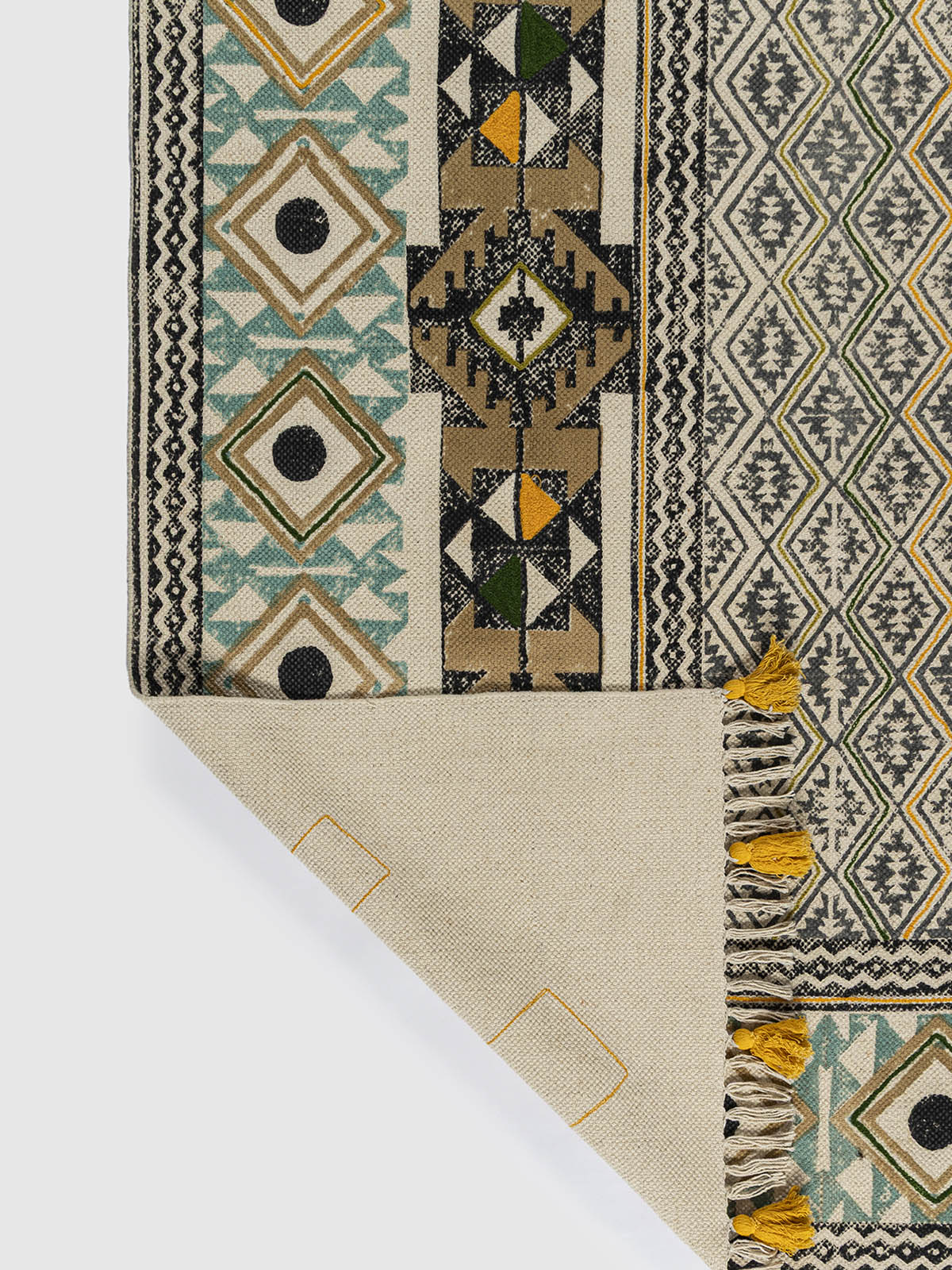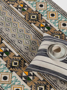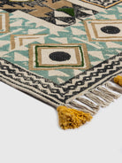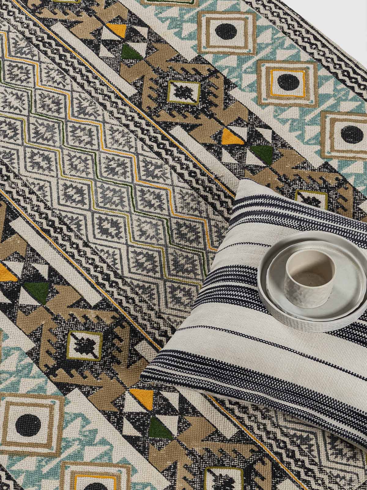 This one’s called Sheesh Mahal-and for good reason. Inspired by the intricacy of royal mirror halls, it blends symmetry, richness, and a hint of celebration. Printed and delicately embroidered by rural artisans, it’s made on soft cotton that feels just right underfoot. A piece that uplifts both your space and the people behind it.