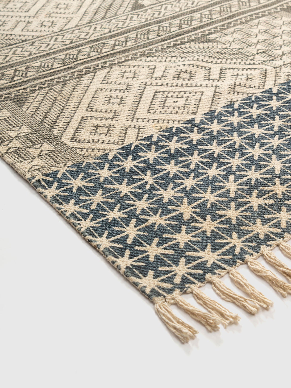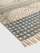 The Sinchula Cotton Printed Rug blends earthy charm with modern style. Featuring intricate geometric motifs in beige and grey, accented by blue borders, it creates a balanced, stylish look. Made from pure cotton, it is lightweight, soft, and durable for everyday use. Perfect for living rooms, bedrooms, or workspaces, this rug brings warmth and character to your décor while remaining easy to care for.