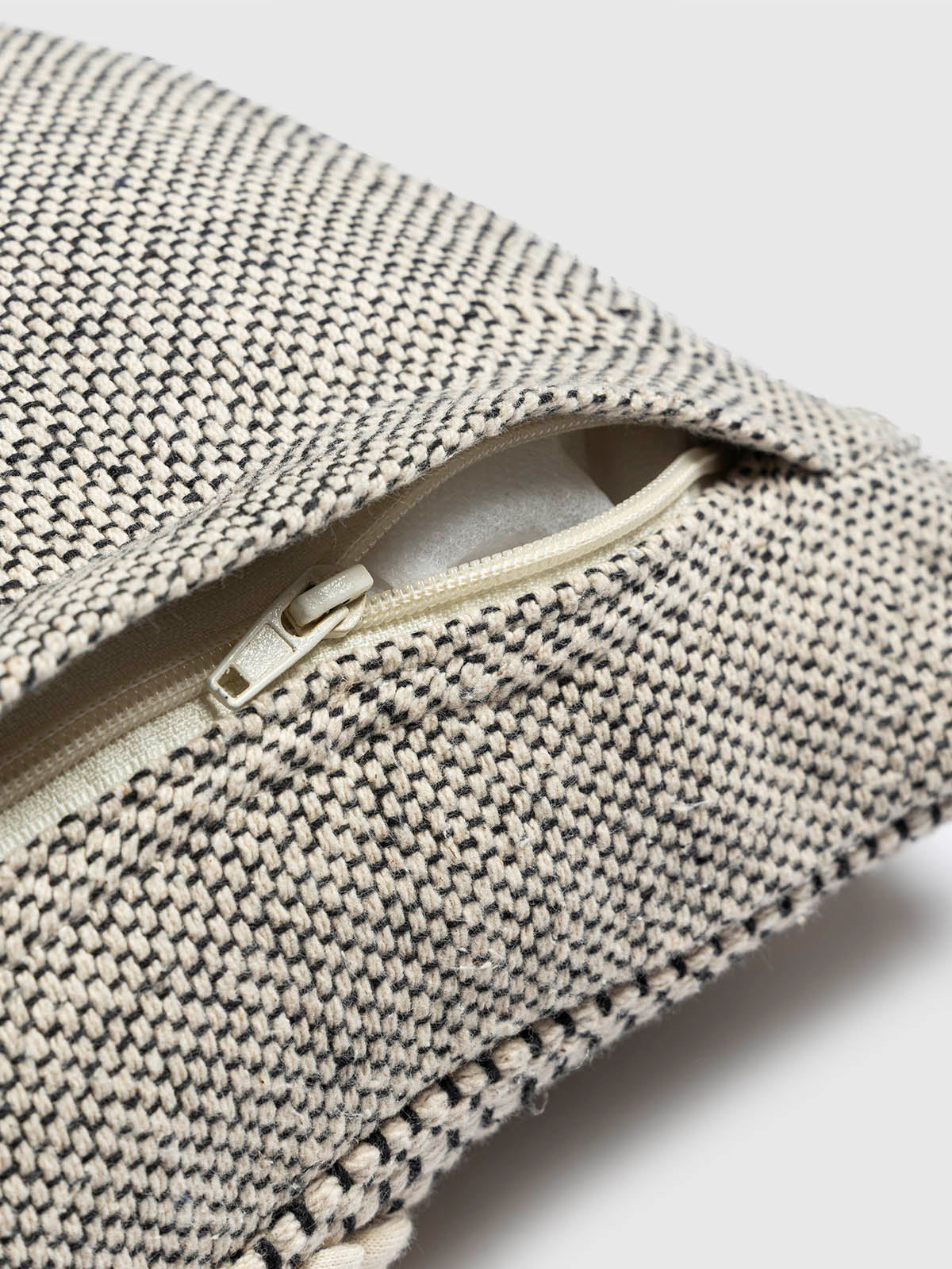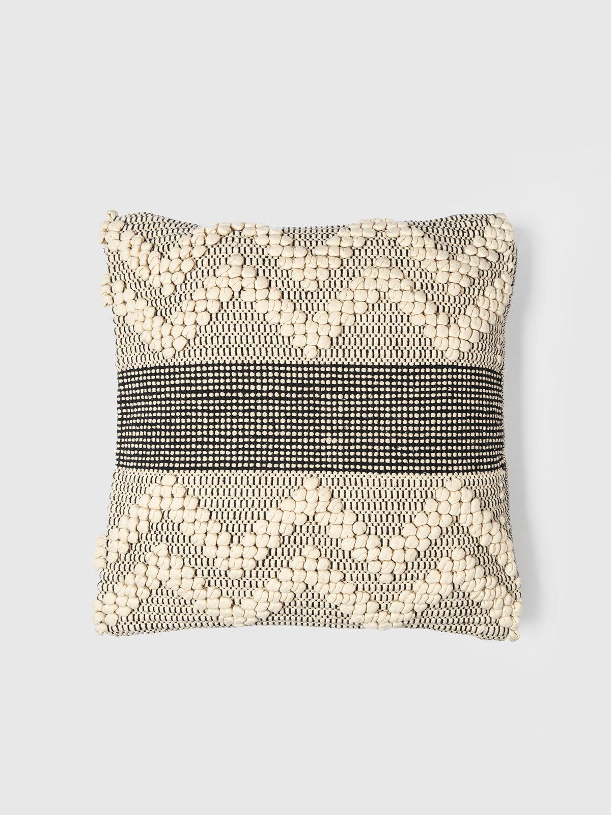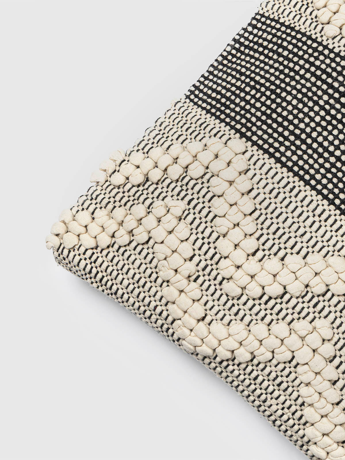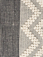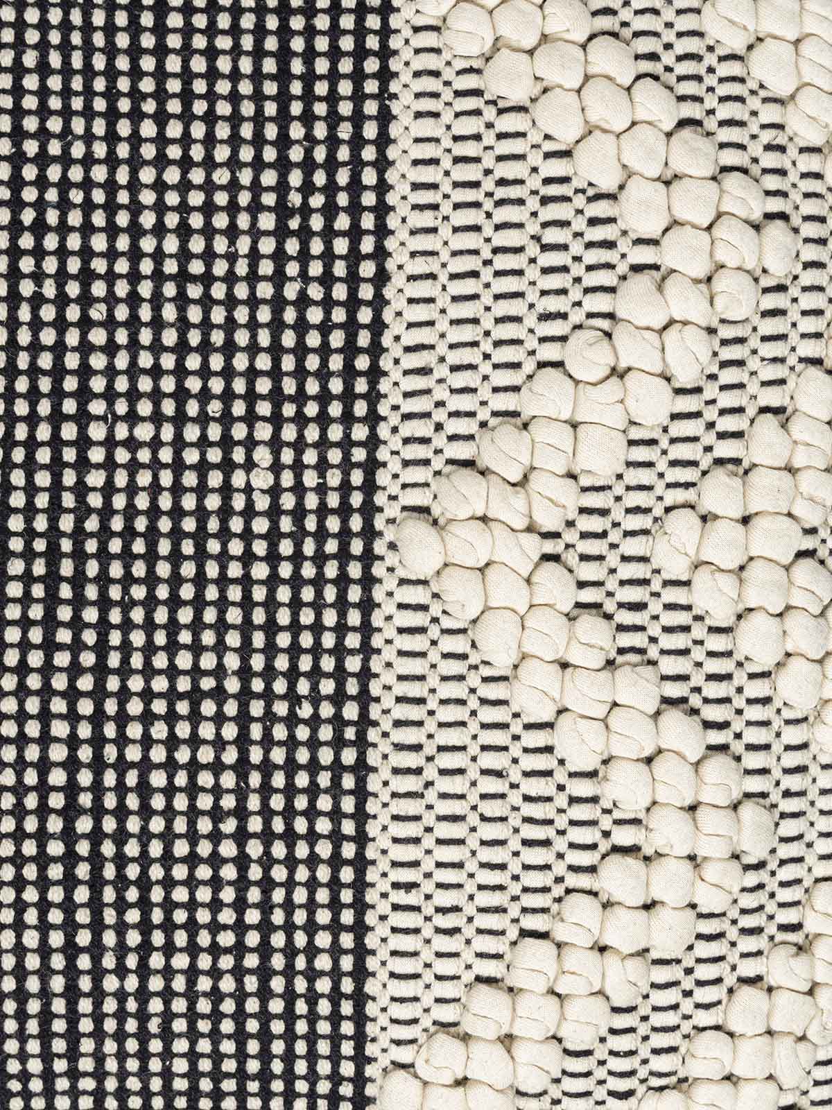 Add artisanal charm to your space with the rug cushion. Featuring bold zigzag tufting in soft ivory on a handwoven black base, this cushion offers a perfect blend of texture and contrast. Ideal for modern or boho home decor, it brings warmth, character, and a handcrafted touch to any room.