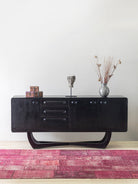 This sleek, modern sideboard exudes sophistication with its deep black finish and curved base design. Featuring three drawers and two spacious cabinets, it combines minimalist style with practical storage. Perfect for contemporary living spaces, this statement piece adds an artistic touch to any room while keeping your essentials neatly organized.