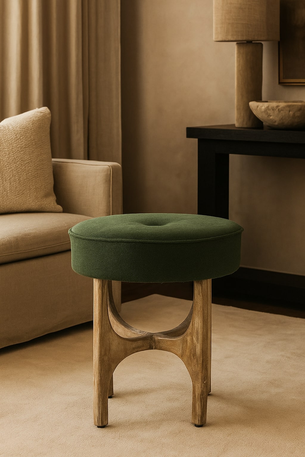 Effortlessly stylish with a hint of retro charm, this olive green Stool channels mid-century design through clean contours and tapered wooden legs. Upholstered in a textured fabric, it’s an understated accent piece perfect for intimate corners or curated reading nooks.