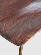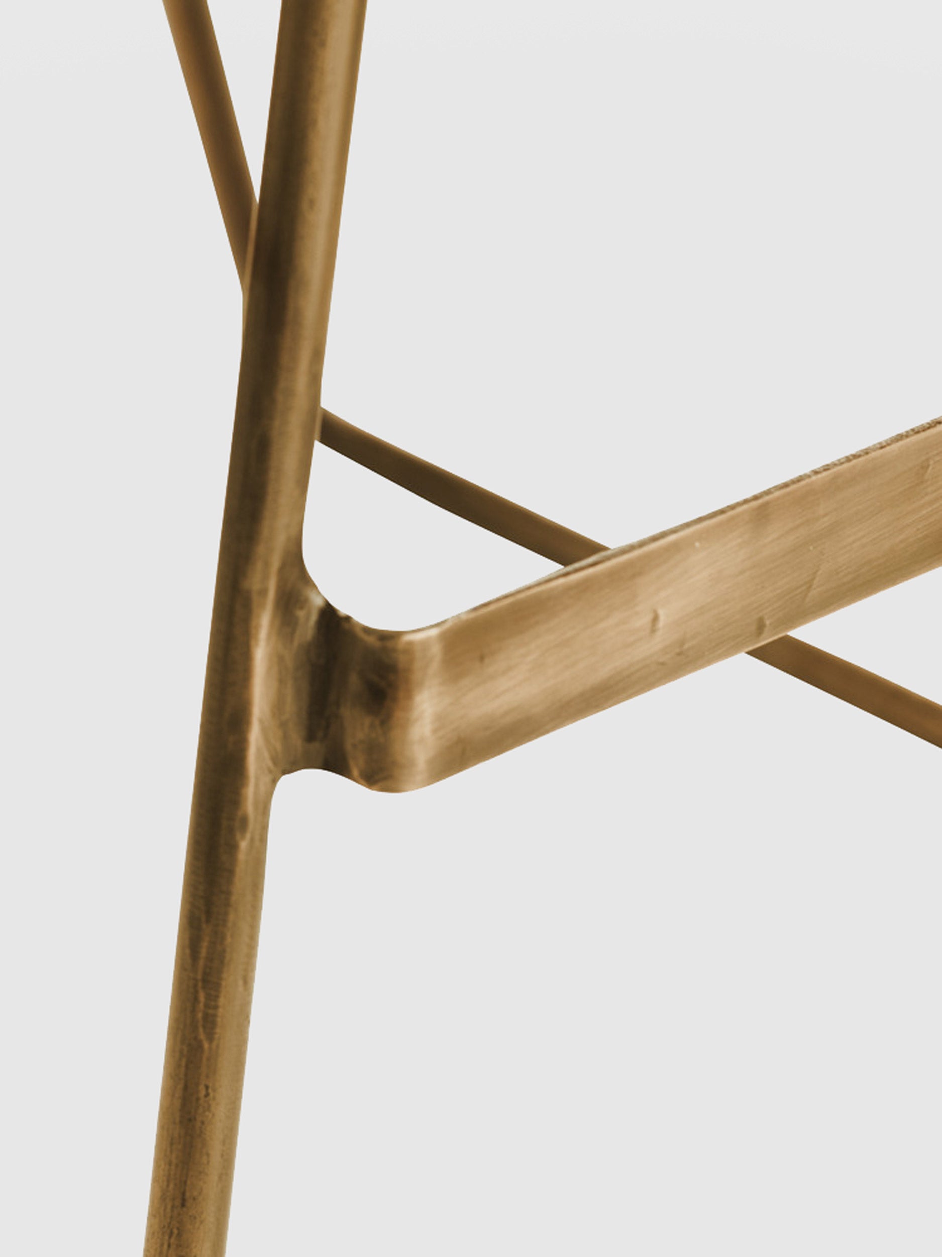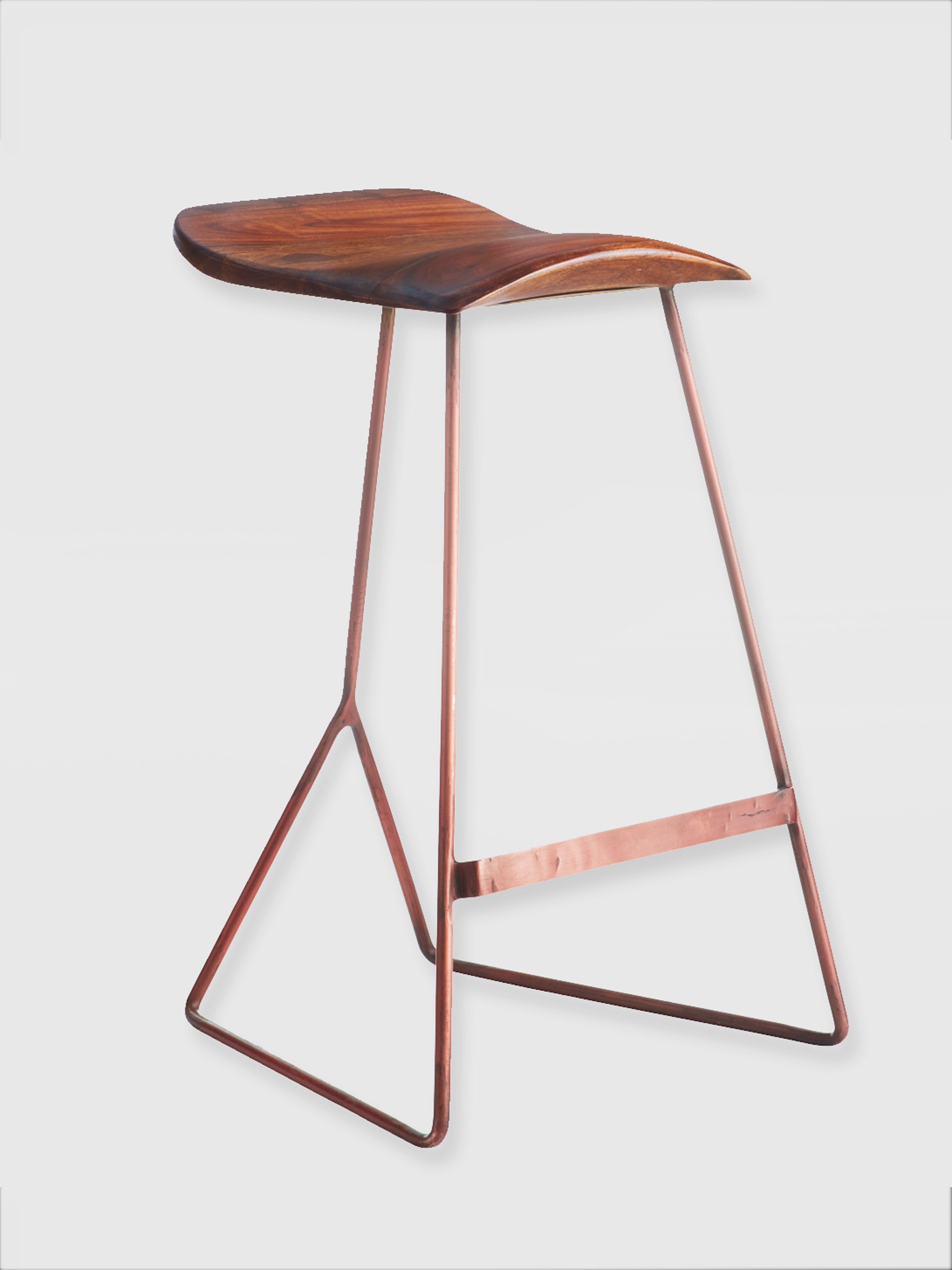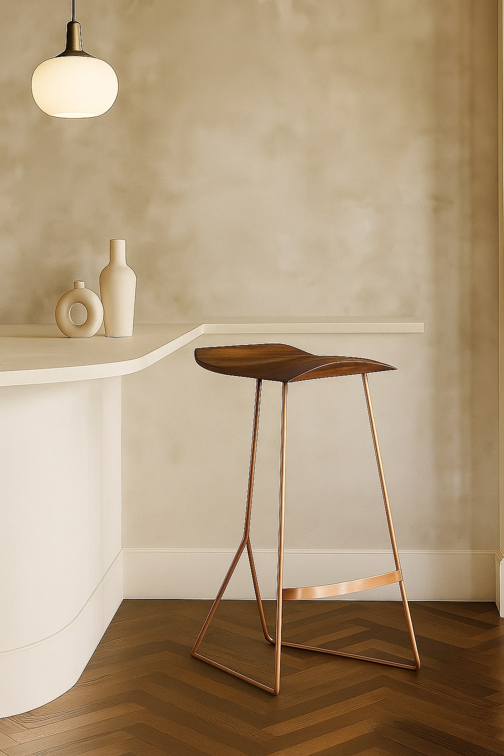 This modern bar stool strikes the perfect balance between sleek design and natural elegance. Its sculpted wooden seat, crafted for comfort, rests gracefully atop slender copper-finished legs, creating a striking contrast of warmth and shine. Minimalist yet stylish, the geometric frame adds stability and contemporary flair. Ideal for kitchens, bars, or lounge spaces, this stool elevates interiors with a touch of sophistication while blending seamlessly into both modern and rustic décor.