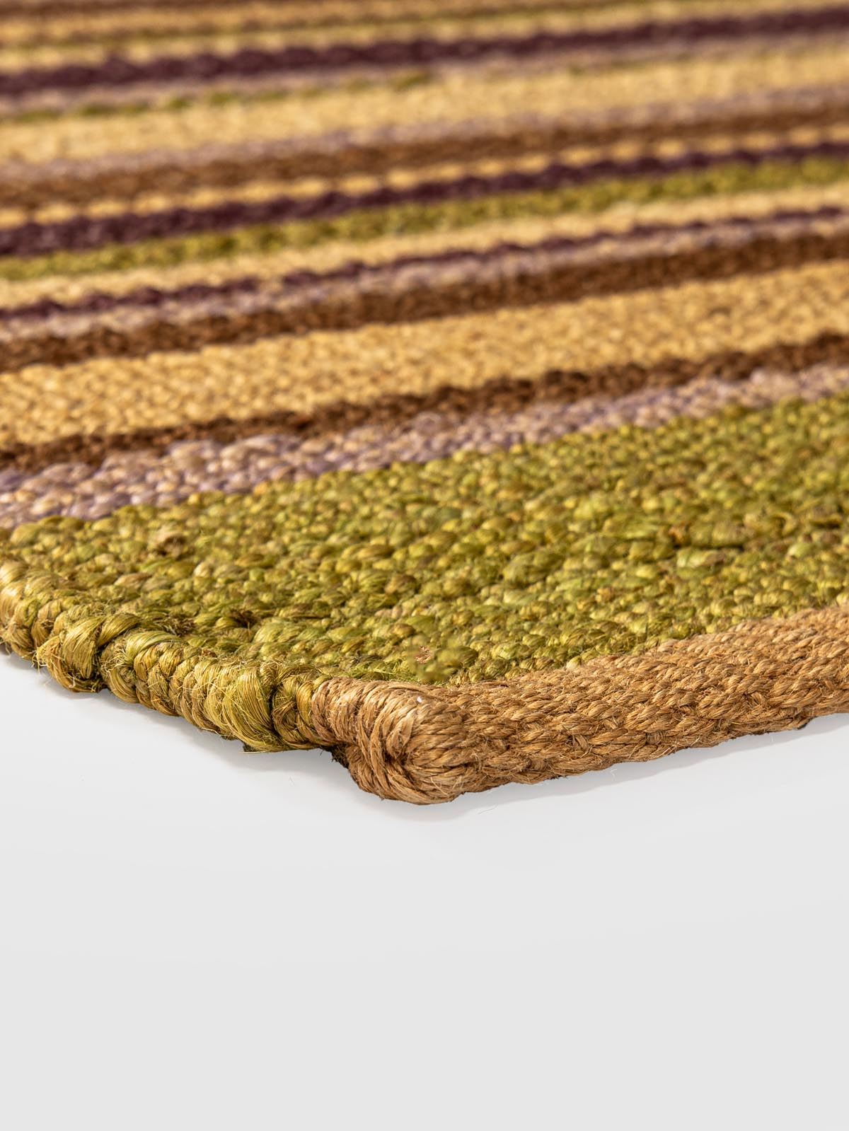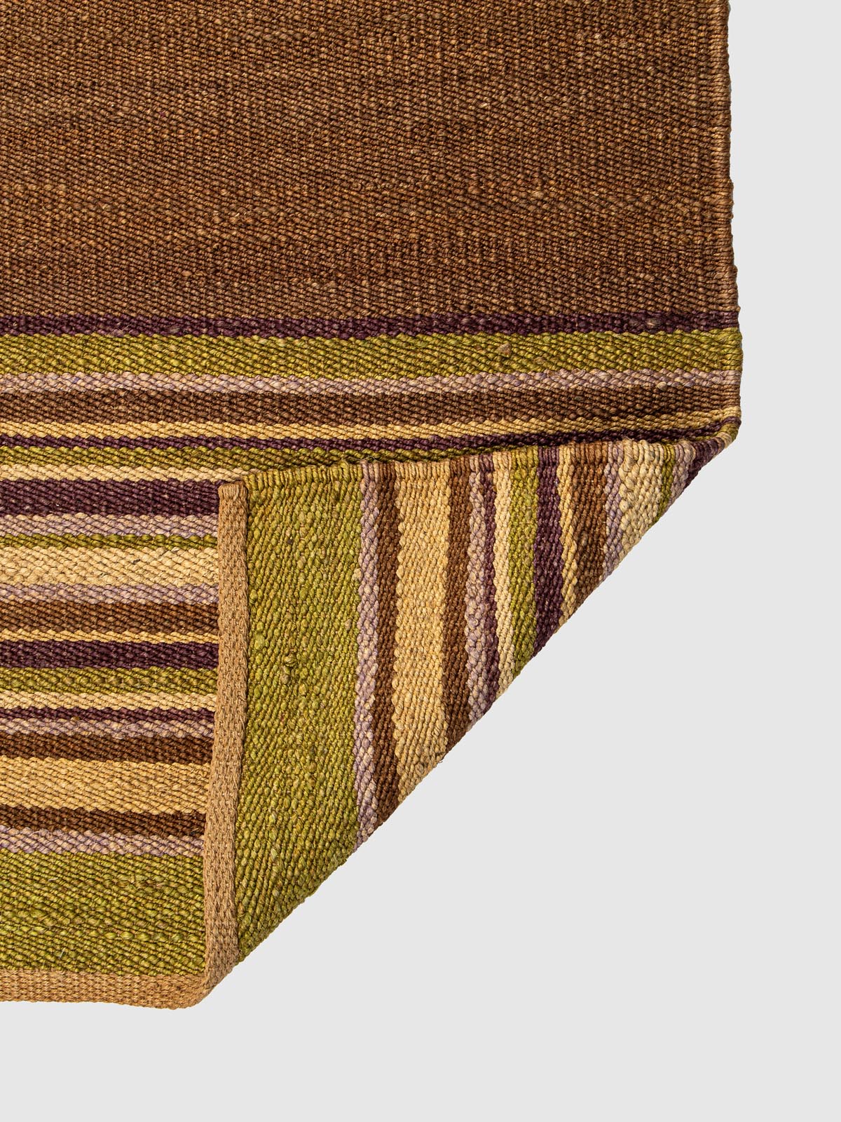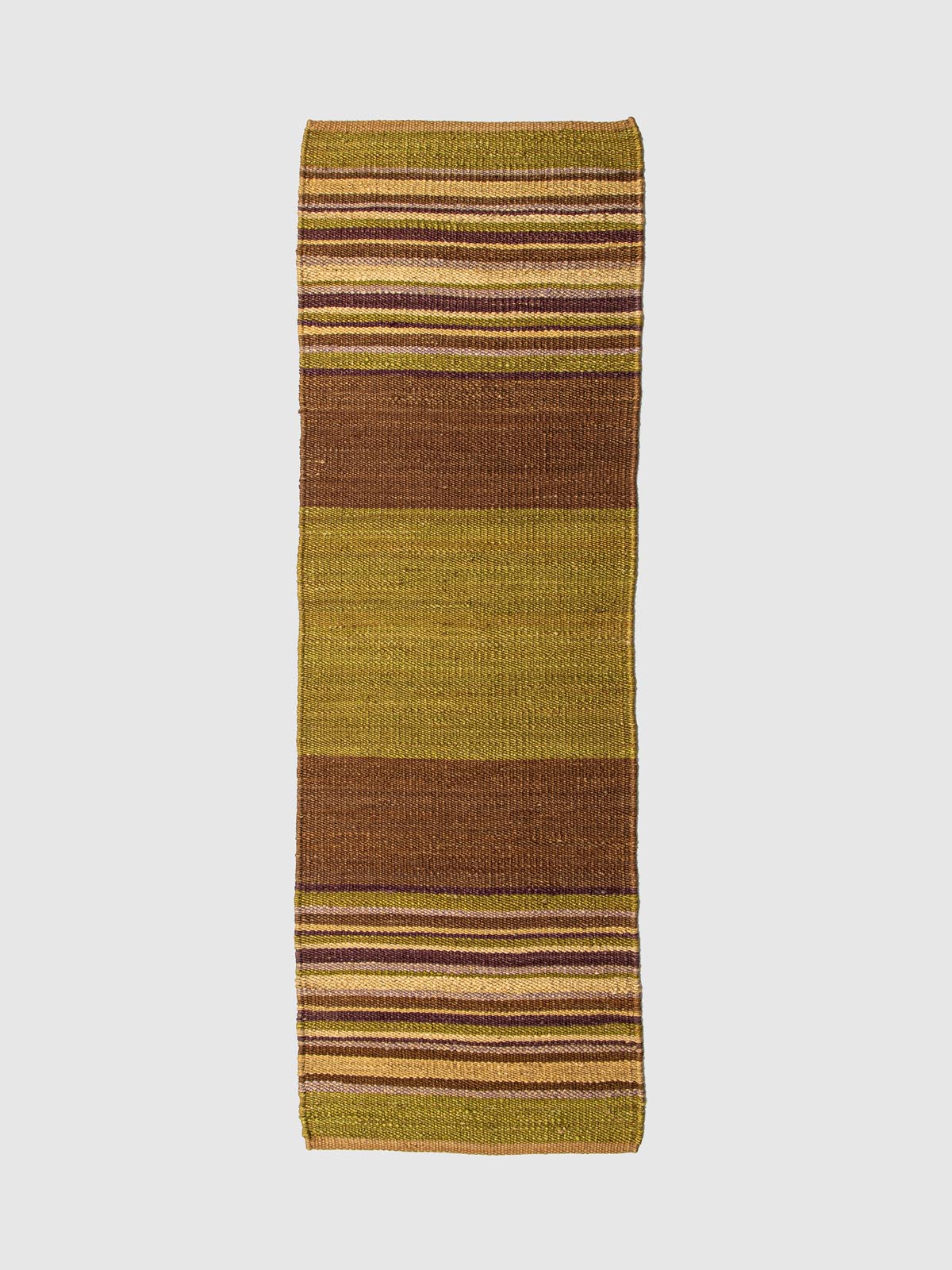 Hand-woven using the intricate Sumak technique, this jute runner is a masterclass in tonal transitions. Deep moss and olive greens are punctuated by rhythmic stripes of aubergine and cream, creating a sturdy, flat-weave surface with a rich, braided feel. It’s an ideal choice for adding a focused burst of forest-inspired color to transitional hallways.