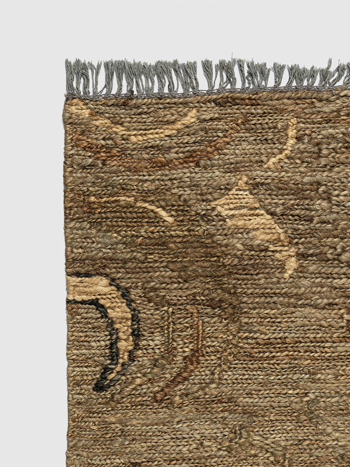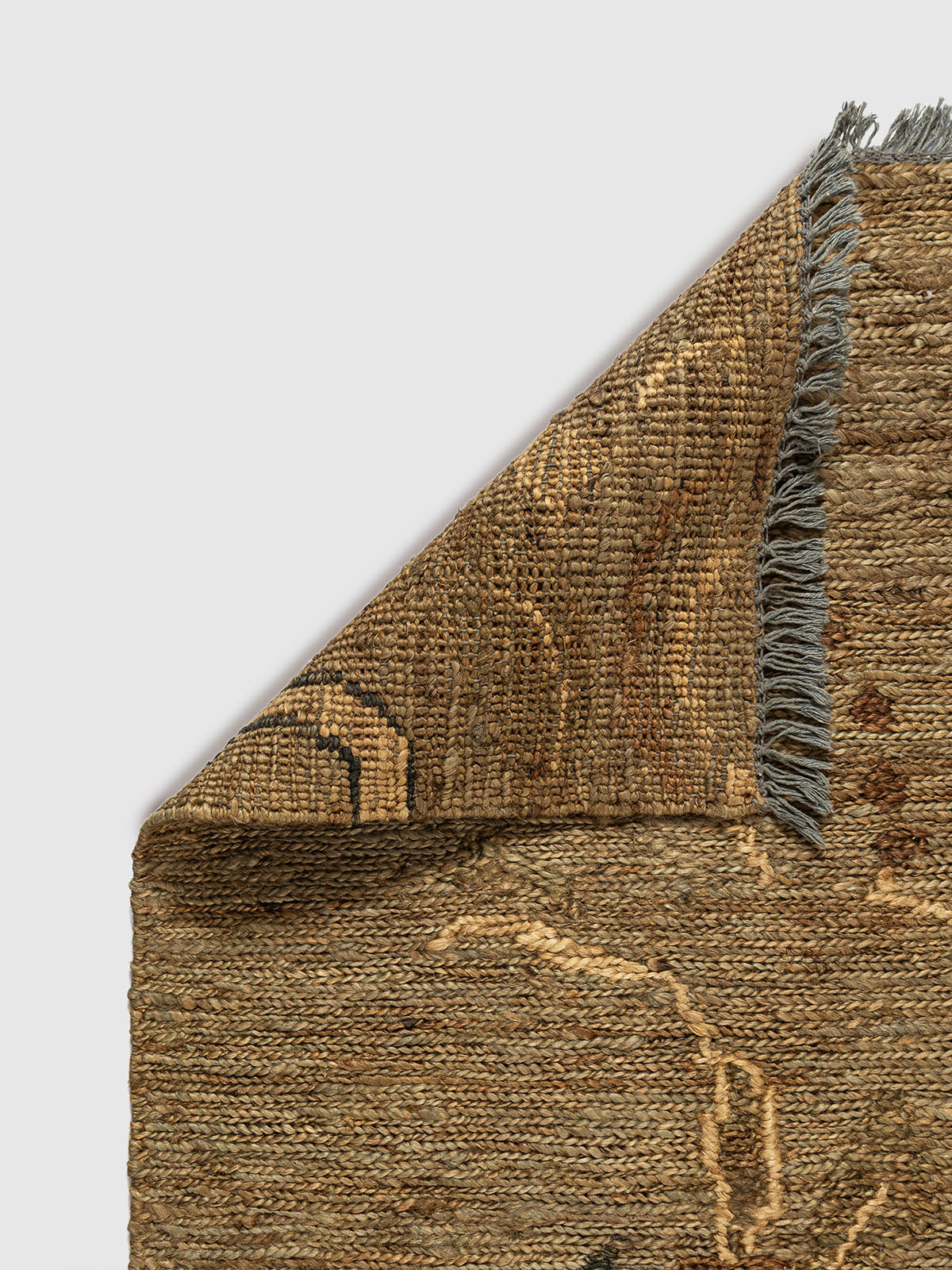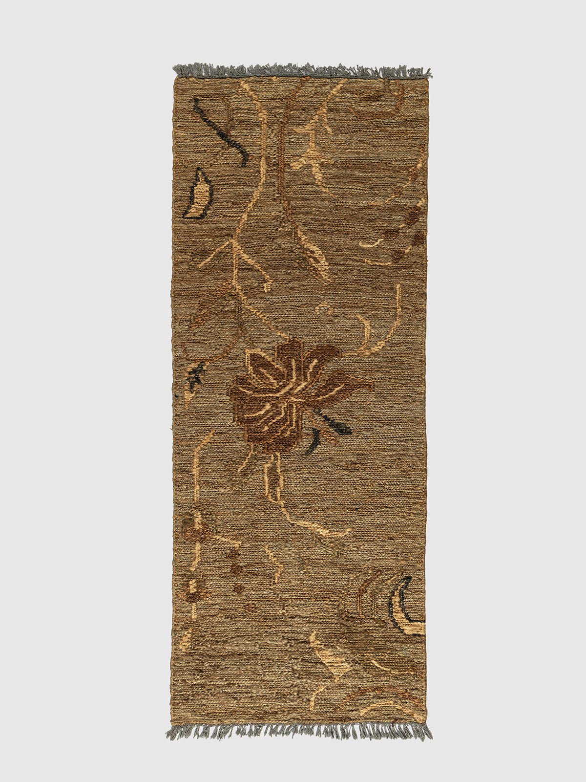 Artisan-crafted jute meets poetic design in this unique Sumak runner. An oversized, hand-woven floral silhouette winds across a golden-khaki field, creating a sense of movement and grace. The raised texture of the Sumak wrap highlights the vine details, making this more of a durable floor-art piece than a simple covering.