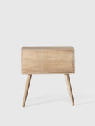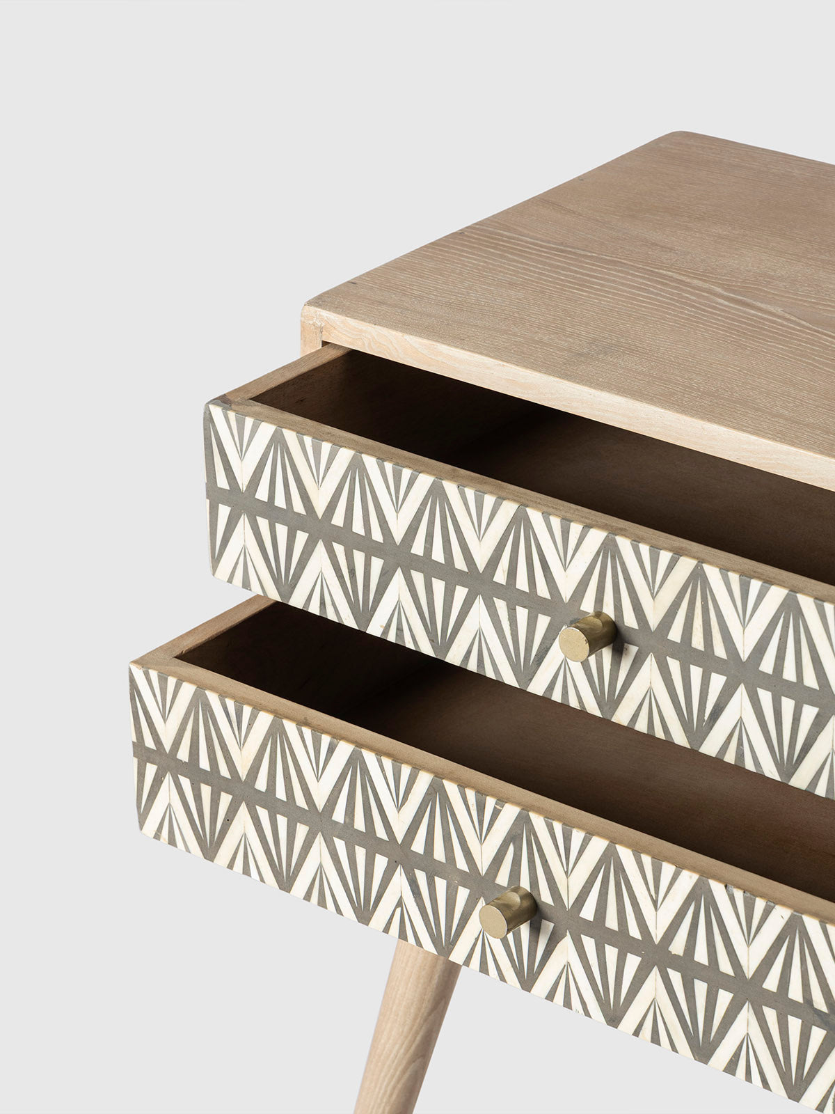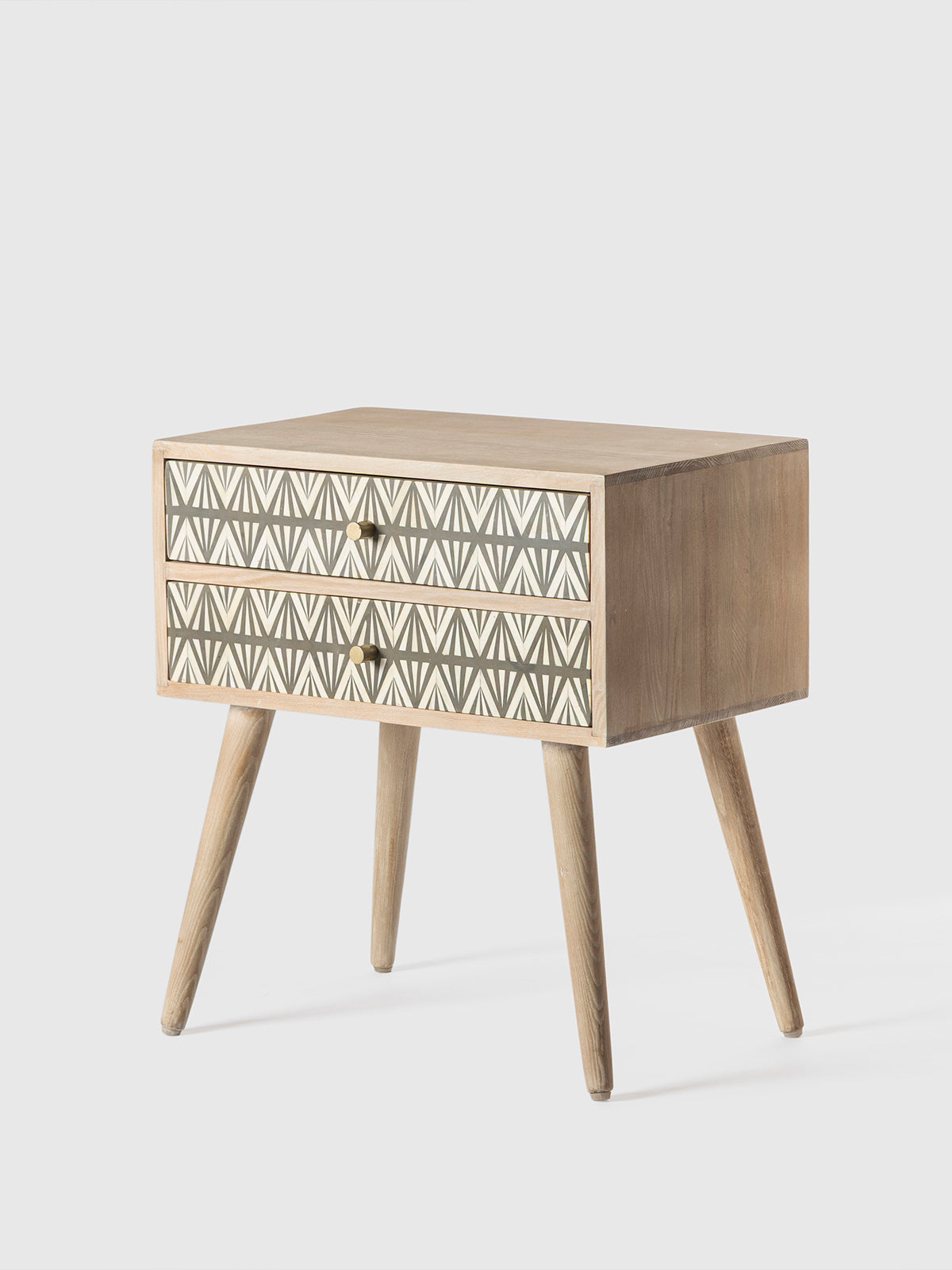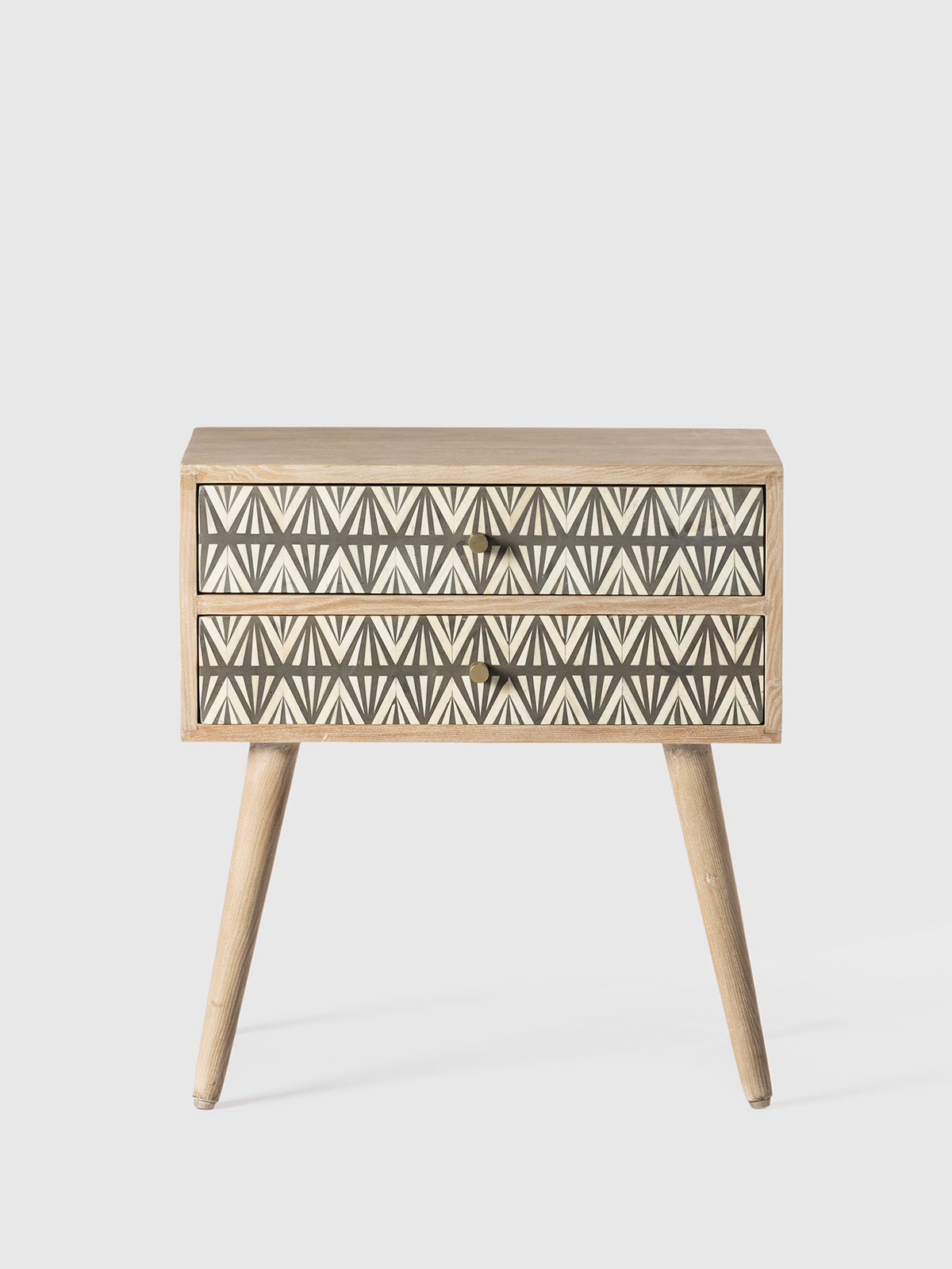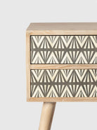Add a touch of modern flair to your space with this chic wooden side table. Featuring two spacious drawers adorned with a bold geometric pattern, it stands on sleek, angled legs for a mid-century vibe. Perfect for storing essentials while elevating your décor with its stylish design.