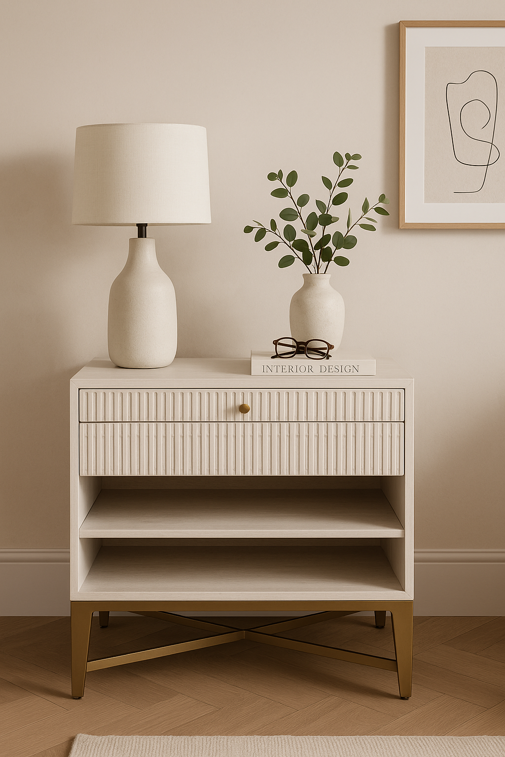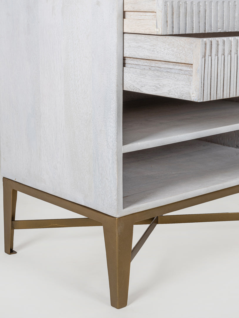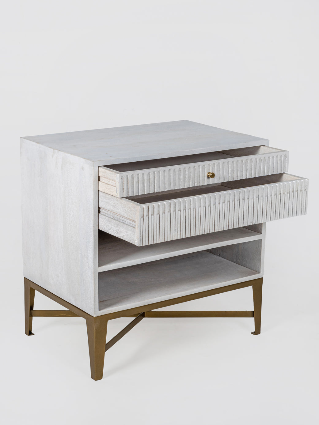 This stylish nightstand combines rustic charm with modern elegance. A whitewashed wood finish, fluted drawer fronts, and a sleek brass base create a timeless look. Featuring two spacious drawers and an open shelf, it offers practical storage while enhancing bedroom aesthetics with its minimalist yet sophisticated design.