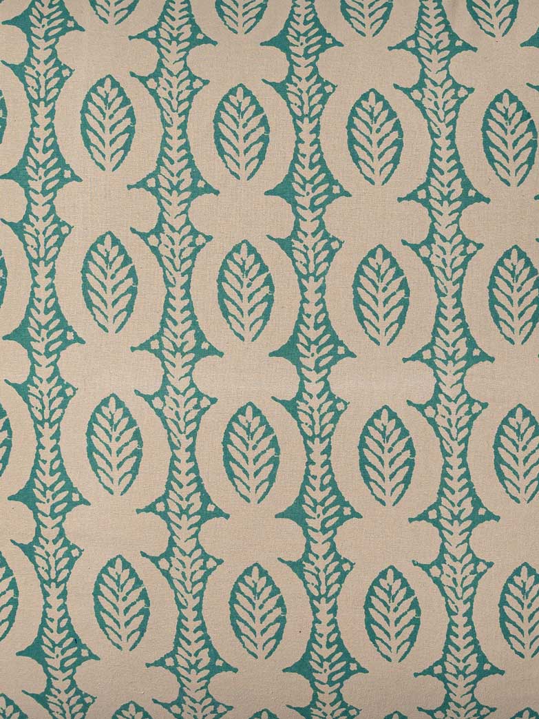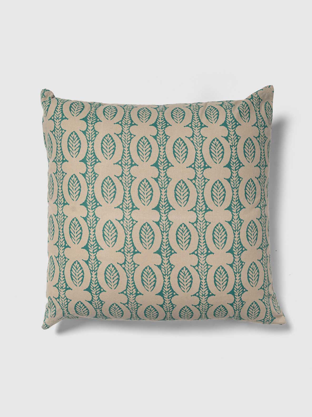 The hand-printed Aomori Cushion Cover features a repeating pattern of teal-green leaf motifs on a beige fabric. This artisanal piece, crafted with care, adds an elegant touch to home decor. Ideal for enhancing the aesthetic of living spaces, it blends traditional craftsmanship with modern design.