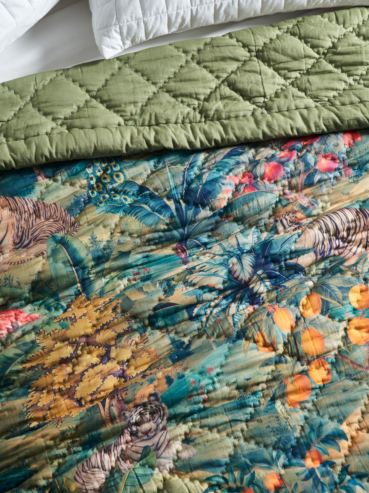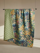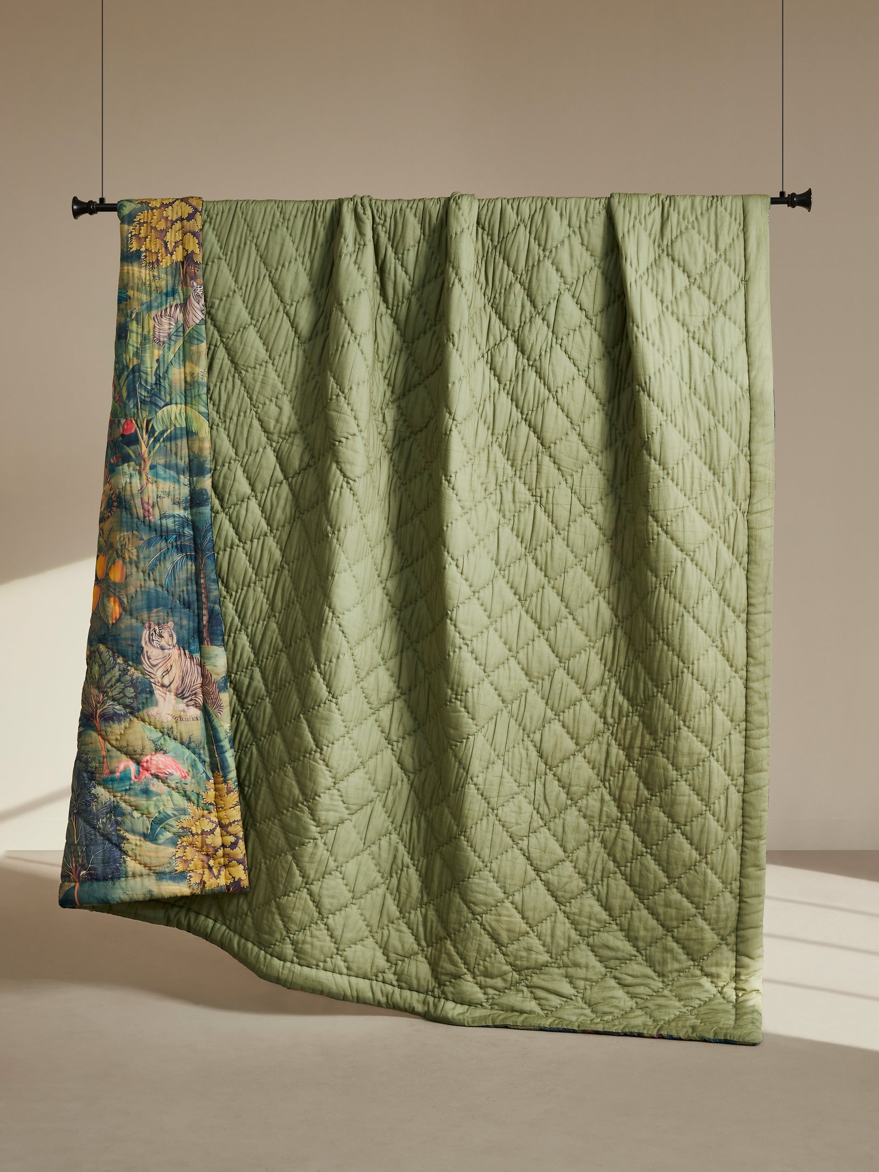 One side reveals a rich forest tableau painted in deep greens, ochres, and blues, filling your space with movement and character. The reverse shifts to a muted earthy green with a soft, calming undertone, offering a grounded, contemporary look for days when you prefer a quieter aesthetic. Soft, breathable, and meticulously hand-quilted, it carries a luxurious, tactile feel that makes it truly special.