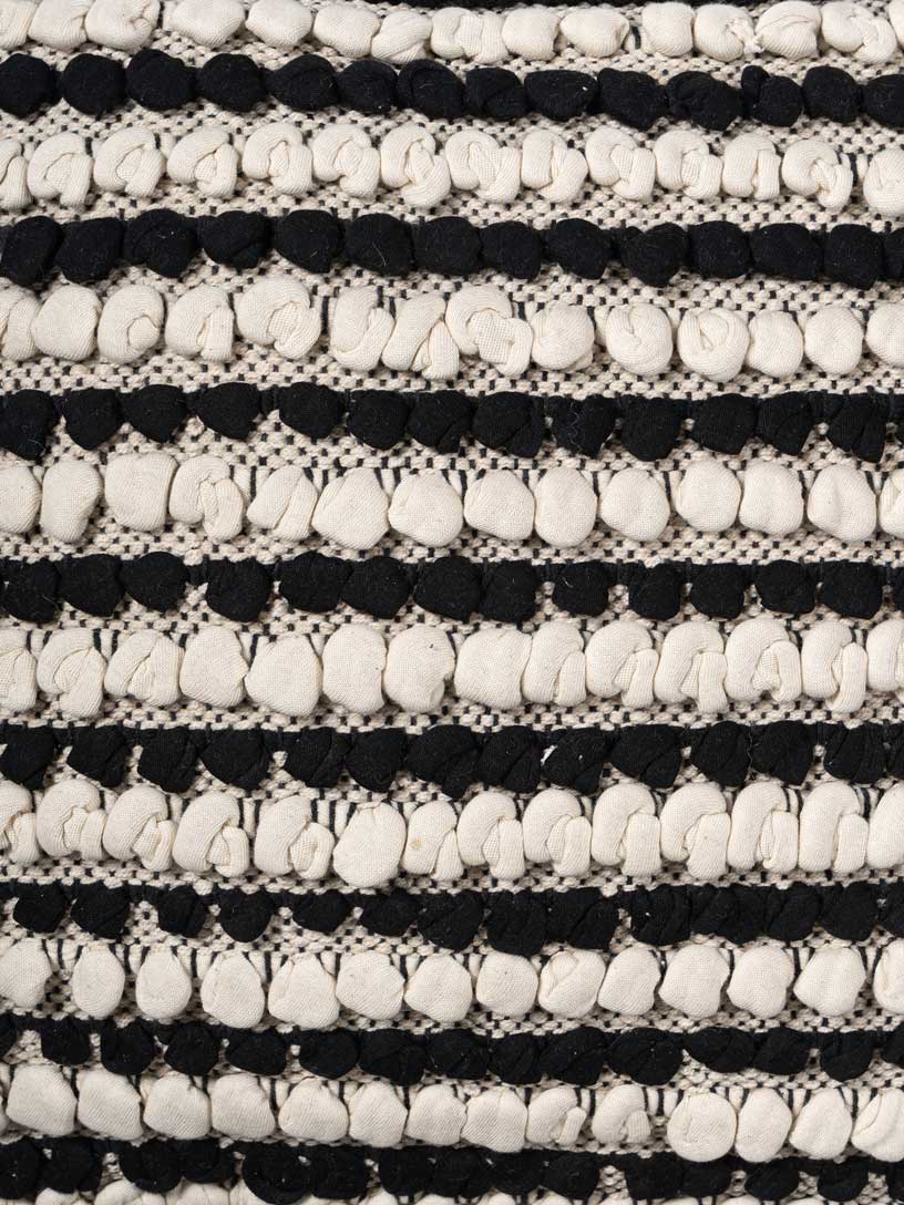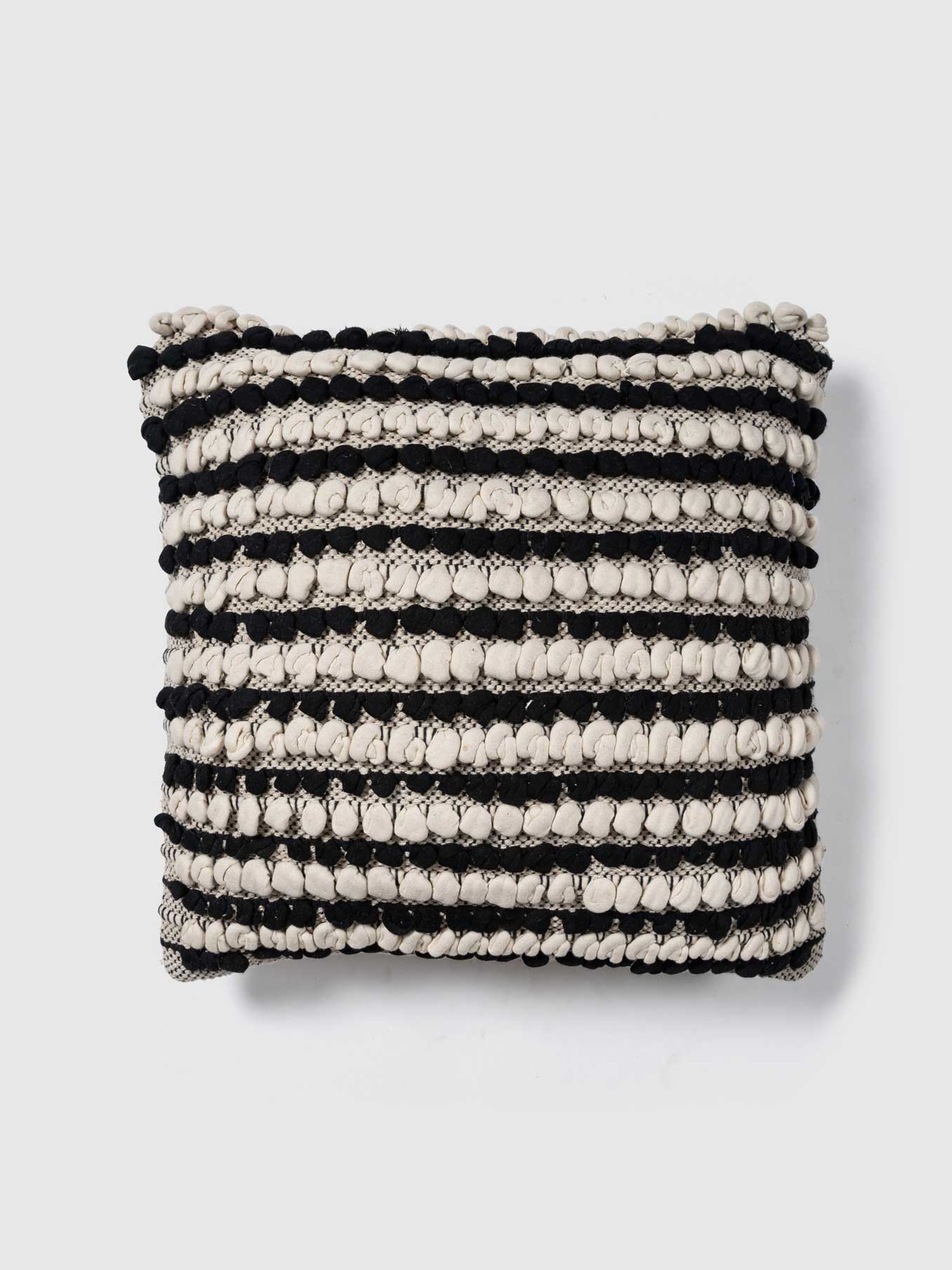 The Cushion Cover features a striking, textured design with horizontal rows of woven black and off-white threads. The material appears to be a mix of chunky loops and tight knots, giving it a tactile, handcrafted look. The alternating colors create a bold, yet rustic, geometric pattern perfect for modern decor.