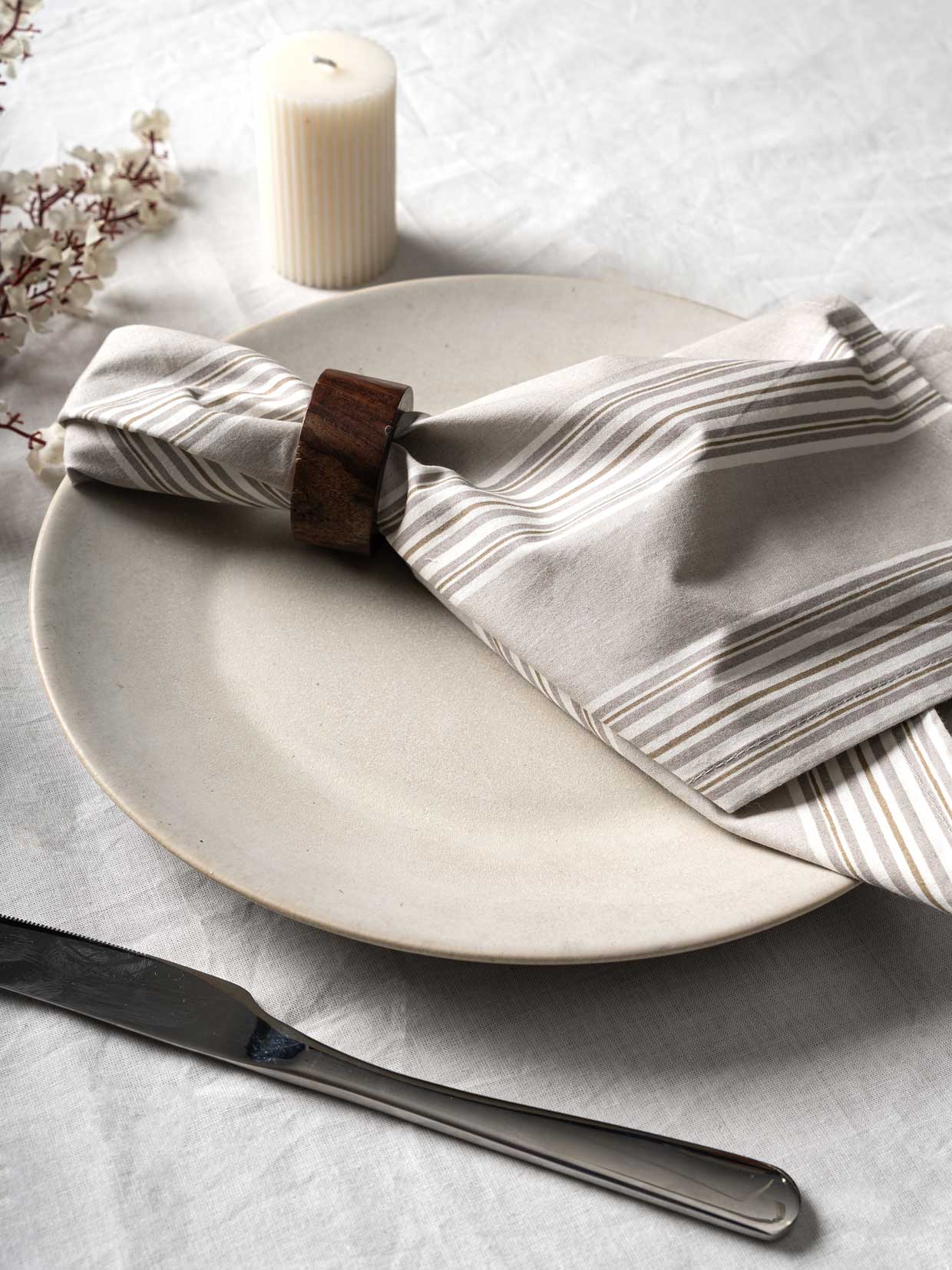 Enhance your dining experience with our Darcha Table Napkin. It showcases elegant, thin vertical stripes in a serene grey palette, bringing a refined yet understated look to the table setting. Ideal for both casual family meals and more formal gatherings, it effortlessly combines functionality with a classic aesthetic.