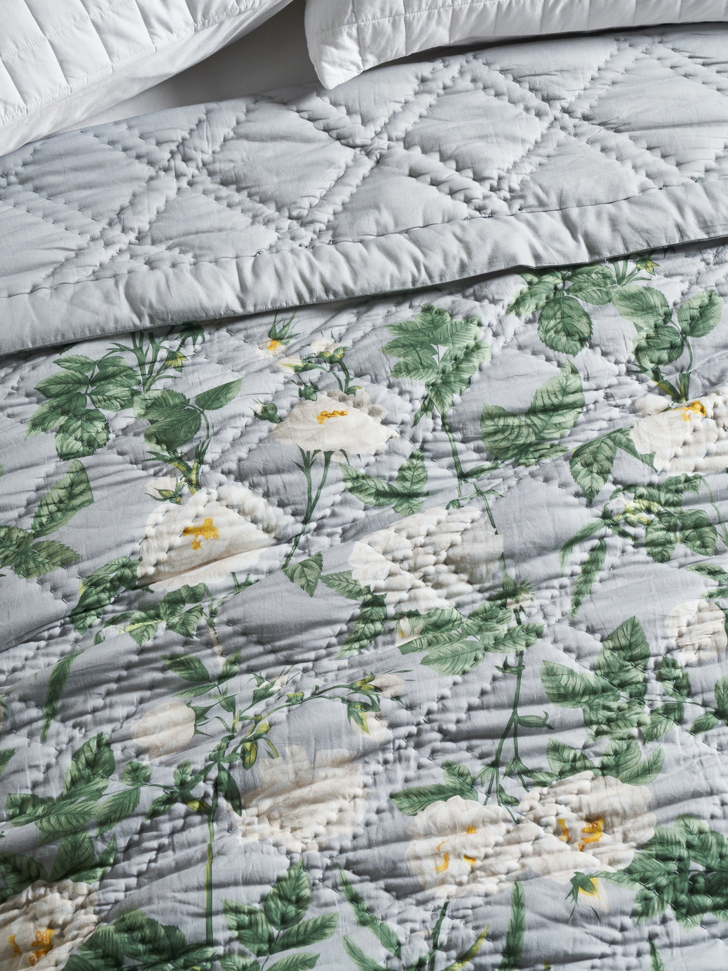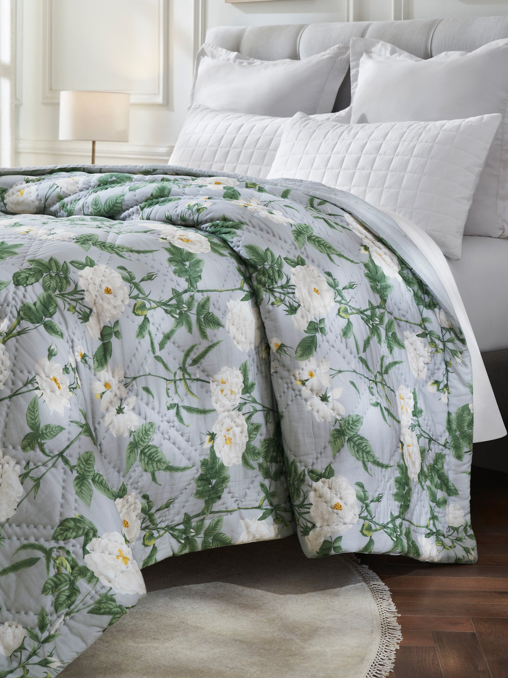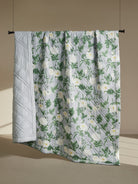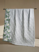 One side features a fresh garden-inspired pattern set against a cool grey base, creating a calm and airy bloomscape that feels timeless and refined. The reverse shifts to a soft dove-grey solid, offering a minimal, contemporary look perfect for days when you prefer simplicity and subtlety. Light, breathable, and enriched with hand-quilted texture, it promises year-round comfort with a luxurious, tactile finish.