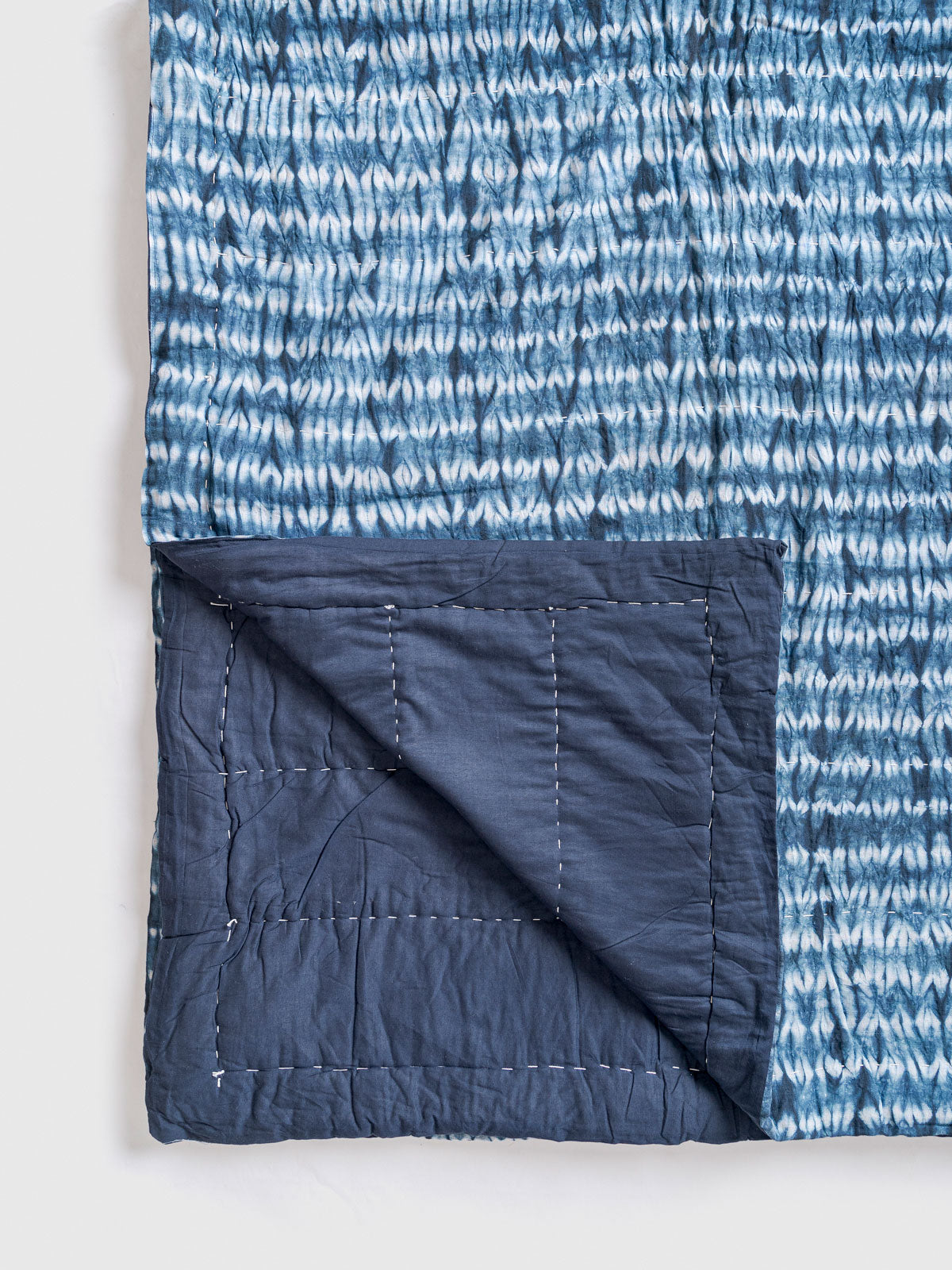 Each quilt is hand quilted with care, adding a gentle texture that enhances its comfort and gives the fabric a supple, breathable finish. The stitching moves organically across the tie-dye pattern, creating a smooth drape that makes the quilt easy to layer in every season.