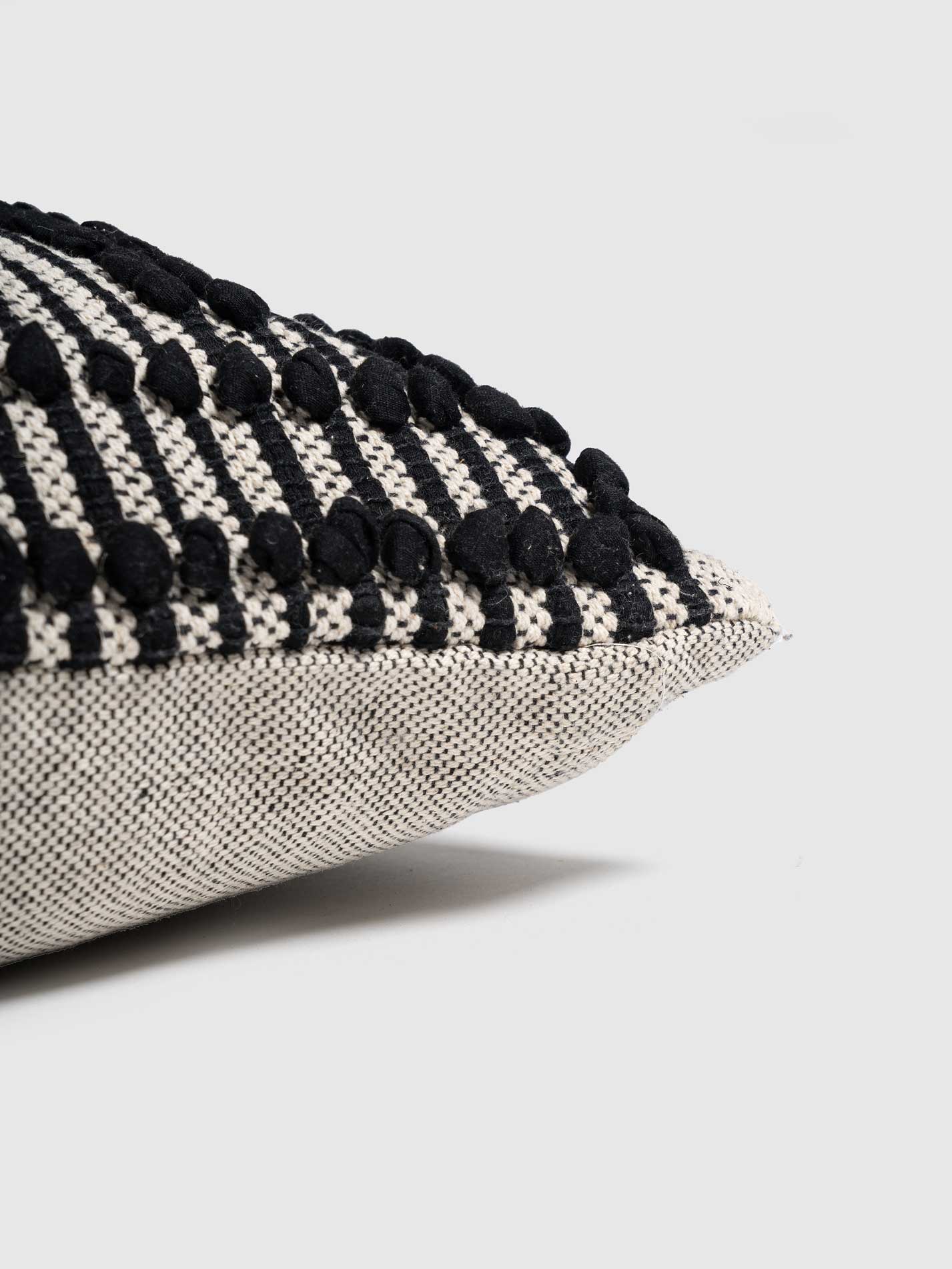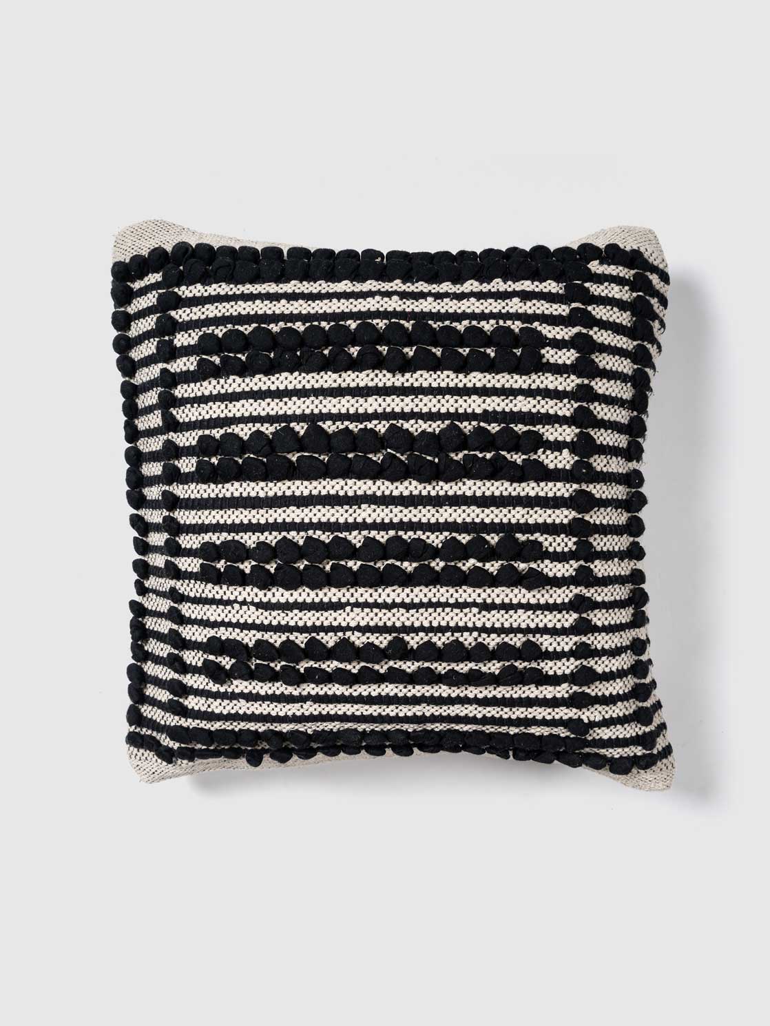 The Jaili Cushion Cover features a stylish black and white striped design with textured, raised black pom-poms arranged in horizontal rows. Made from durable, woven fabric, it adds a modern, tactile accent to any room. Ideal for minimalist or monochromatic decor styles, this cover is both chic and comfortable.