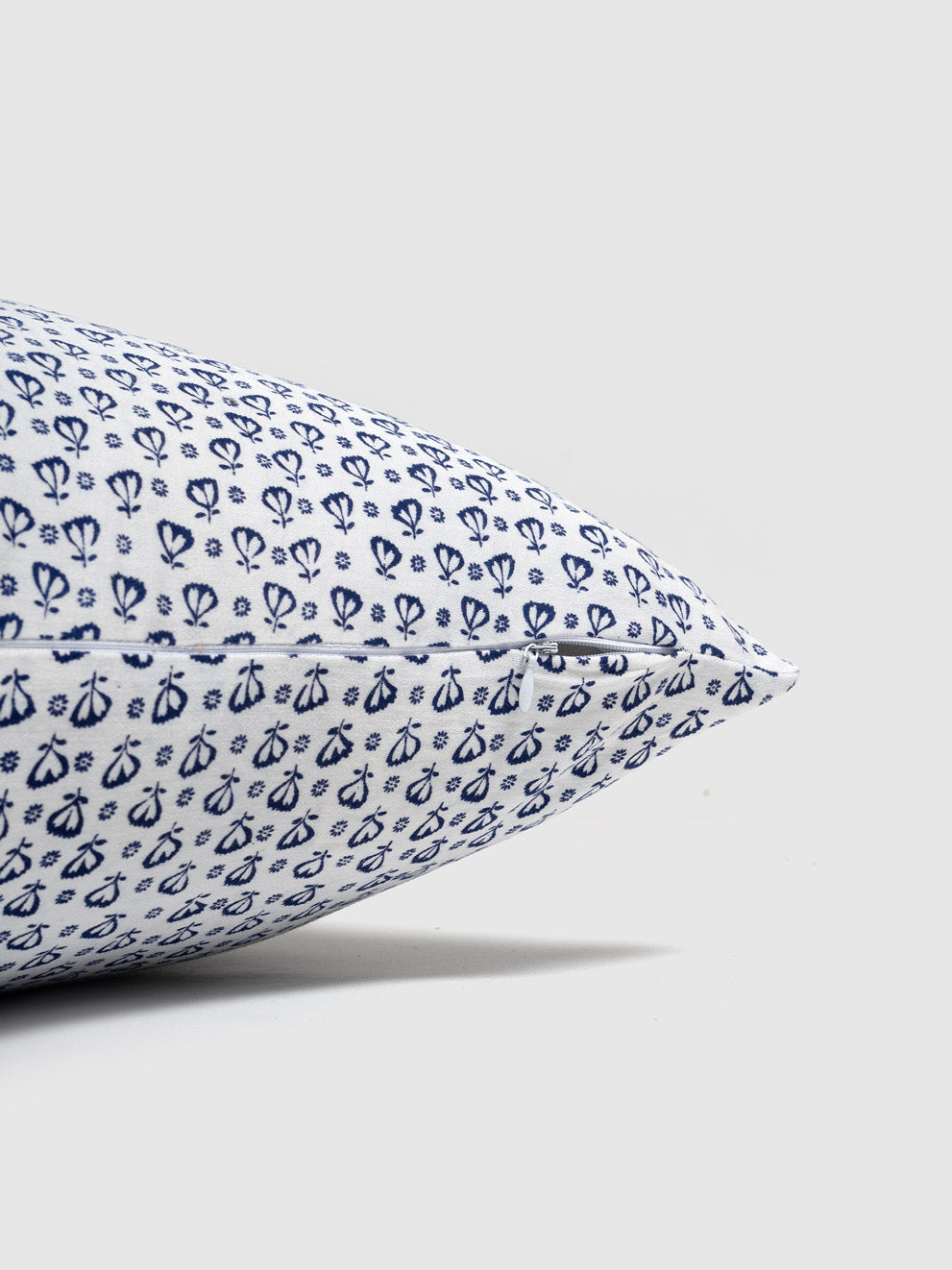Elevate your living space with this enchanting handcrafted cushion cover, adorned with intricate blue block-printed motifs on pristine white cotton. A celebration of artisanal craftsmanship, it offers a perfect blend of elegance and coziness. Whether styled on a sofa, bed, or chair, this versatile piece adds charm and character to any décor. Proudly designed and handcrafted in India!