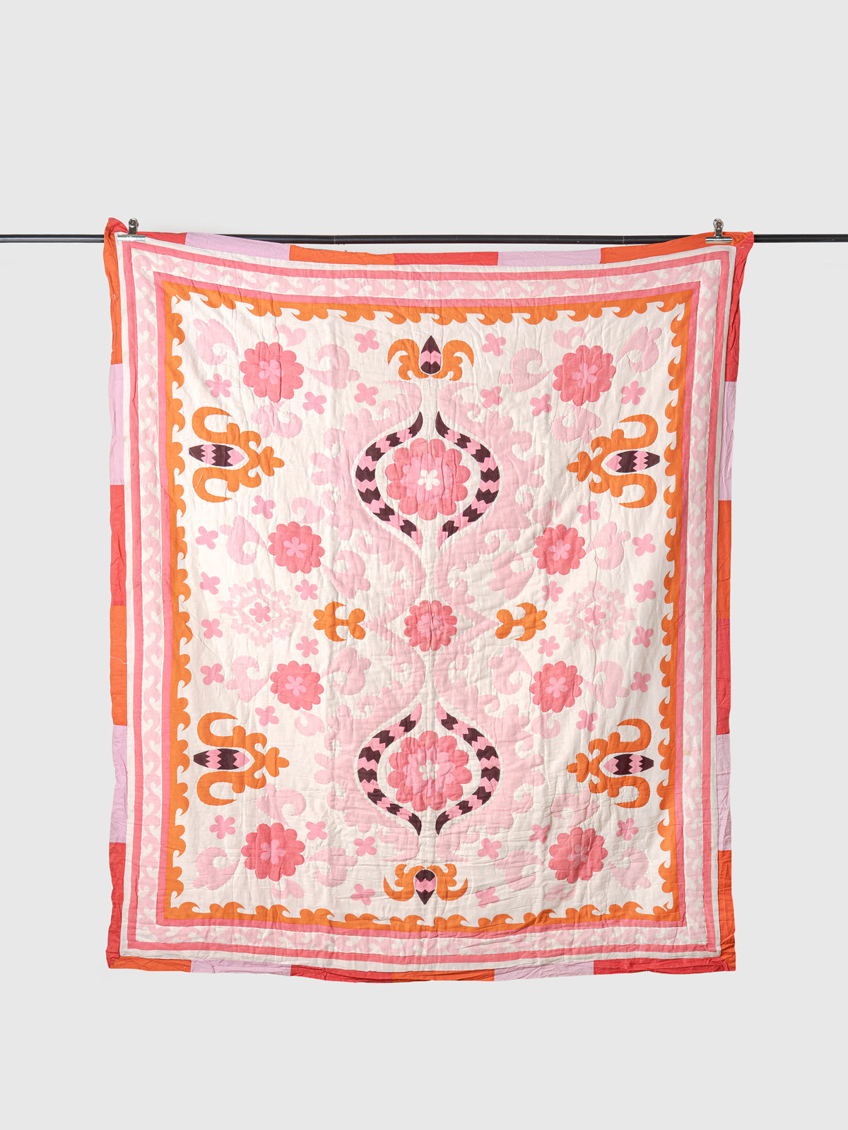 Each motif is printed by hand using age-old hand printing techniques that bring depth, personality and subtle variation to every quilt. Skilled artisans complete the piece with delicate hand quilting that adds softness, texture and a breathable feel perfect for all seasons. The lively palette and intricate detailing make this quilt a true statement piece for any room.