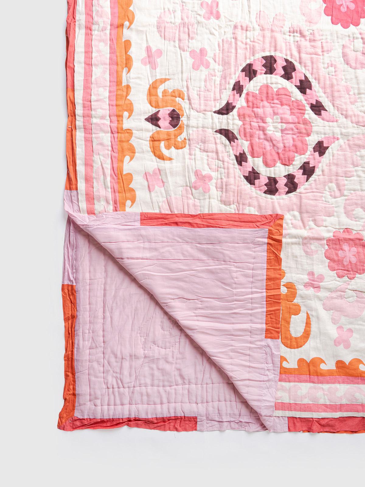 The Rani Bagh Printed Quilt celebrates the beauty and grandeur of traditional Indian textile art through its vibrant colours and regal floral motifs. The quilt features a graceful composition of blooming flowers, detailed vines and symmetrical ornamental patterns in shades of rani pink, coral, peach and soft ivory. The bold borders frame the artwork beautifully, creating a piece that feels joyful, feminine and wonderfully expressive.