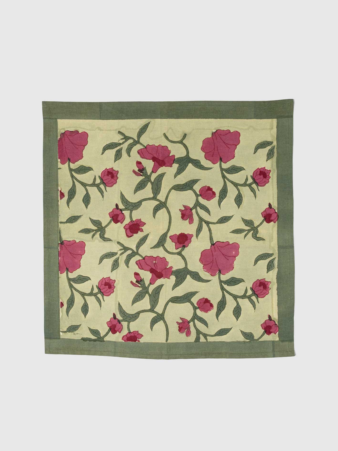 Bring a touch of spring to your table setting with the "Rouen" napkin. Adorned with vibrant magenta blooms and soft green foliage on a serene background, this hand print napkin infuses any meal with floral charm. Ideal for enhancing your dining ambiance with a splash of nature's beauty.
