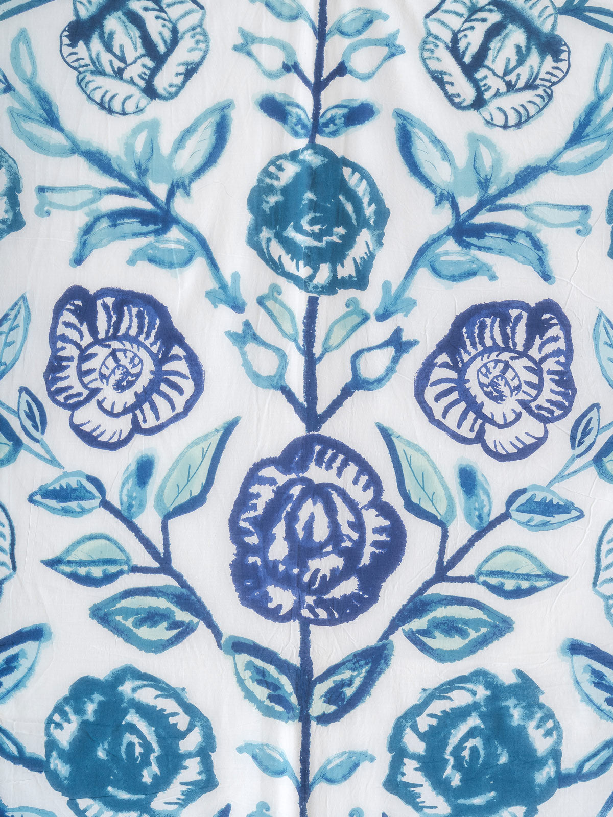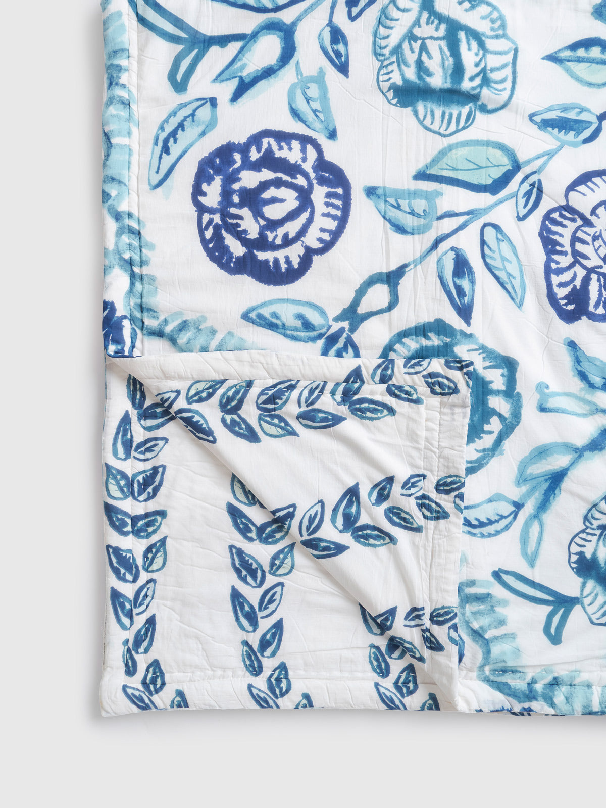 Each rose and leaf is printed by hand using traditional Sanganeri wooden blocks, a craft known for its fine detailing and flowing lines. Skilled artisans then complete the quilt with gentle hand quilting that adds a breathable, lightweight texture perfect for year-round comfort. The soothing colours and striking botanical layout make this quilt a beautiful centrepiece for any space.