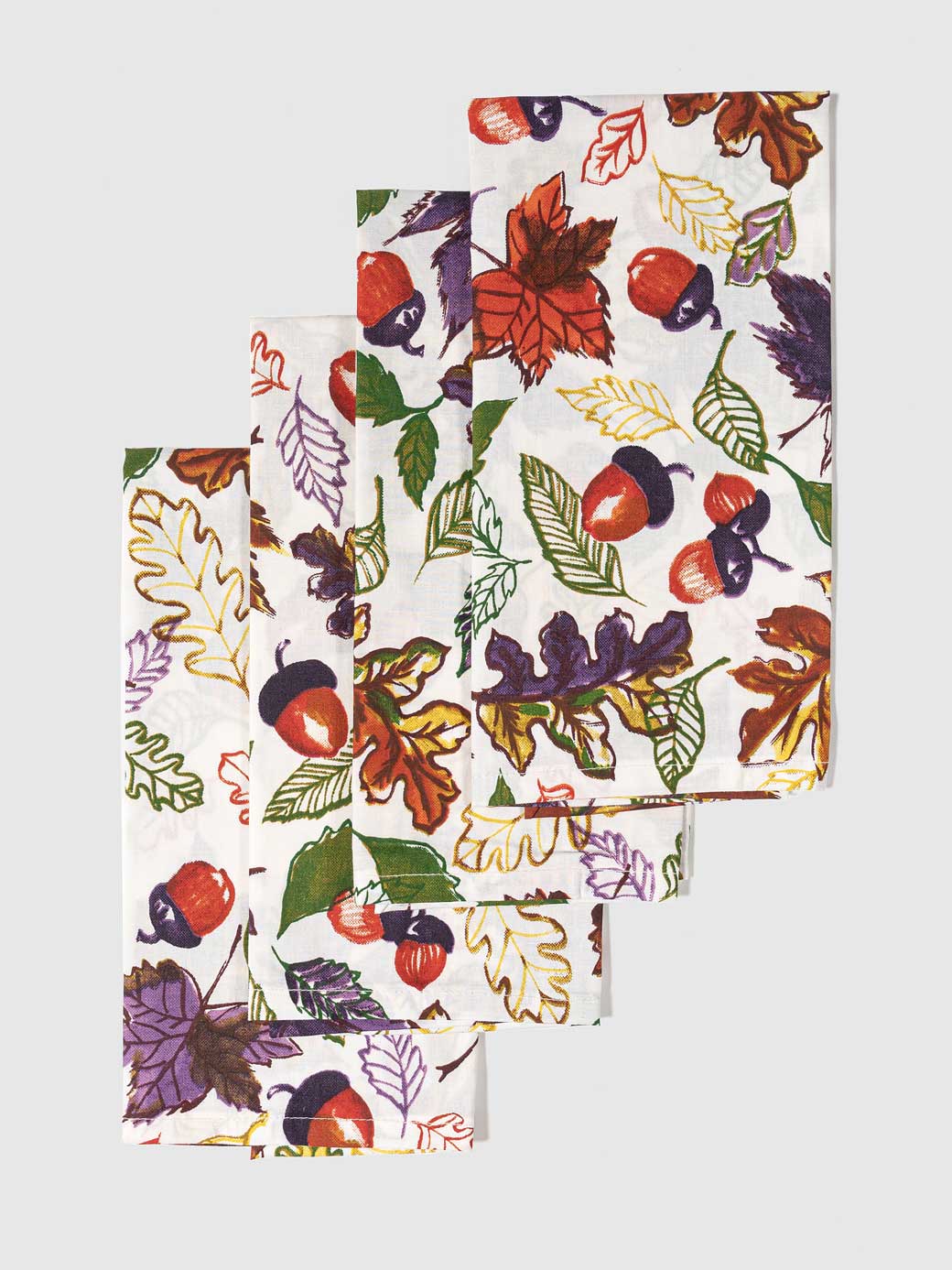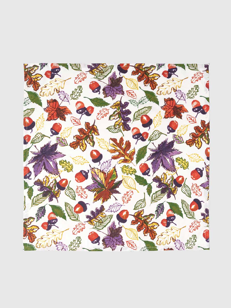 Thaneri, bursting with a vivid, botanical print, featuring a lively array of autumn hued leaves and berries on a crisp white background. This digital printed table napkin captures the essence of a bountiful harvest, making it the perfect complement to your seasonal table decor.