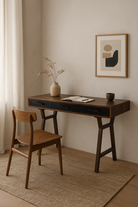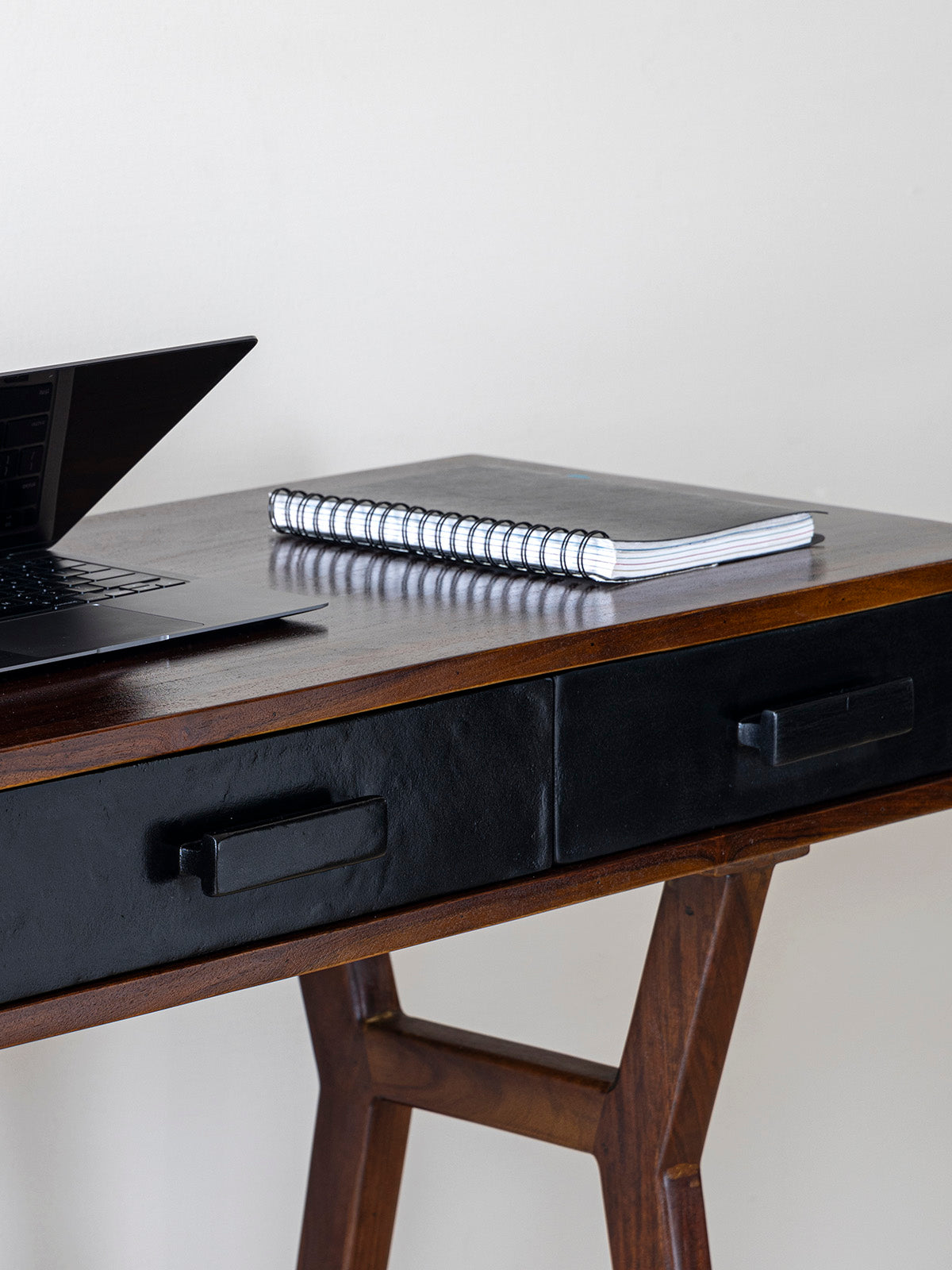 Introducing to you our Sakri working desk, crafted from mango wood and featuring details of a mid century modern style. It follows a versatile design language, combining aesthetics with functional attributes.