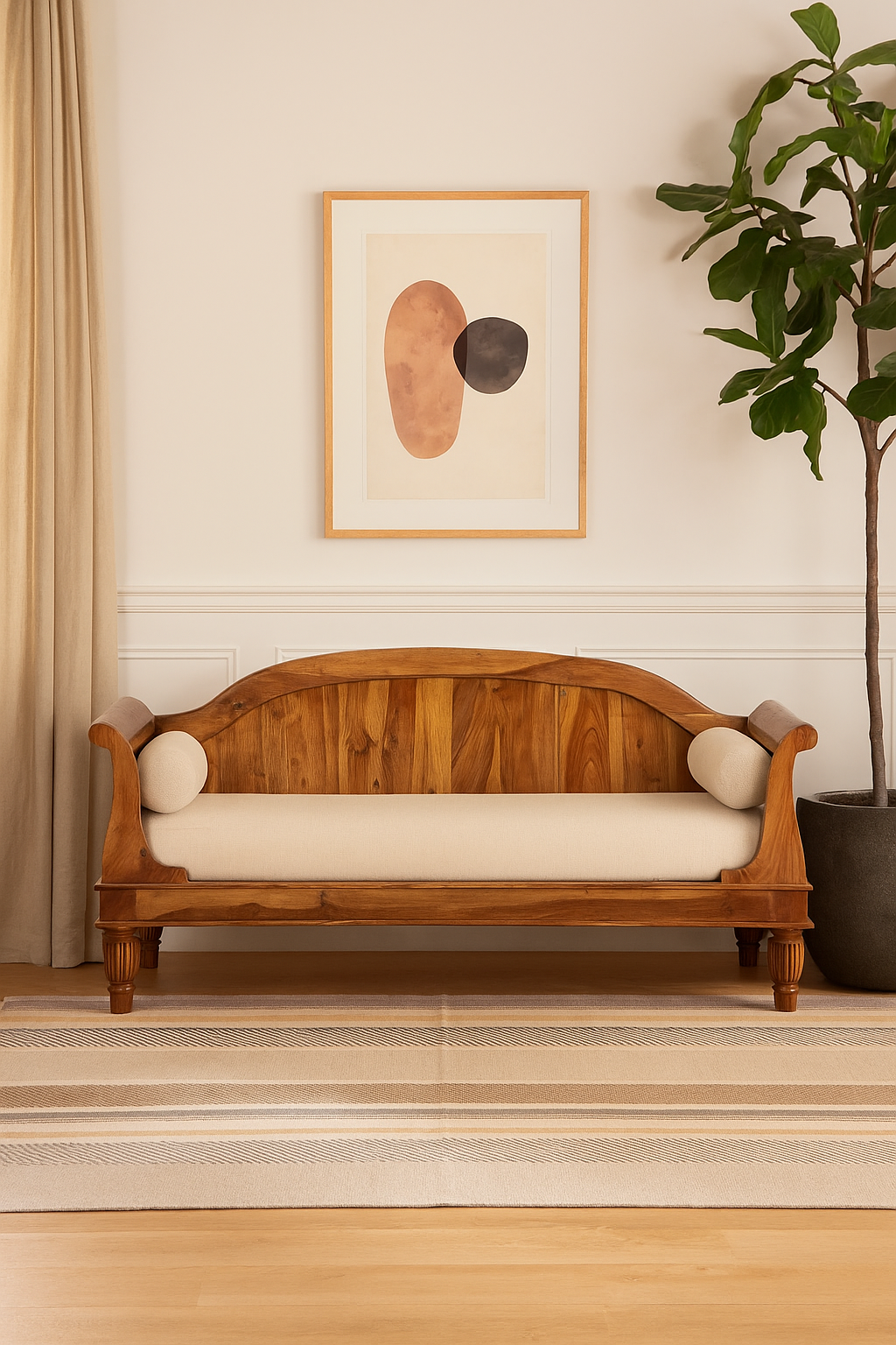 Aangan Sheesham Wood Upholstered Sofa brings timeless Indian warmth into your home. Crafted from solid sheesham wood, it carries a natural grain that feels rich, grounding, and beautifully organic. The clean lines and sturdy frame make it a piece you can trust for everyday comfort, while its handcrafted details add quiet elegance to any room. Whether placed in your living area or a cozy corner, it becomes an inviting spot to unwind. A piece that feels at home the moment it arrives.