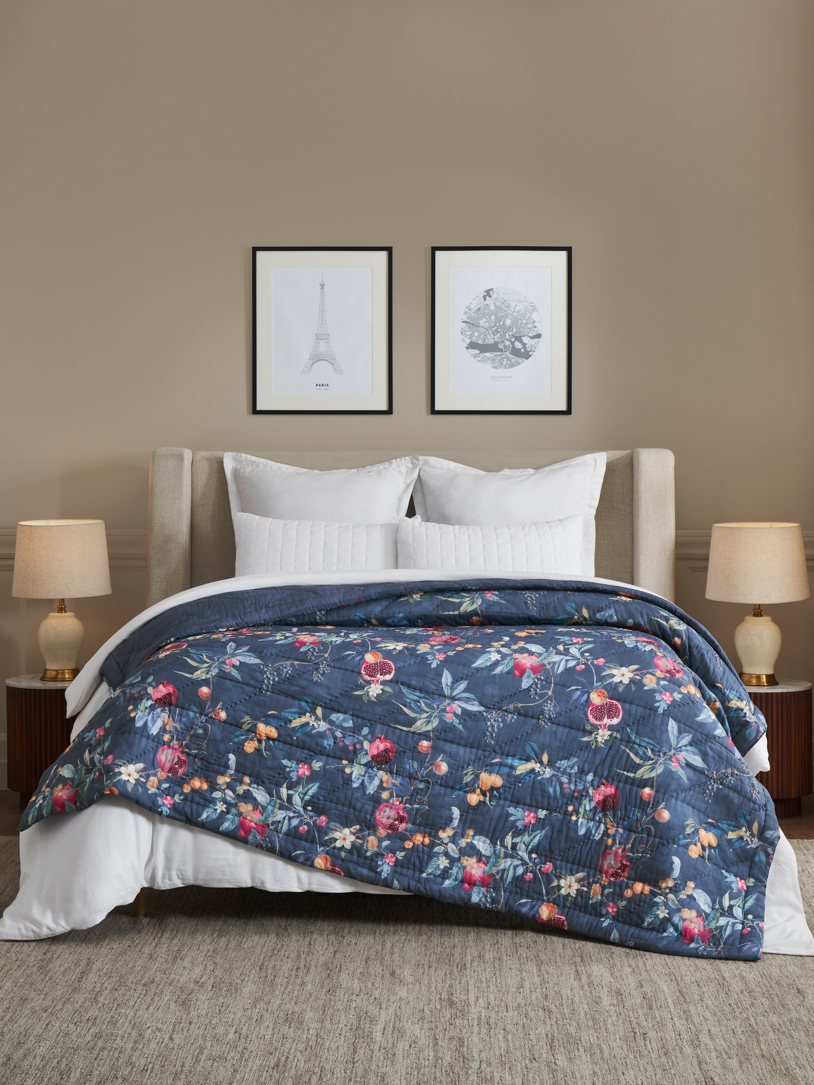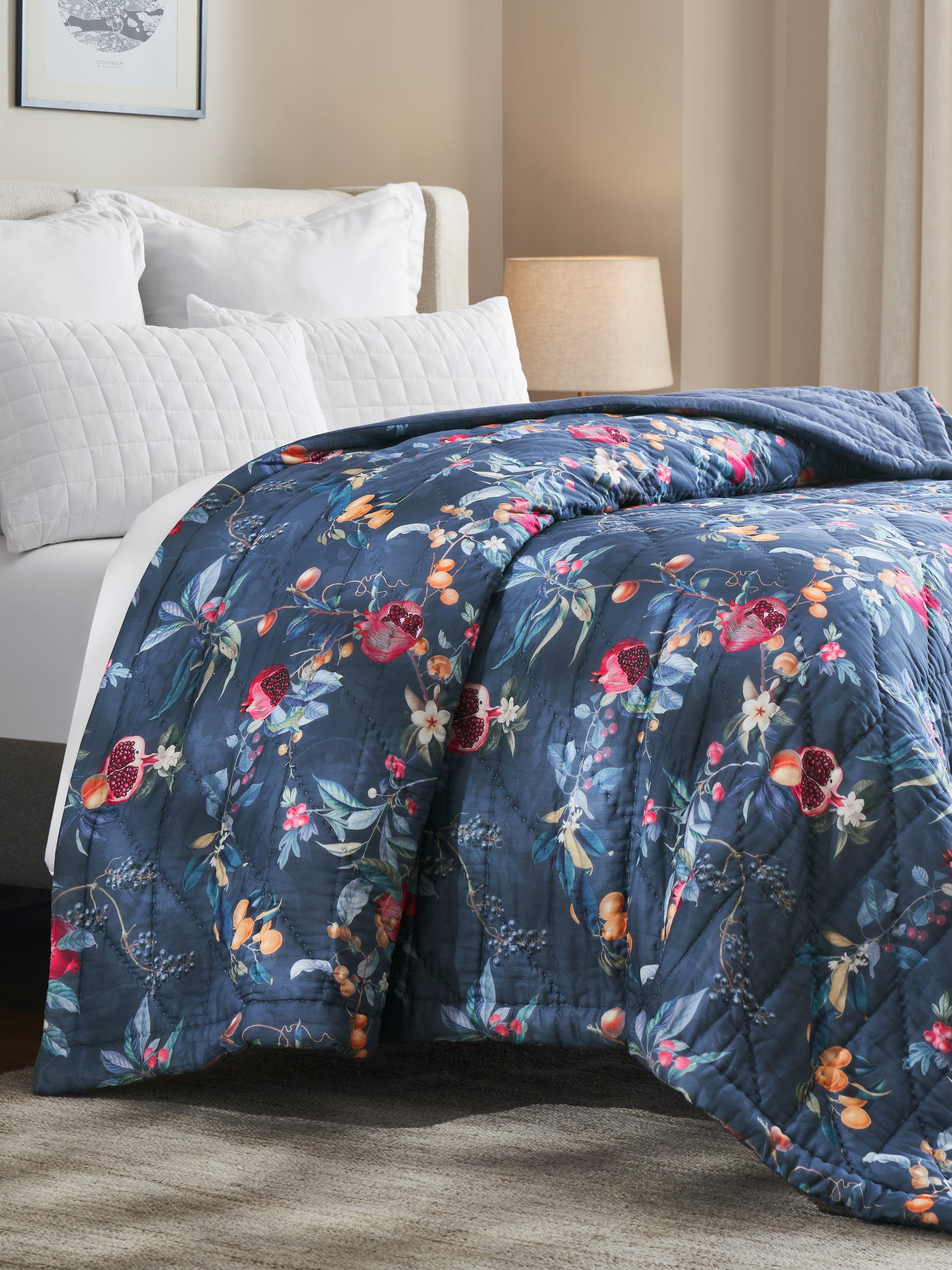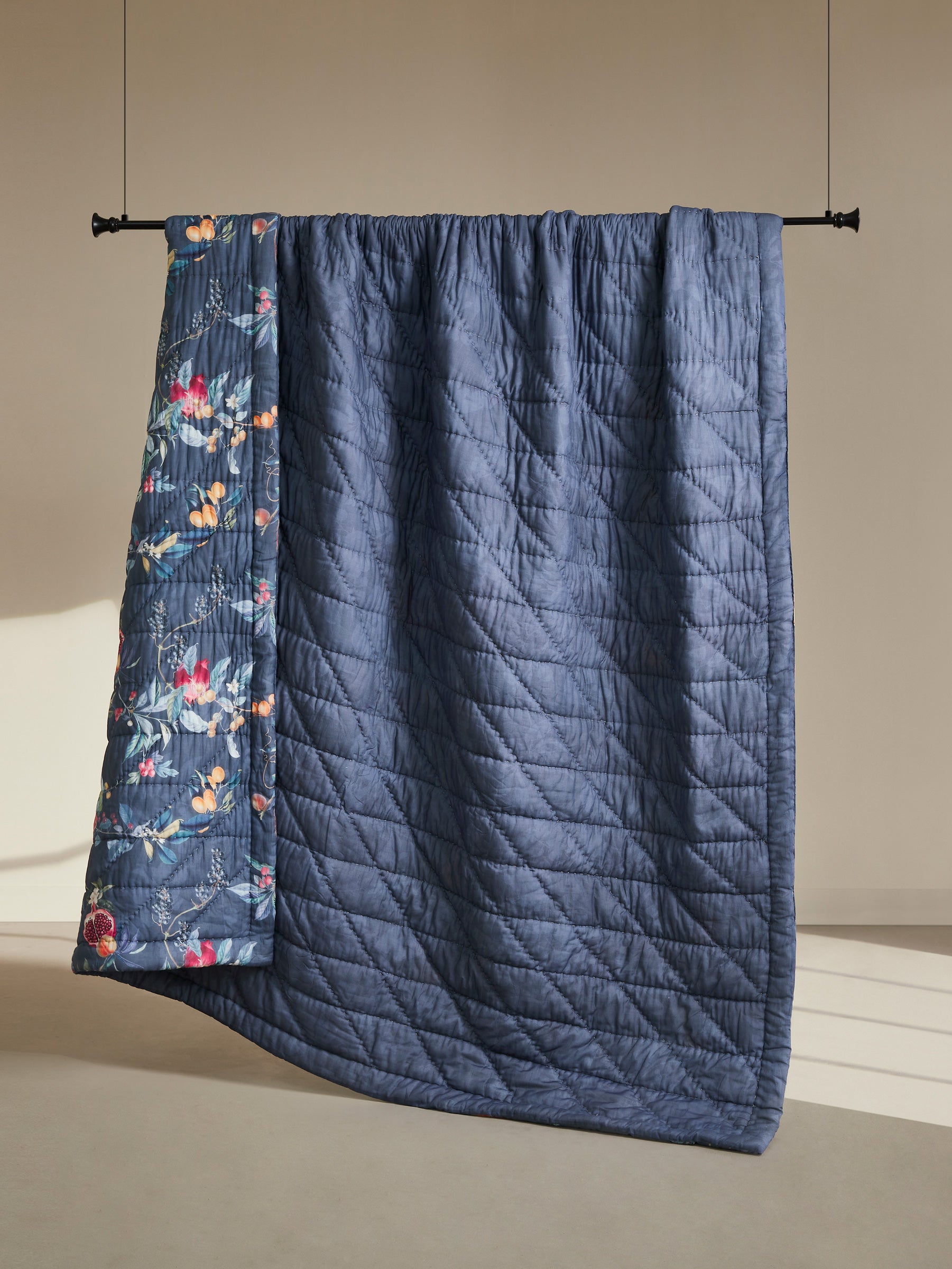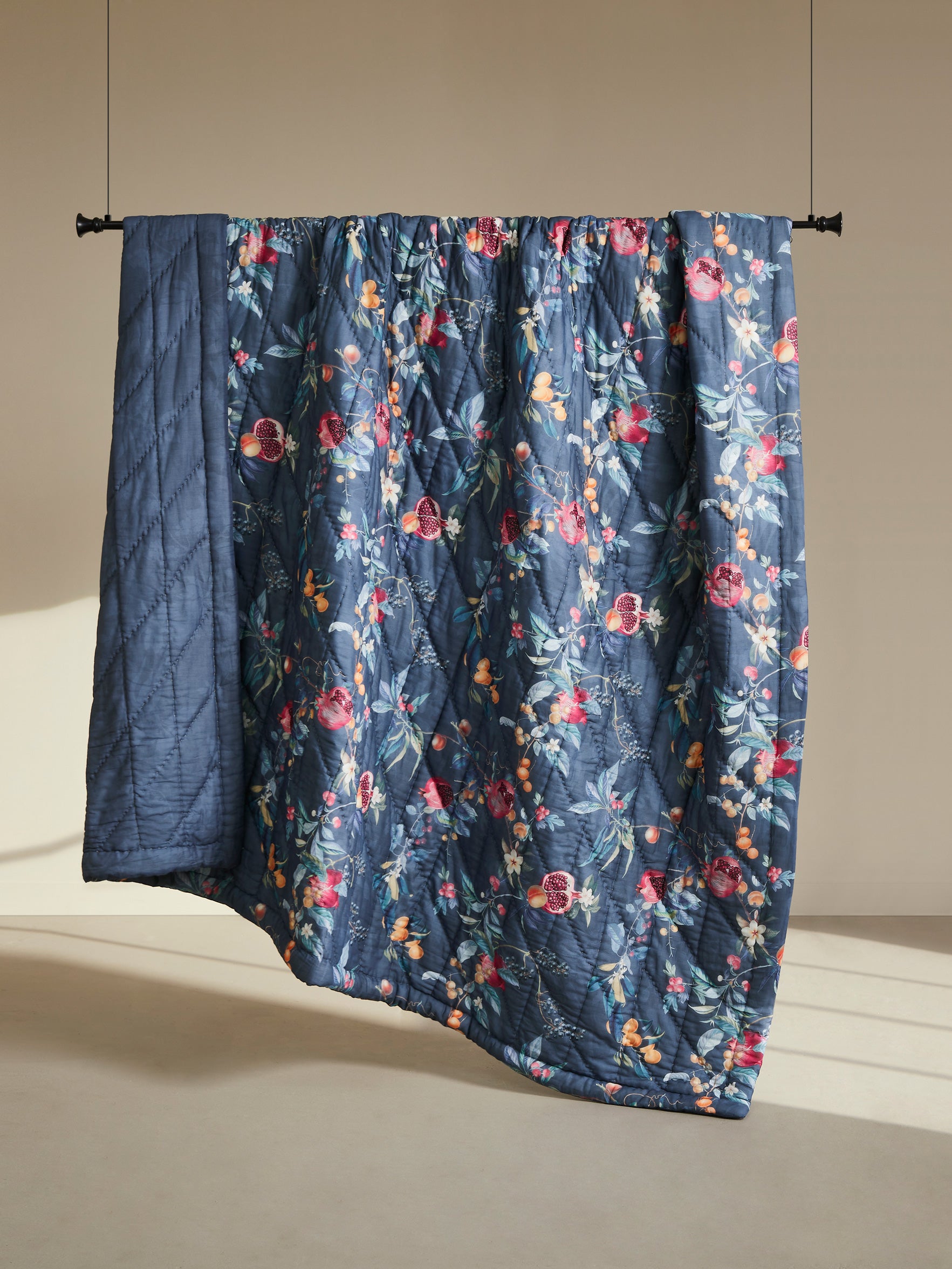 One side features a lush arrangement of fruits and florals layered over a deep twilight-blue base, giving the quilt a beautifully opulent, nature-inspired presence. The reverse softens into a subtle tonal pattern on the same blue background, offering a calmer, understated mood whenever you want a more minimal look. Light, breathable, and exquisitely quilted, it promises year-round comfort with a refined, textured finish.