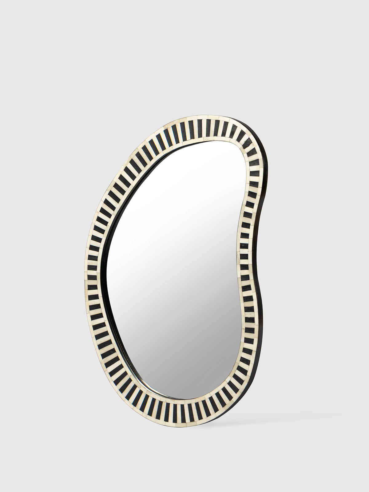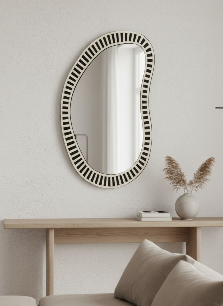 A statement of craftsmanship and elegance, this scalloped mirror is hand-finished with intricate bone inlay detailing. The petal-inspired silhouette softens the design, adding a graceful charm that feels both modern and timeless. Perfect for hallways, bedrooms, or above a console, it brightens spaces while doubling as a captivating wall accent. Each piece is unique, showcasing the artistry and heritage of inlay work.