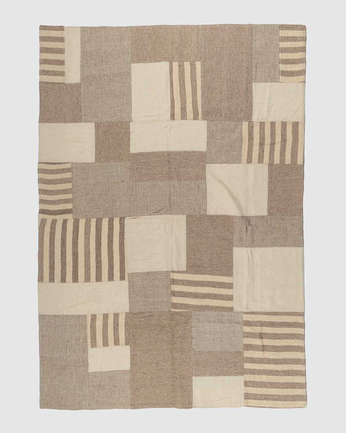 Each patch is individually handwoven using premium wool, giving the rug a rich tactile feel along with the durability needed for everyday living. The varied textures and woven patterns add depth without overwhelming the space, making this rug ideal for interiors that embrace calm simplicity and natural materials.