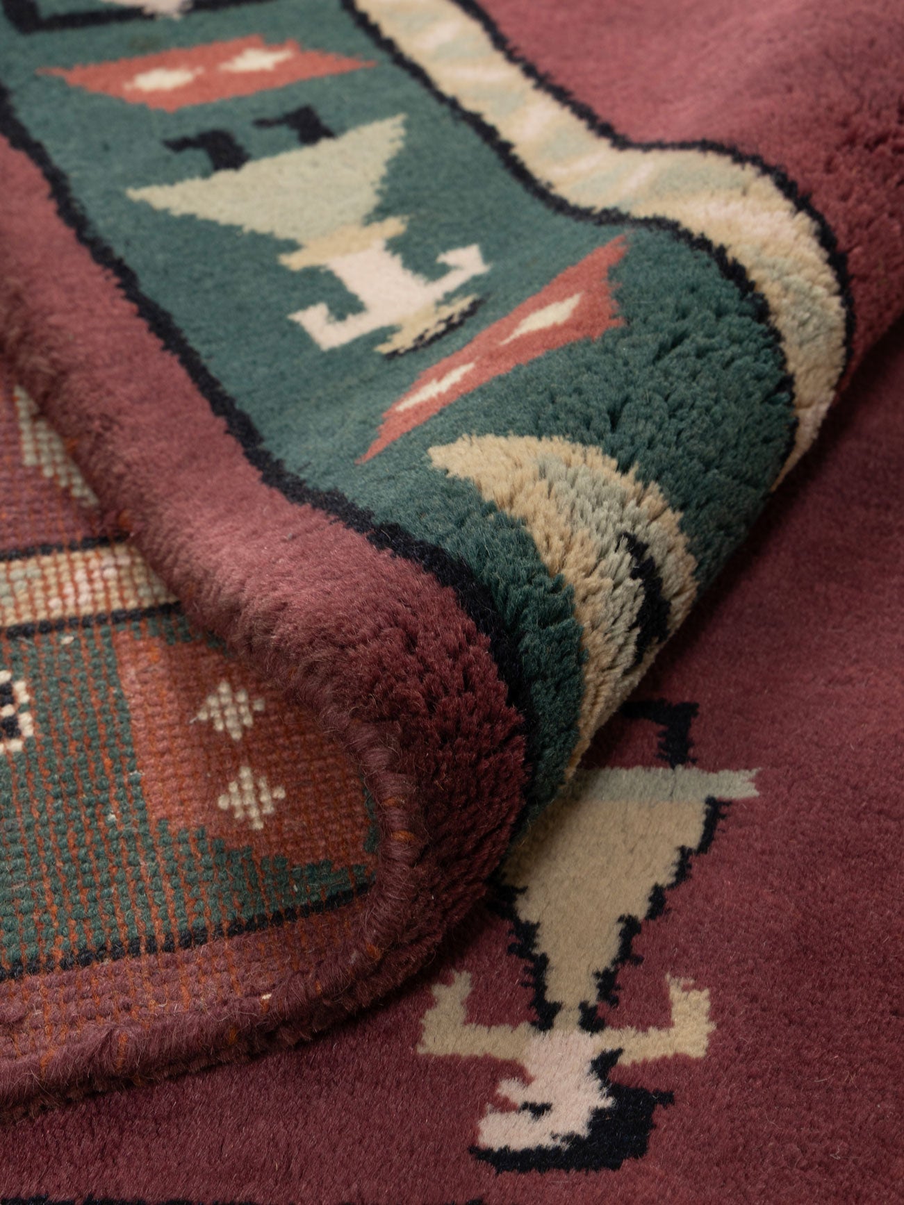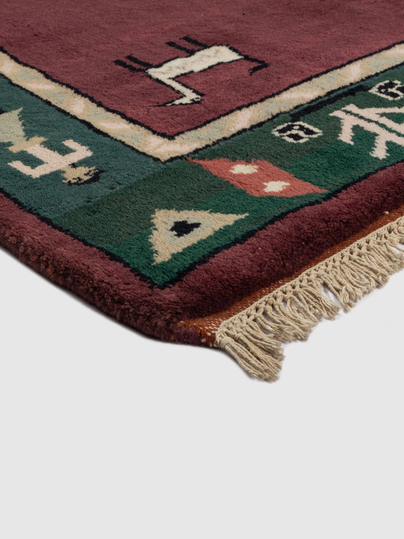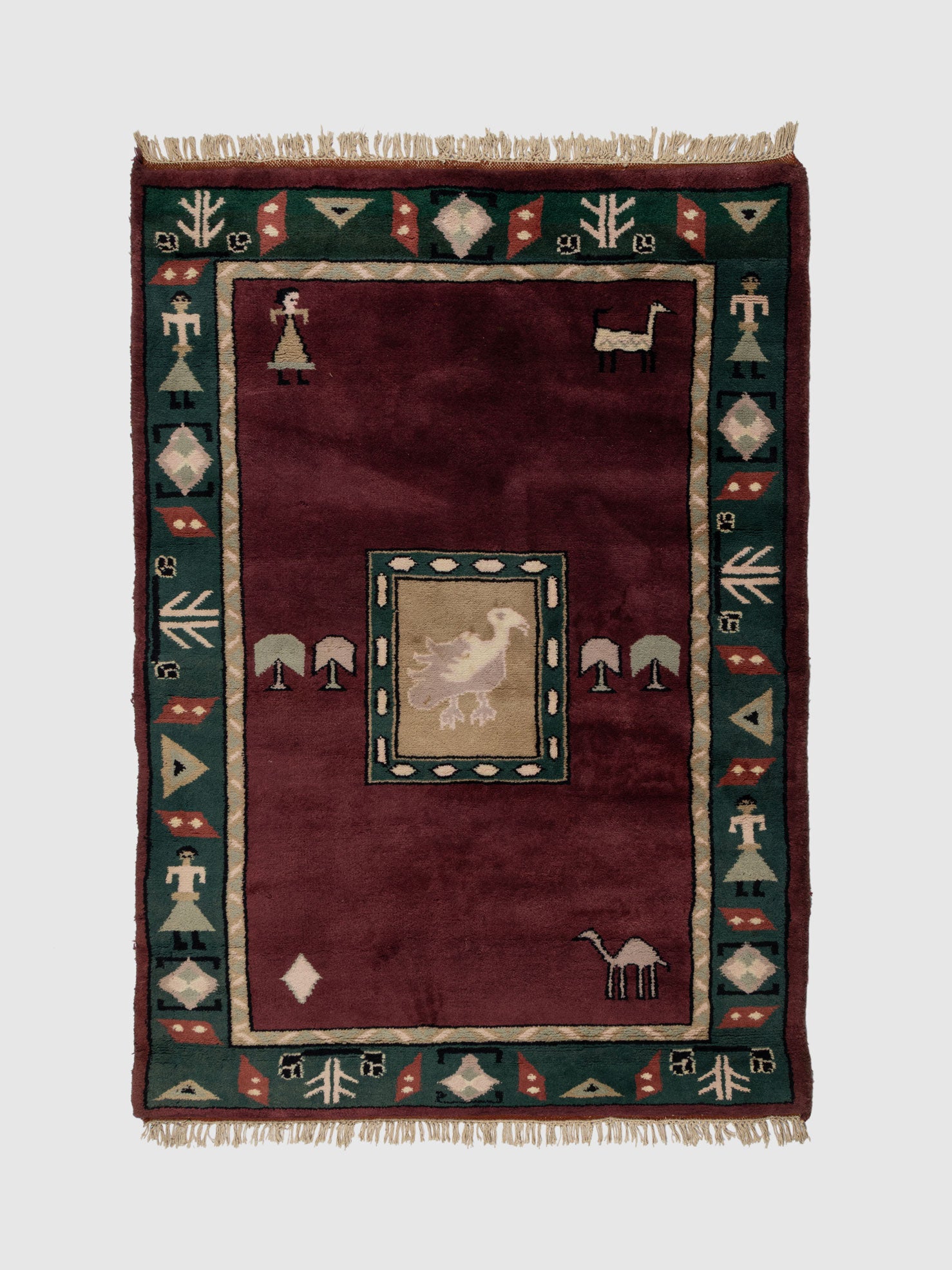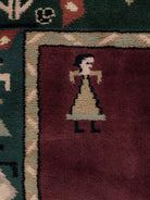 Celebrate heritage craftsmanship with the Hainan Wool Knotted Carpet, a beautifully hand knotted rug that blends bold colour with symbolic artistry. Set against a deep wine-toned base, the rug features a striking border in forest green adorned with traditional motifs inspired by folklore and pastoral life. The central panel showcases a delicately framed animal figure, adding storytelling depth and a distinct artisanal character.