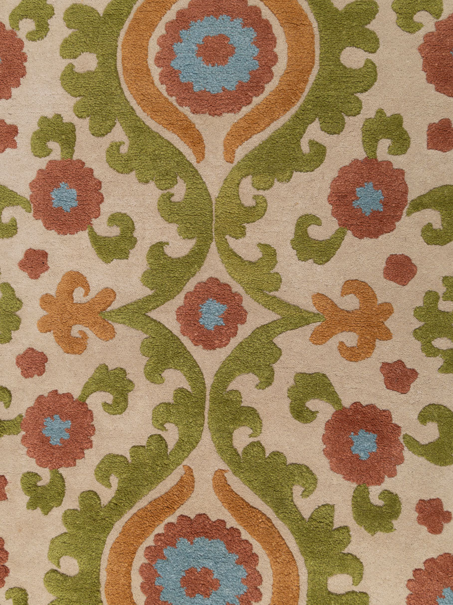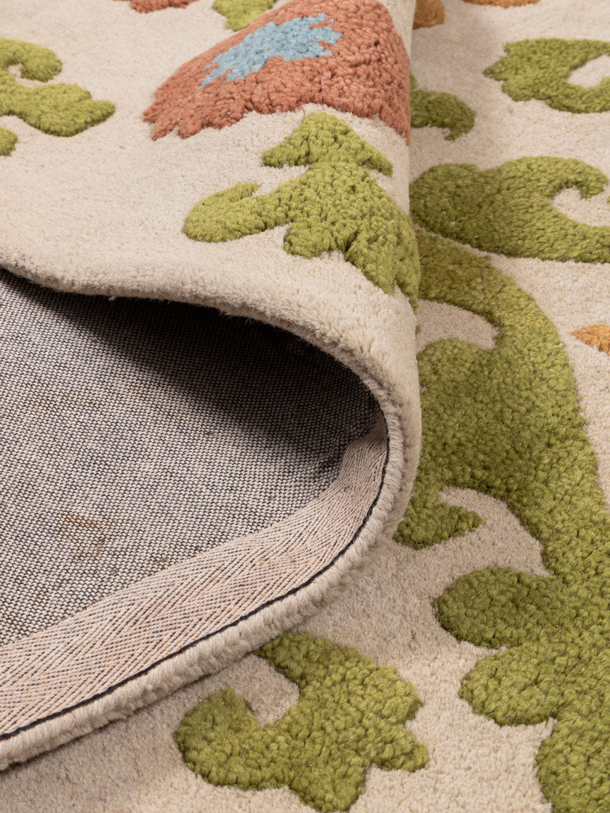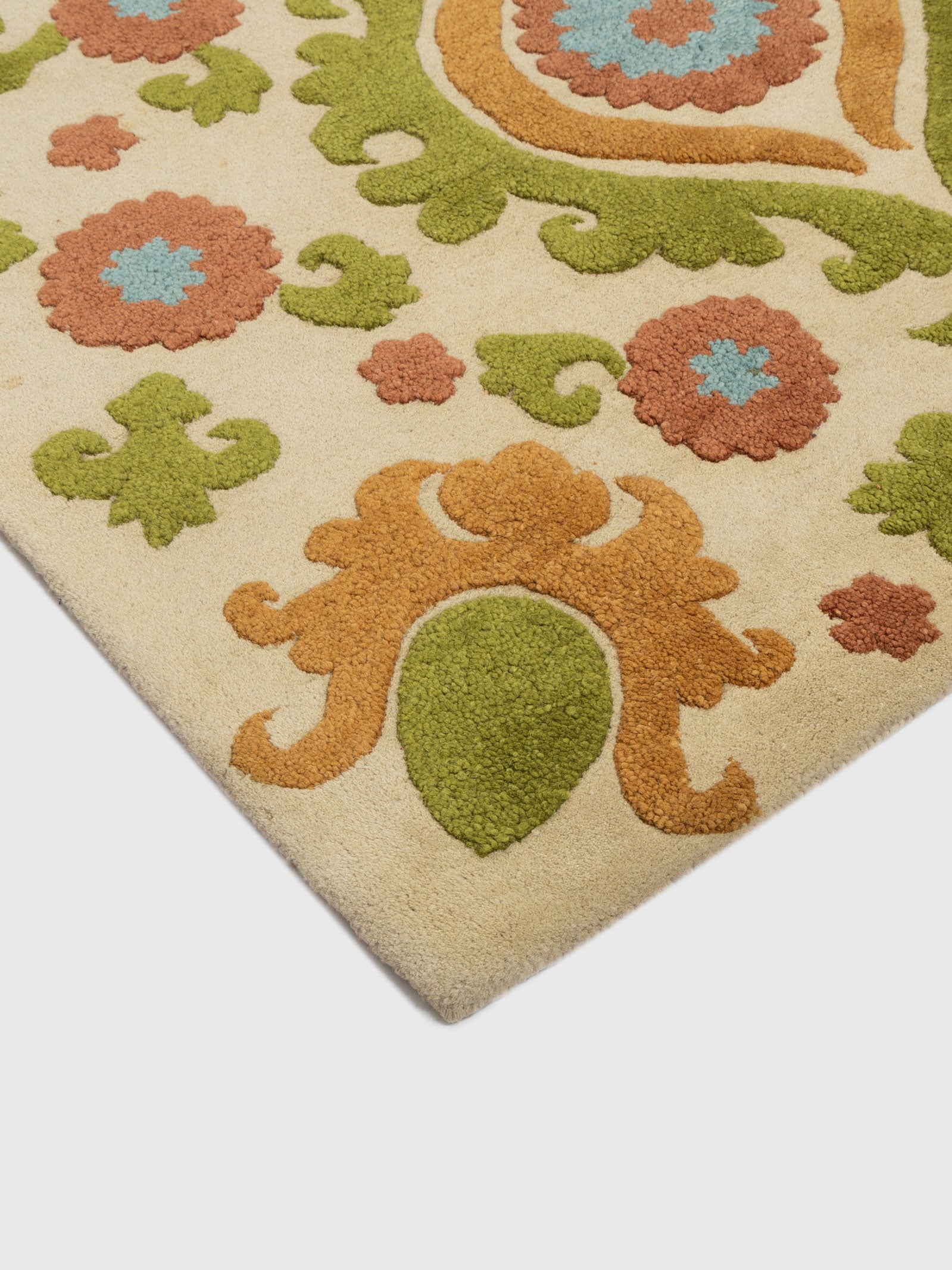 Brighten your home with the lively artistry of the Kisona Wool Tufted Carpet. Crafted from high quality wool, this design features a beautiful arrangement of stylised florals and ornamental motifs in warm earthy tones. Shades of olive green, terracotta, turquoise and soft gold come together on a neutral base, creating a balanced blend of tradition and contemporary charm.