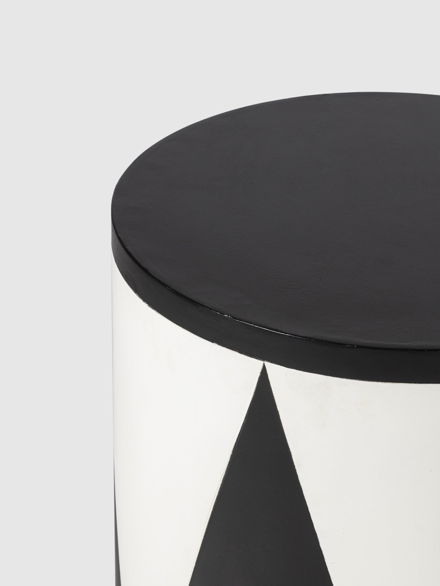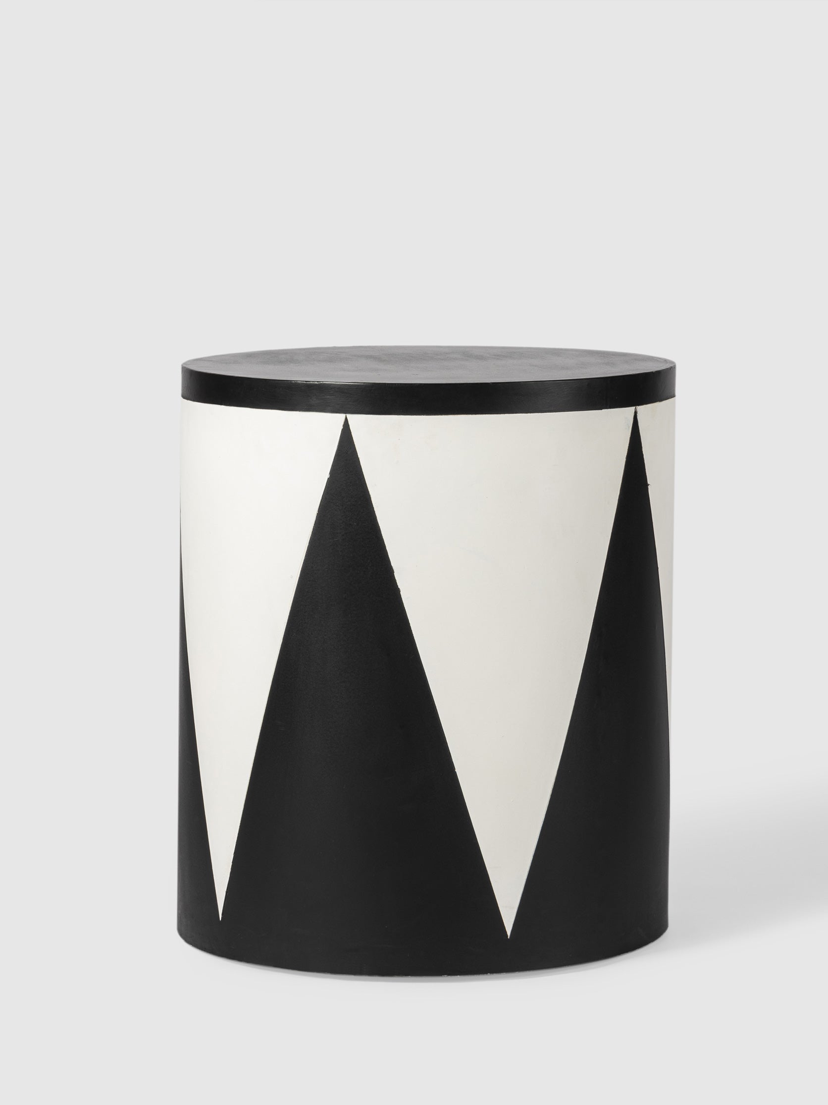 Bold and artistic, this handcrafted drum side table is a statement piece for any modern or eclectic space. Featuring a striking black and white geometric pattern, its clean cylindrical form adds a contemporary edge while maintaining a timeless appeal. The sturdy build makes it perfect for use as a side table, accent stool, or even a stylish pedestal for décor pieces. Whether placed in a living room, bedroom, or lounge, this eye-catching design brings a dynamic and sophisticated touch to your interiors.