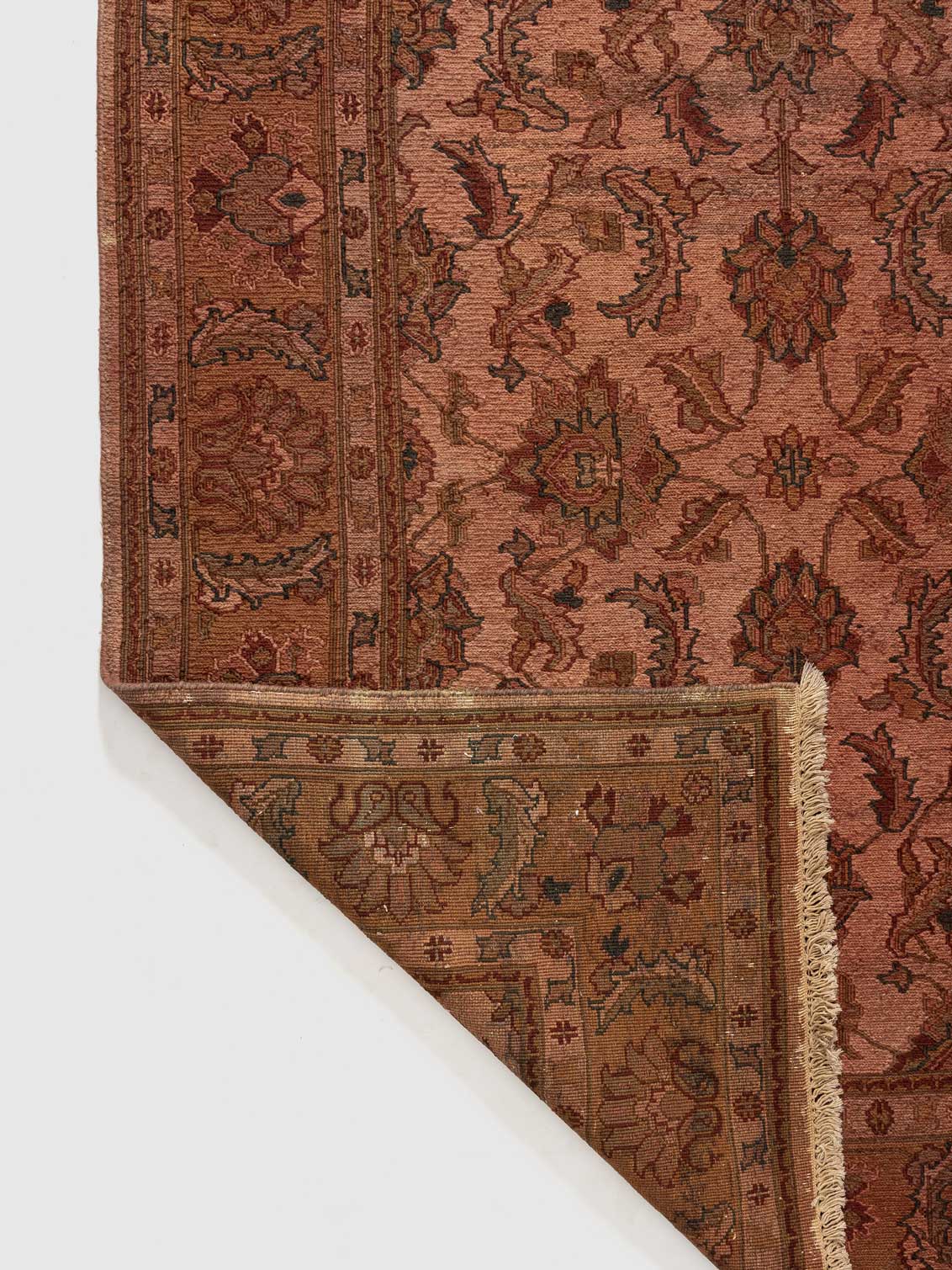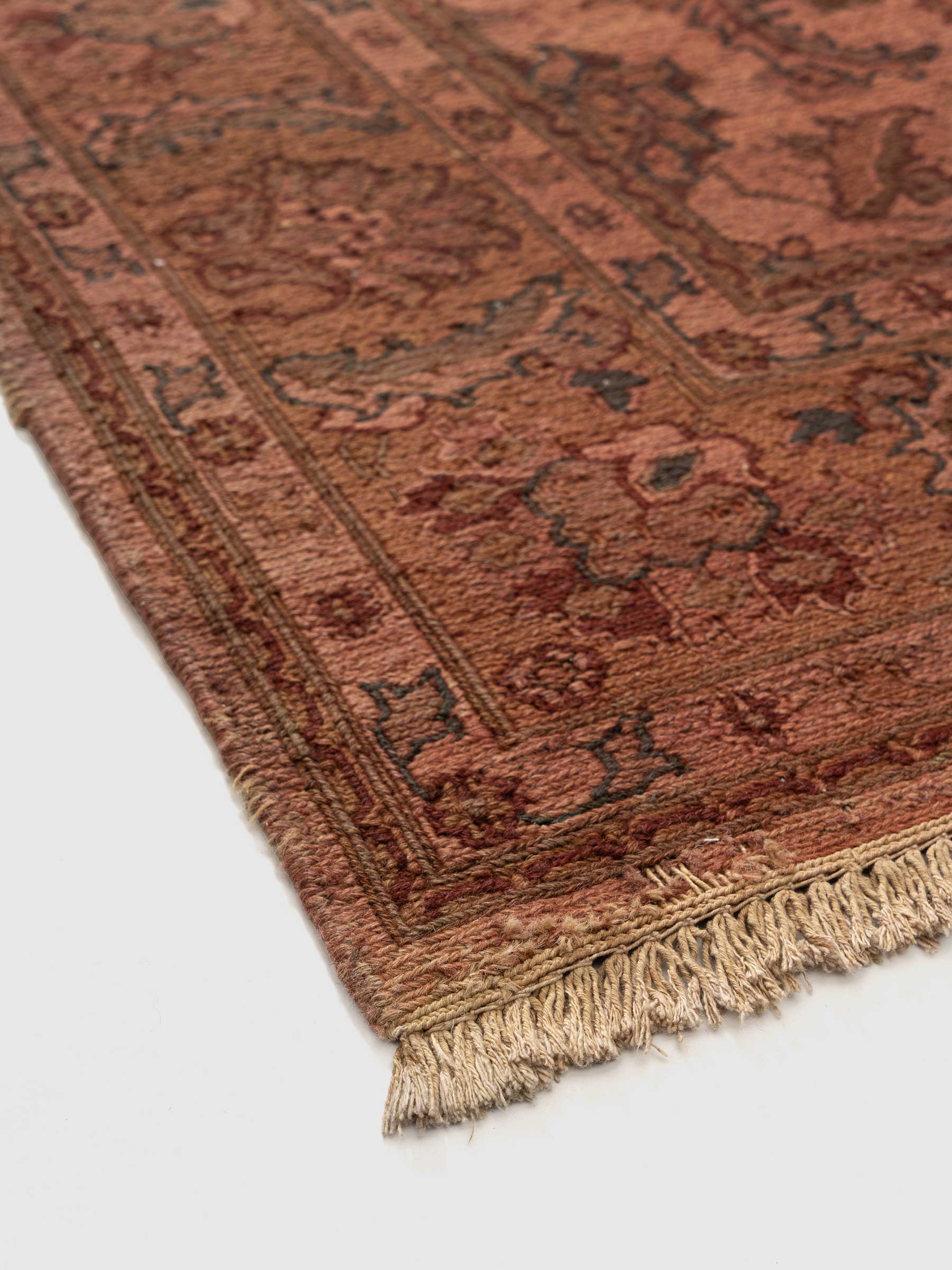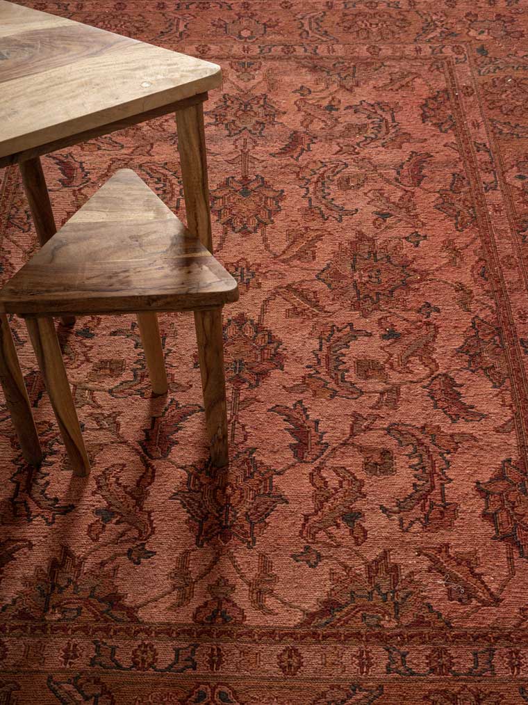 The Mandreta Rug is a testament to traditional craftsmanship, featuring a rich terracotta base ornately patterned with intricate floral and foliate motifs. This rug exudes a lasting elegance that enriches any room with its warm, inviting palette.