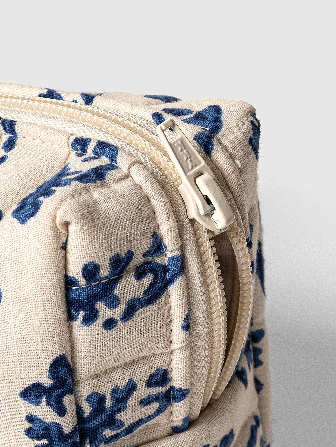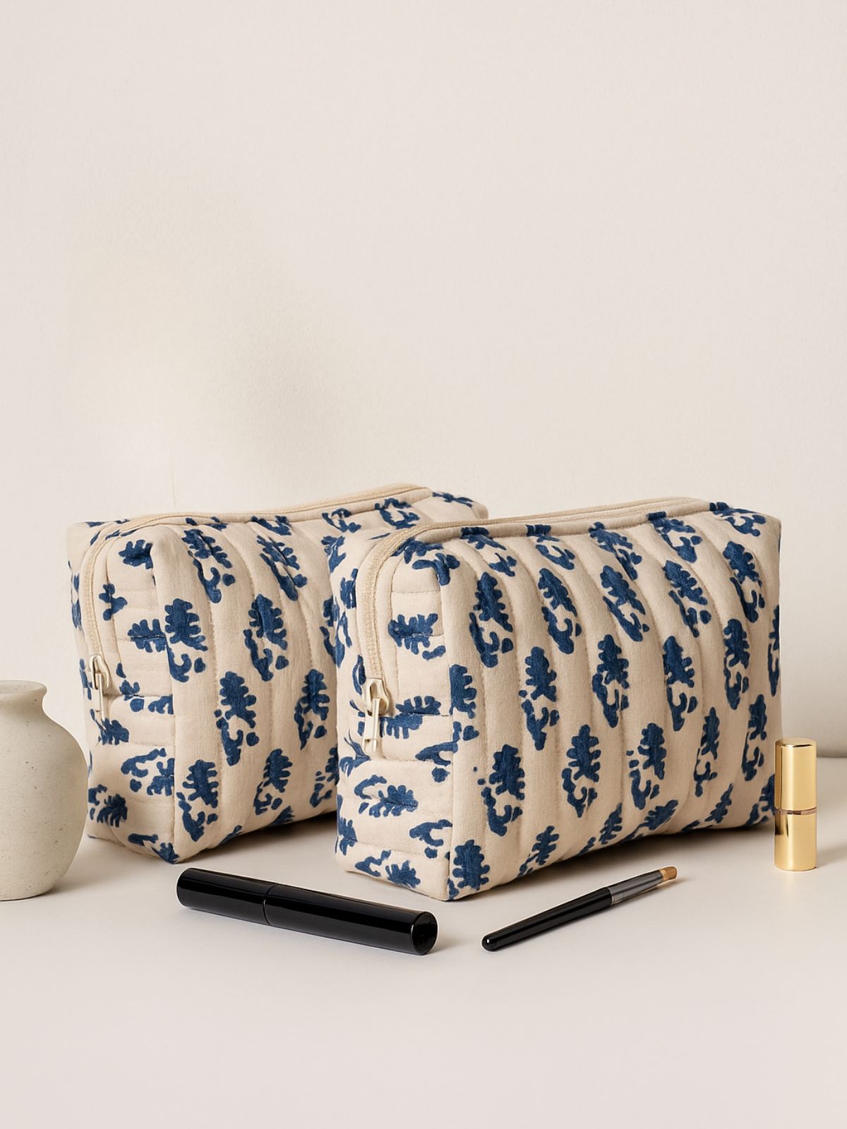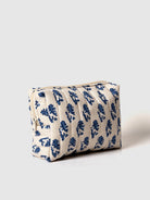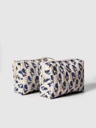 A timeless essential, this set of two quilted pouches is block printed by hand in a calming blue floral pattern. Crafted in India, each pouch is padded for protection and finished with a zip closure and side loop. The two different sizes make it easy to keep your cosmetics, accessories, or travel items neatly organized. Whether for everyday use or gifting, this elegant yet functional set from Contrast Living blends tradition and utility with effortless charm.