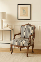 Elegantly crafted with a carved wooden frame, this accent chair blends vintage French charm with tribal-inspired upholstery. The bold monochrome patterns add a contemporary twist to the classic silhouette, making it a striking piece for eclectic or modern interiors. Perfect for adding character to your space, it’s where heritage design meets artistic flair and comfort.